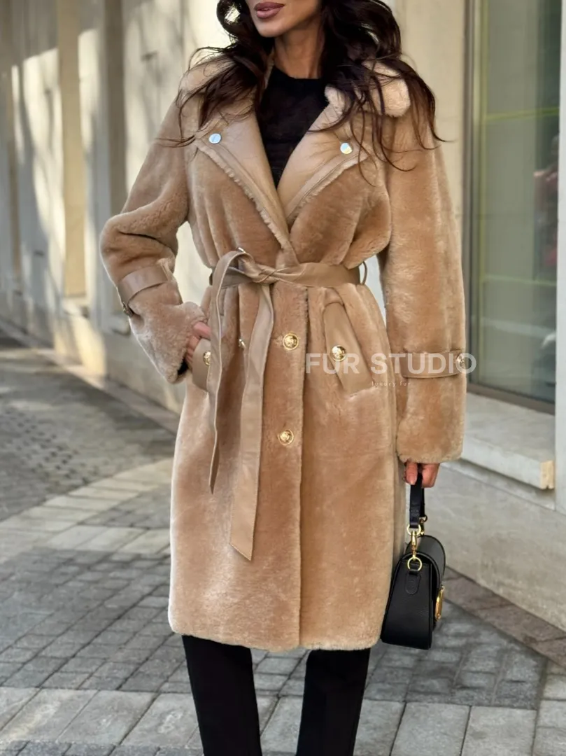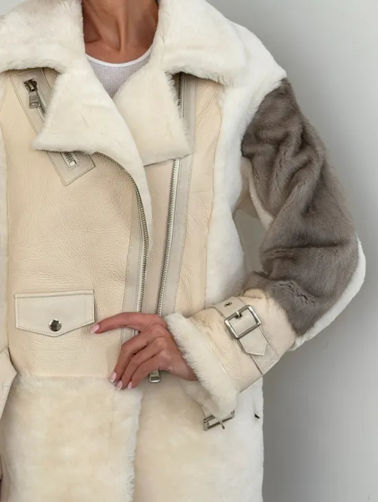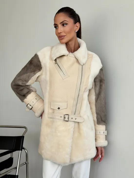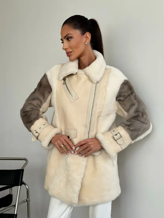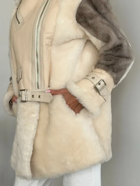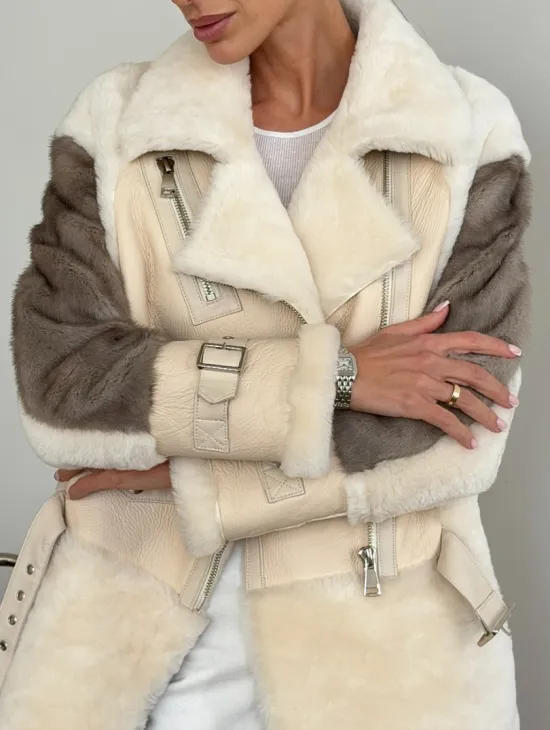 Дубленка из овчины с норковым воротником - цвет бежевый. Модель предлагается в размерах от 42 до 50. Оптимальная длина моделей 95-100 см подчеркивает линии вашей фигуры. Эта дубленка станет неотъемлемой частью гардероба для тех, кто предпочитает роскошь и утонченность натуральной кожи.