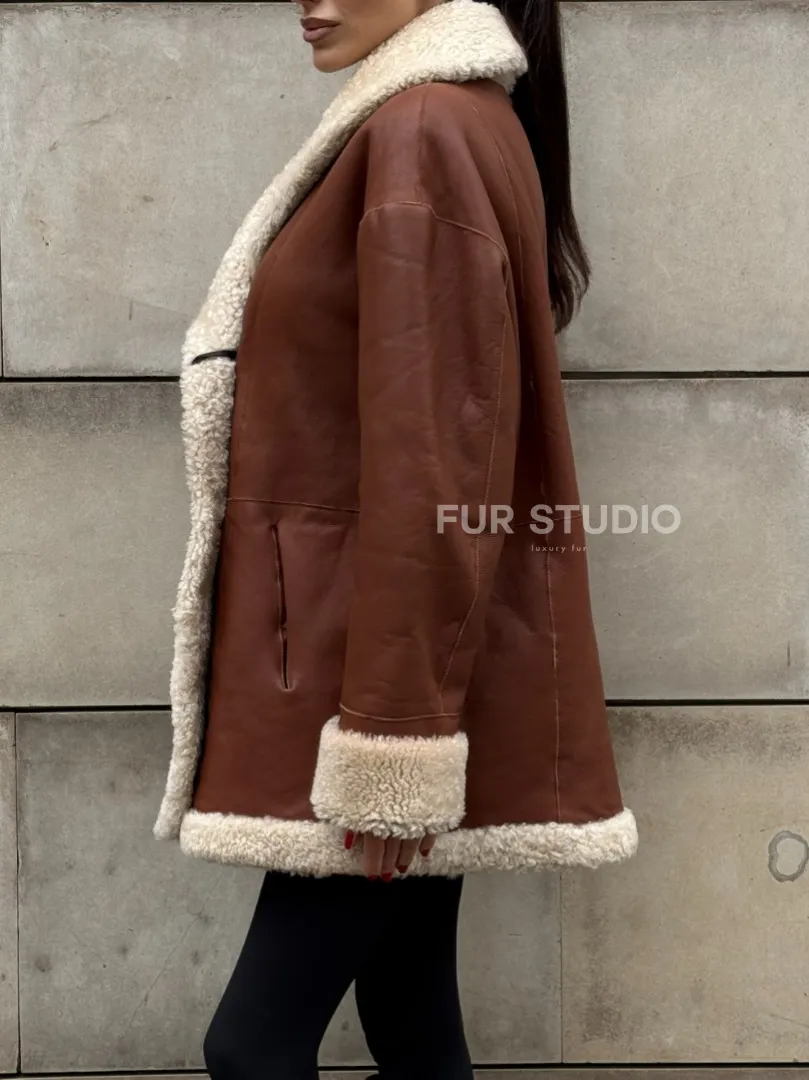 Двусторонняя женская дубленка из натуральной кожи с воротником шаль, на пуговицах. Модель предлагается в размерах от 42 до 54. Оптимальная длина моделей 70-75 см подчеркивает линии вашей фигуры. Эта дубленка станет неотъемлемой частью гардероба для тех, кто предпочитает роскошь и утонченность натуральной кожи.