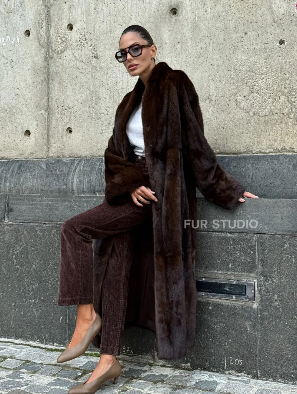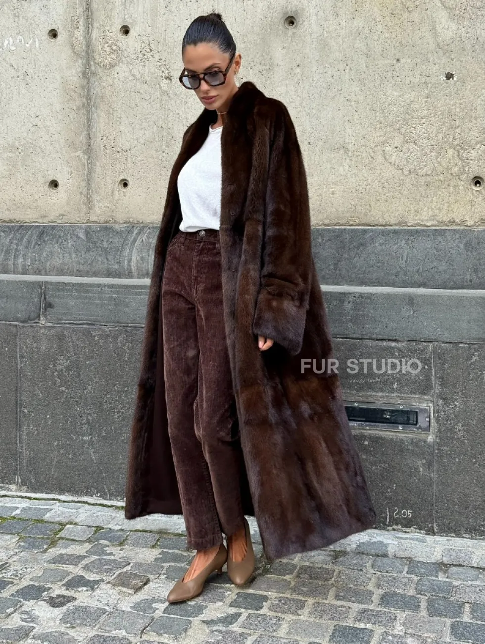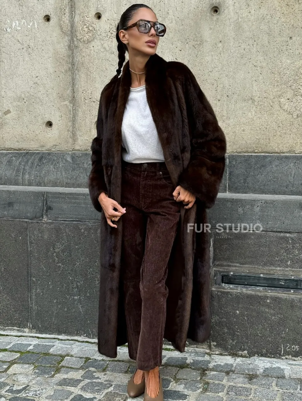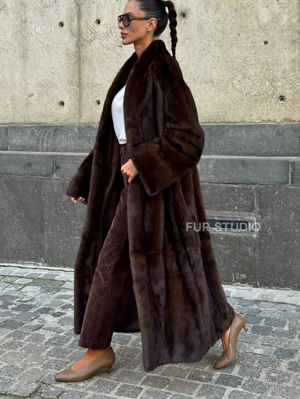 Мех данной шубы аукционная норка, цвет коричневый. Предлагается в размерах от 42 до 48 (инд.пошив от 50 до 64). Длина модели 125-130 см, что выгодно подчеркивает фигуру девушек. Эта модель идеально подойдет для девушек и женщин, предпочитающих роскошные натуральные меха.