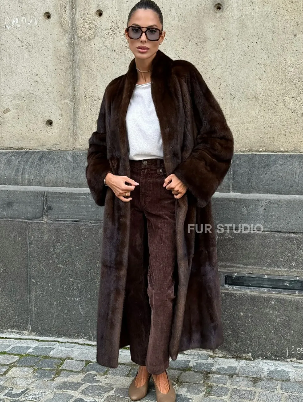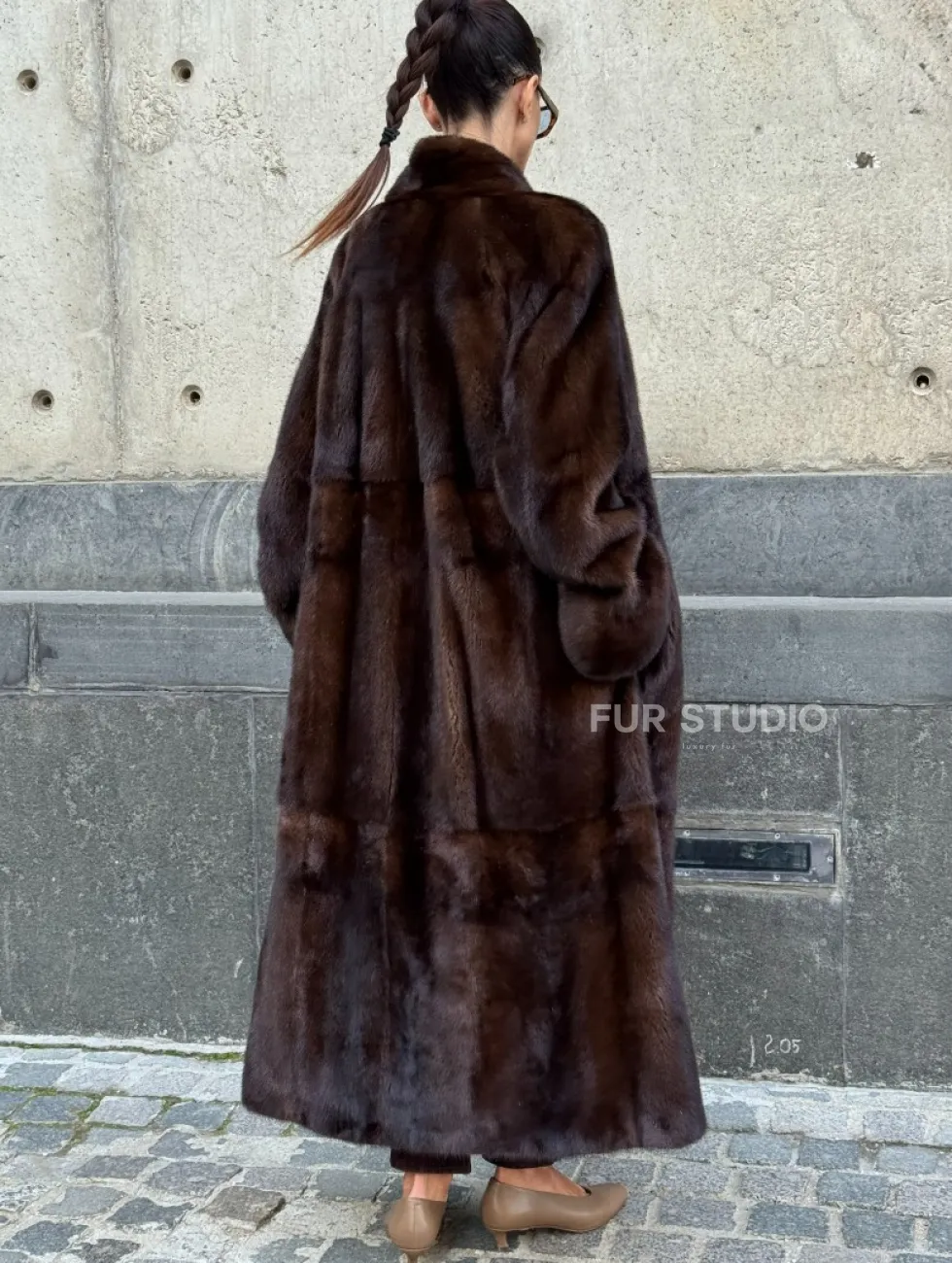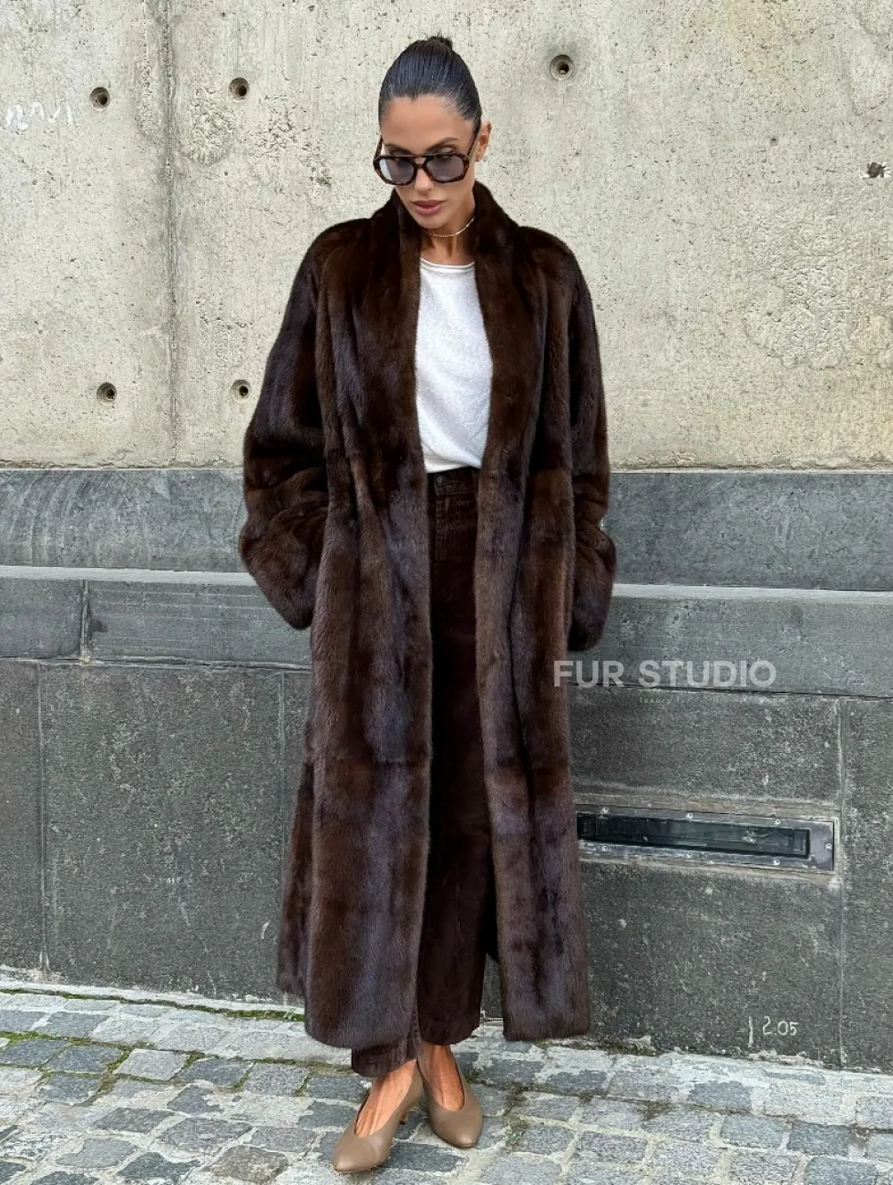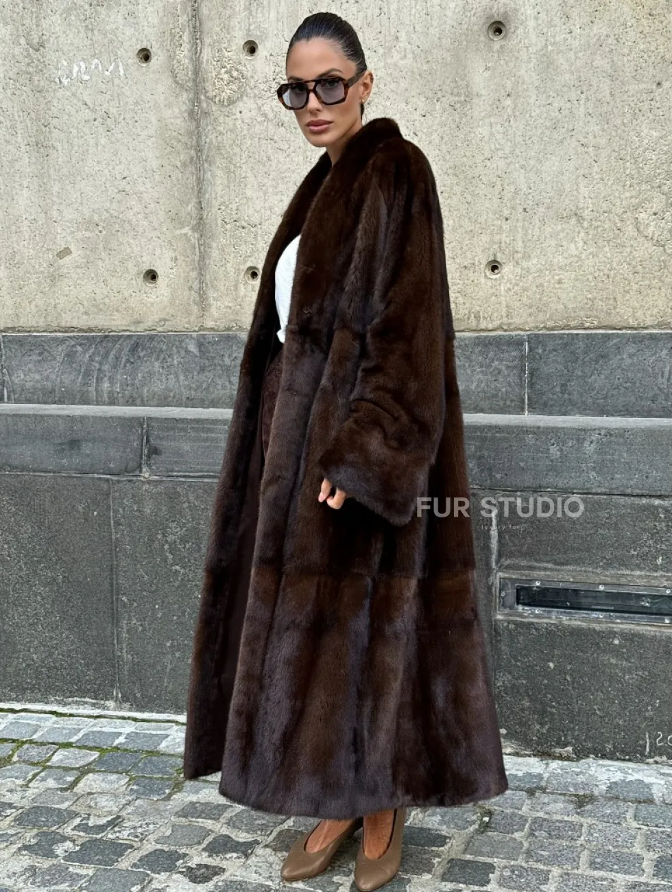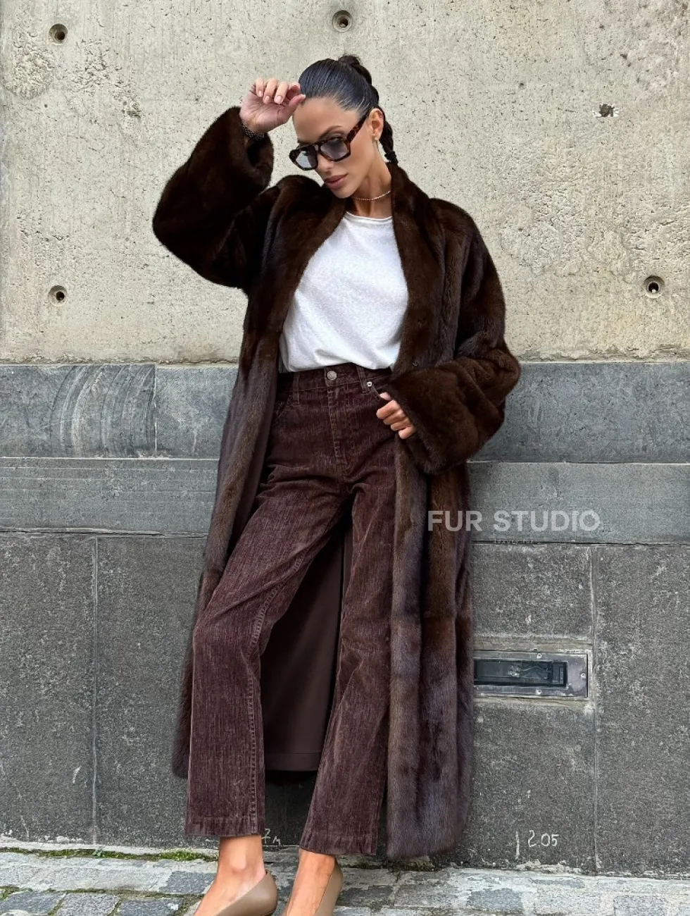 Мех данной шубы аукционная норка, цвет коричневый. Предлагается в размерах от 42 до 48 (инд.пошив от 50 до 64). Длина модели 125-130 см, что выгодно подчеркивает фигуру девушек. Эта модель идеально подойдет для девушек и женщин, предпочитающих роскошные натуральные меха.
