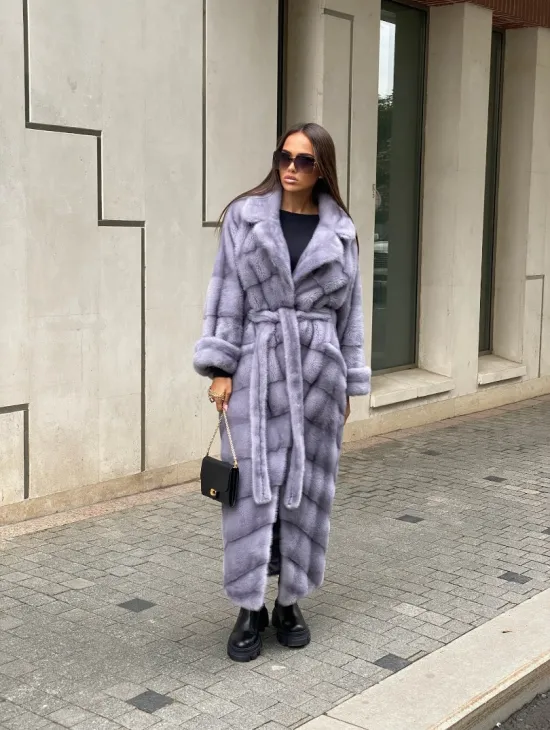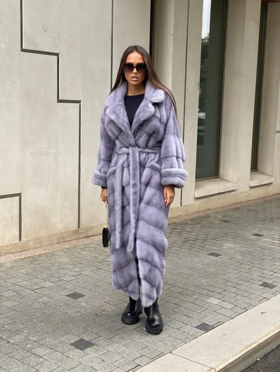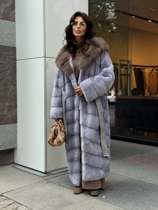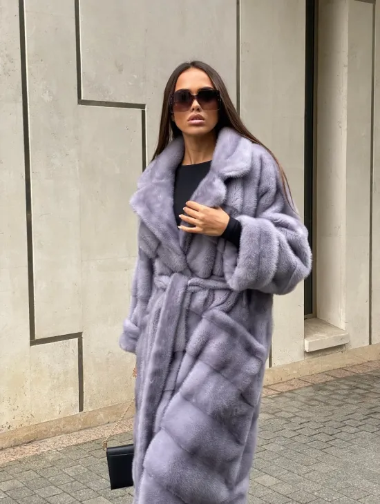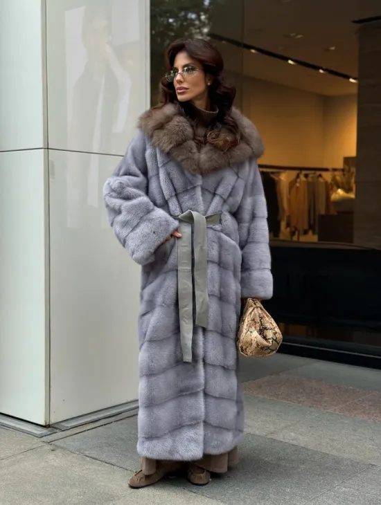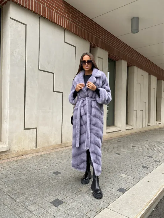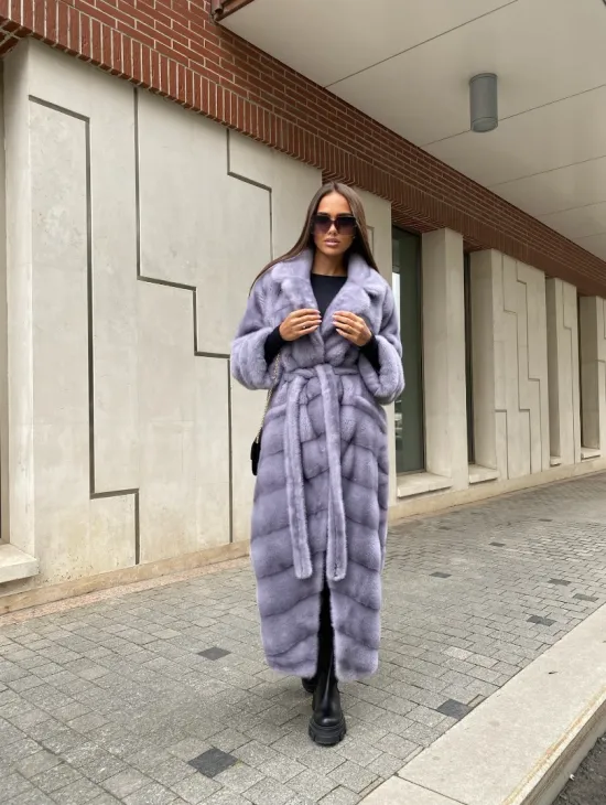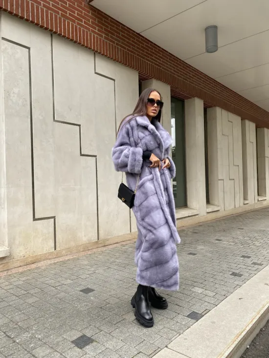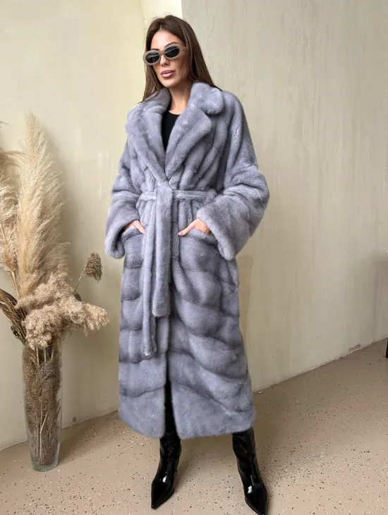 Мех данной шубы аукционная норка, цвет голубой. Предлагается в размерах от 42 до 52 (инд.пошив от 54 до 68). Длина модели 115-120 см, что выгодно подчеркивает фигуру девушек. Эта модель идеально подойдет для девушек и женщин, предпочитающих роскошные натуральные меха.