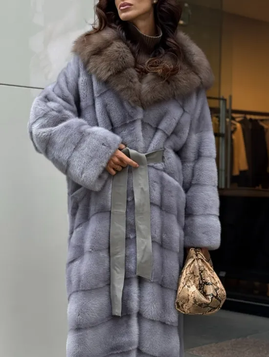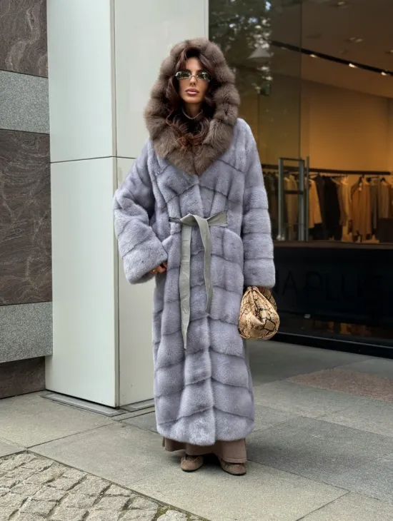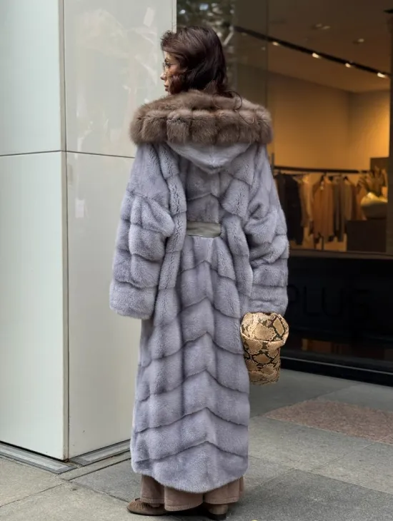 Мех данной шубы аукционная норка, цвет голубой. Предлагается в размерах от 40 до 50 с 52. Длина модели 105-110 см, что выгодно подчеркивает фигуру девушек. Эта модель идеально подойдет для девушек и женщин, предпочитающих роскошные натуральные меха.