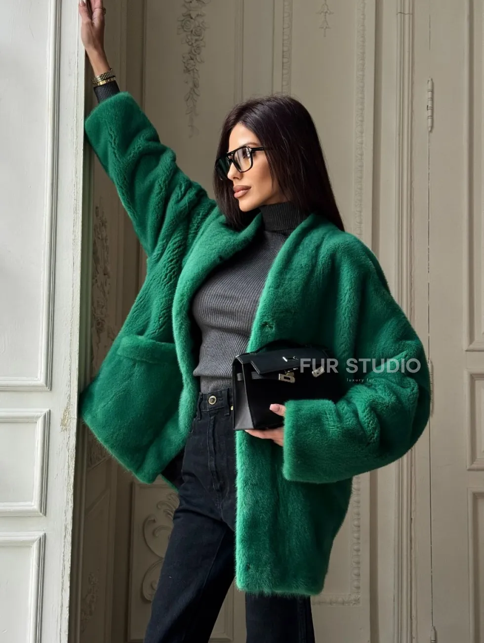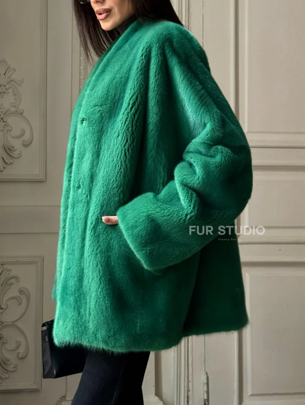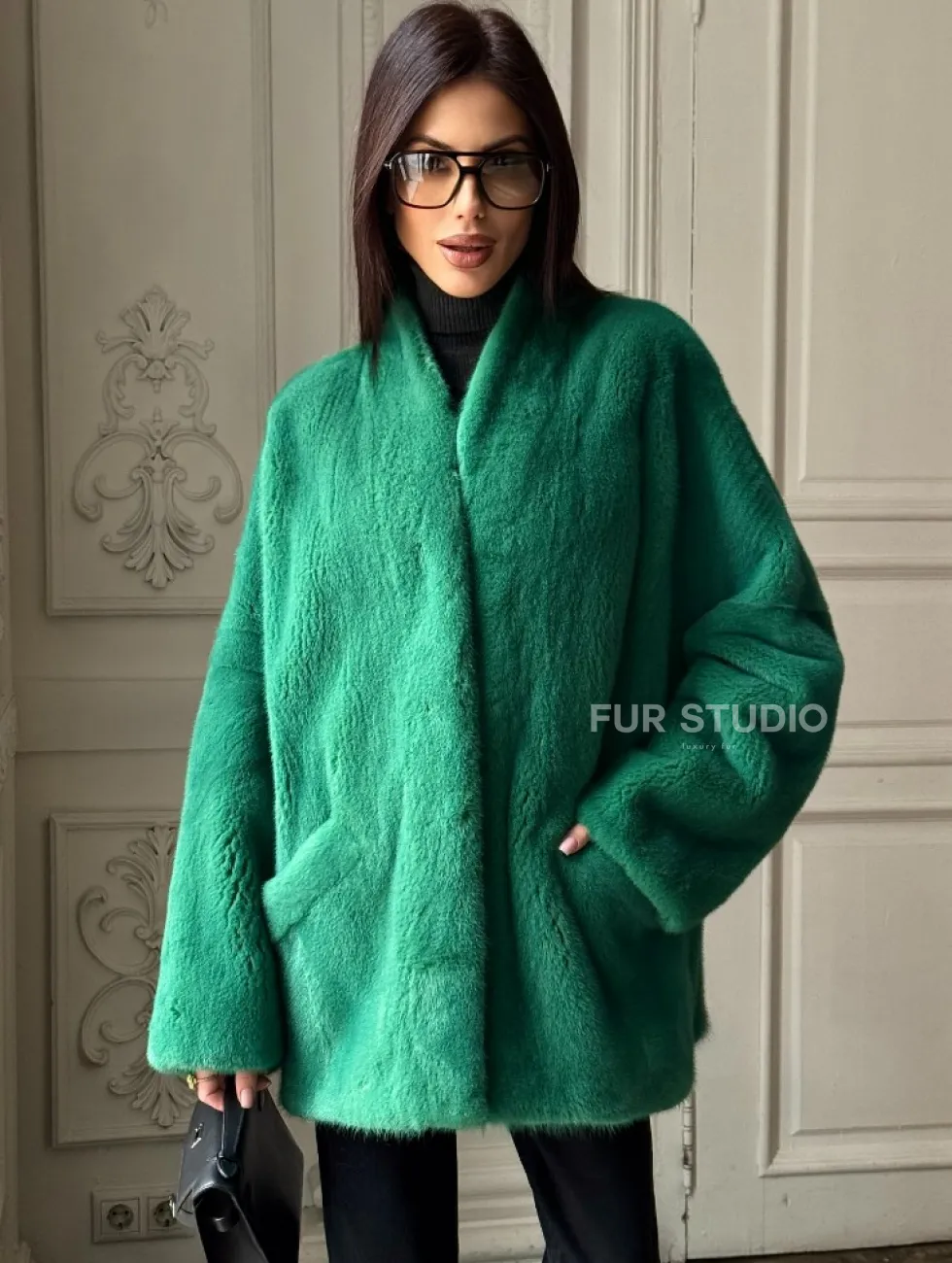 Изумрудный норковый полушубок с V-образным воротником доступна для покупки в нашем шоуруме Furs Studio в Москве. У нас так же есть доставка во все города России. Добавьте немного роскоши в свой гардероб с этой шубой, которая будет служить вам многие годы.