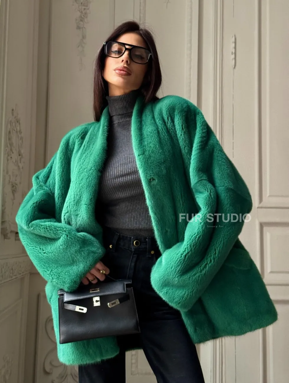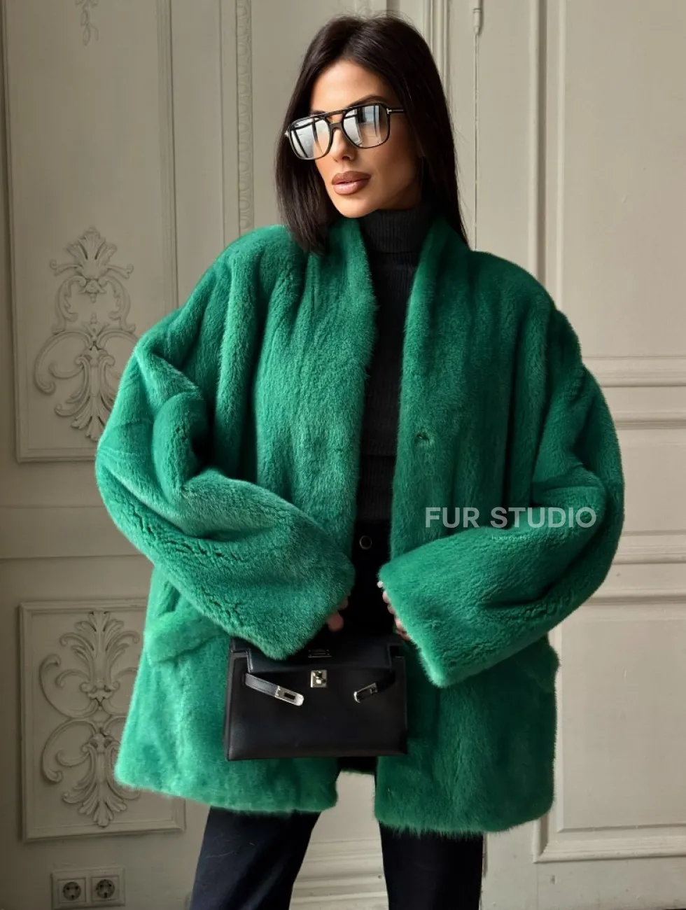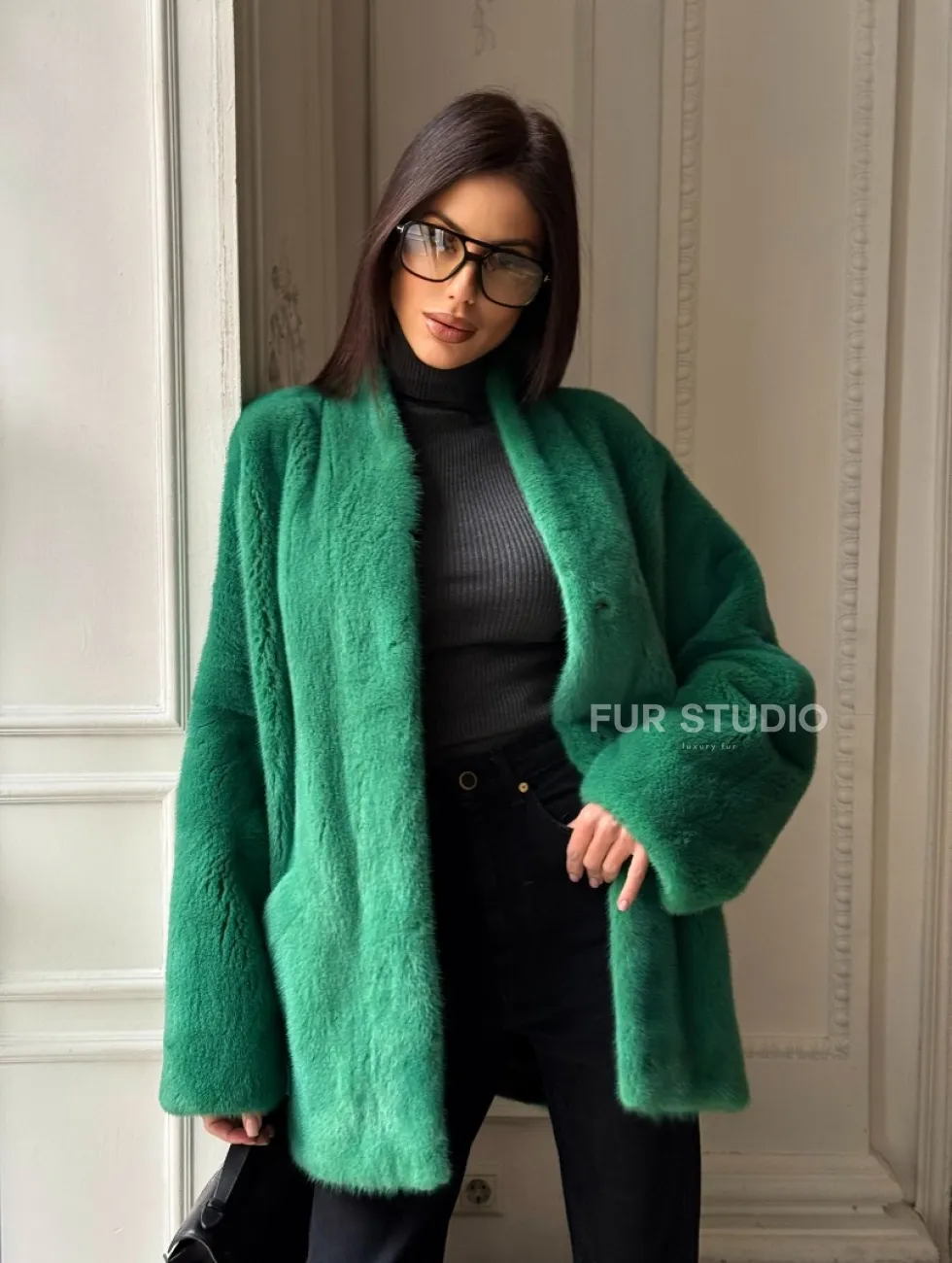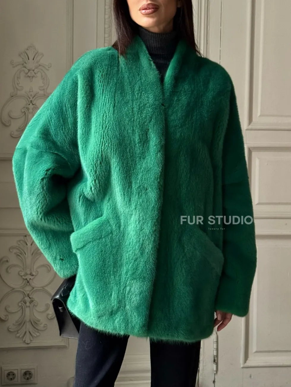 Изумрудный норковый полушубок с V-образным воротником доступна для покупки в нашем шоуруме Furs Studio в Москве. У нас так же есть доставка во все города России. Добавьте немного роскоши в свой гардероб с этой шубой, которая будет служить вам многие годы.