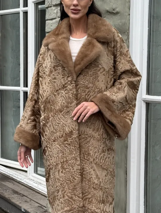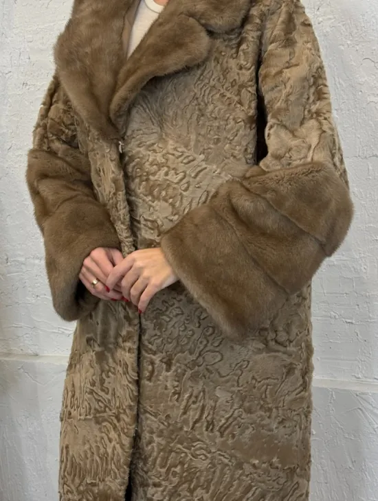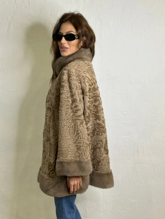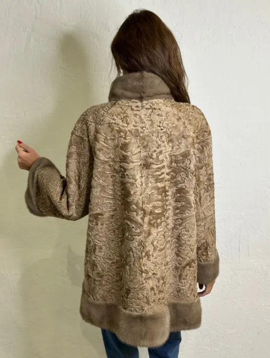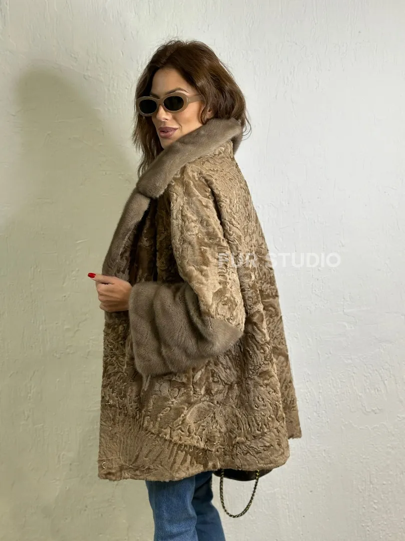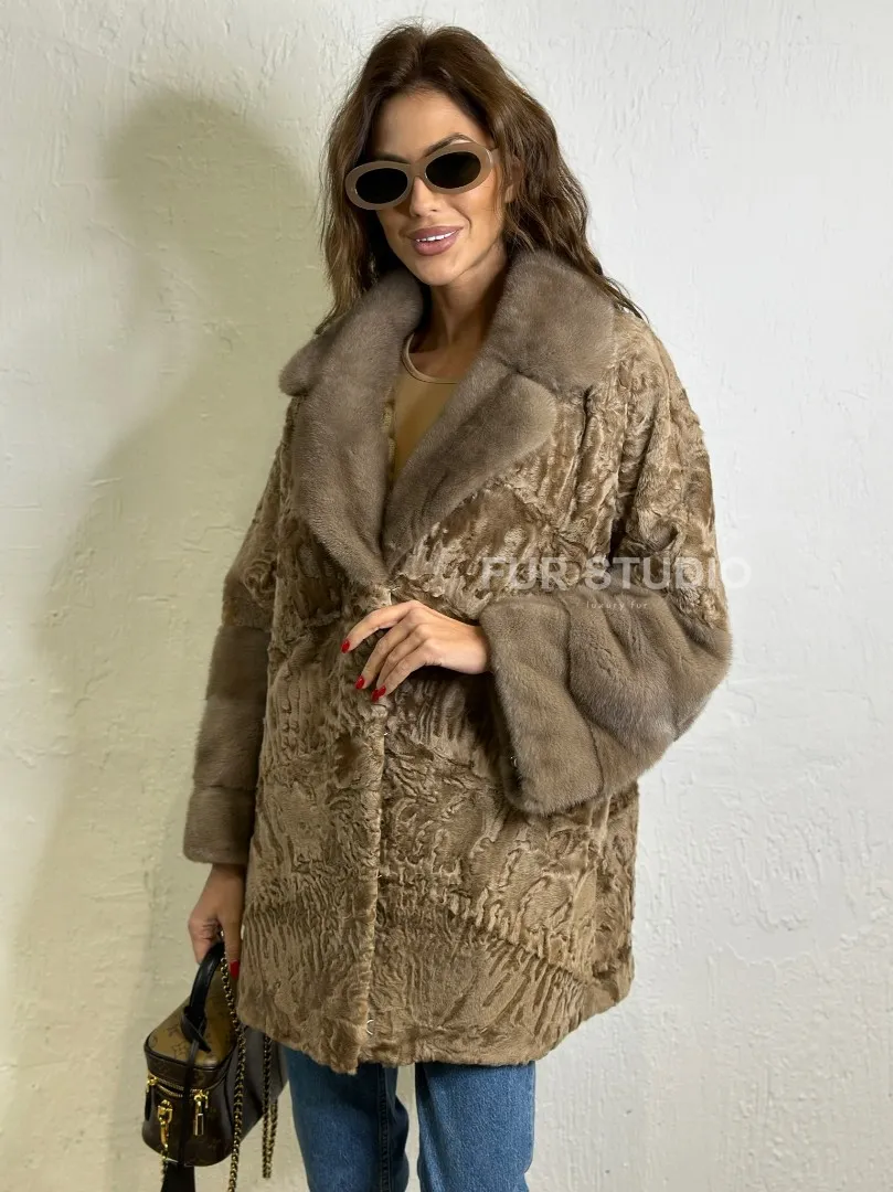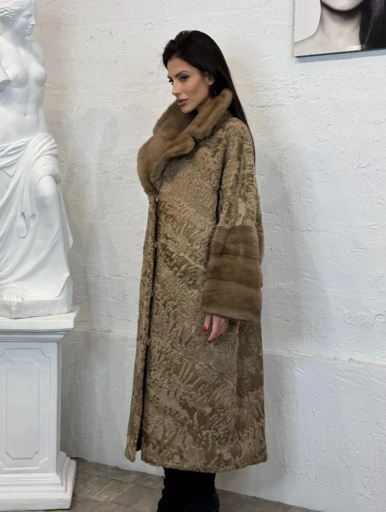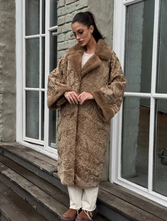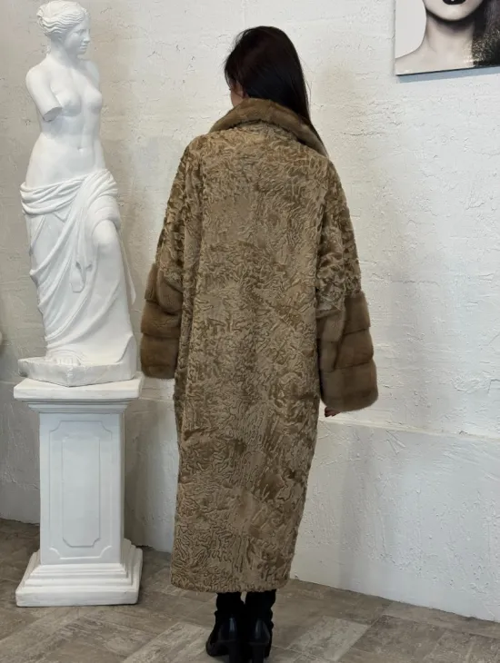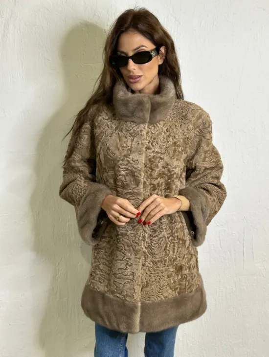 Мех данной шубы каракульча , цвет бежевый. Предлагается в размерах от 44 до 46 с 48. Длина модели 70-75 см, что выгодно подчеркивает фигуру девушек. Эта модель идеально подойдет для девушек и женщин, предпочитающих роскошные натуральные меха.
