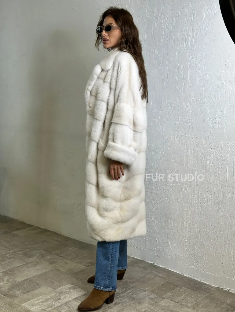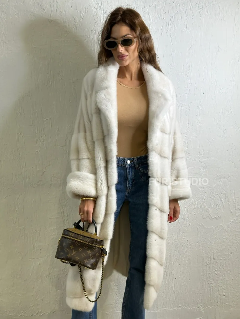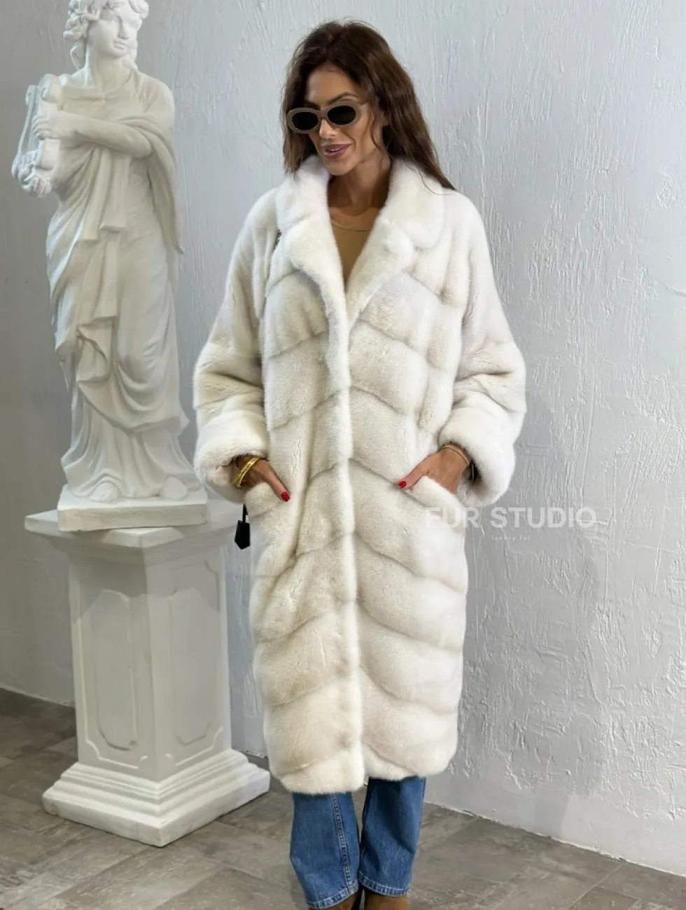 Мех данной шубы аукционная норка, цвет белый. Предлагается в размерах от 40 до 50. Длина модели 105-110 см, что выгодно подчеркивает фигуру девушек. Эта модель идеально подойдет для девушек и женщин, предпочитающих роскошные натуральные меха.