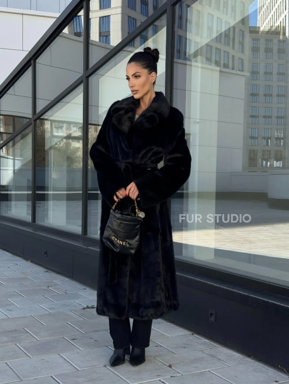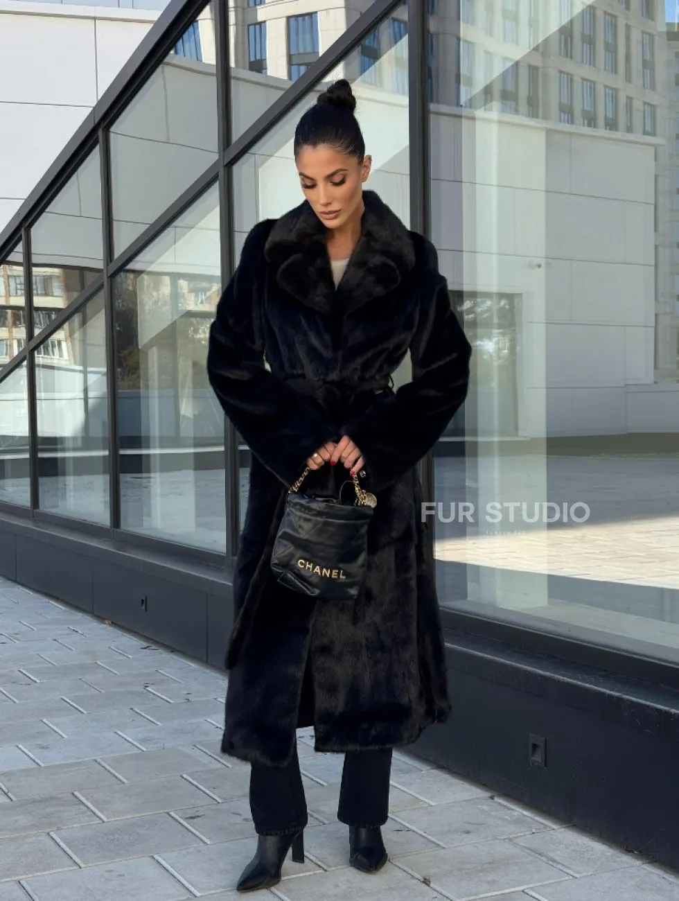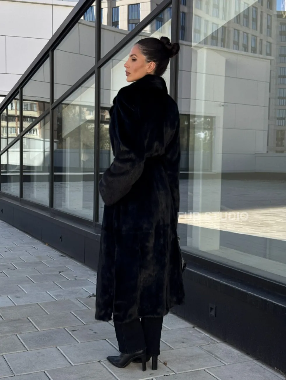 Мех данной шубы аукционная норка , цвет черный. Предлагается в размерах от 42 до 52. Длина модели 115-120 см, что выгодно подчеркивает фигуру девушек. Эта модель идеально подойдет для девушек и женщин, предпочитающих роскошные натуральные меха.