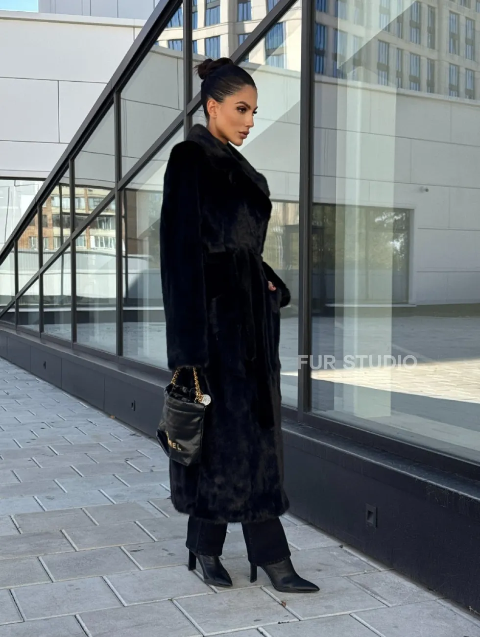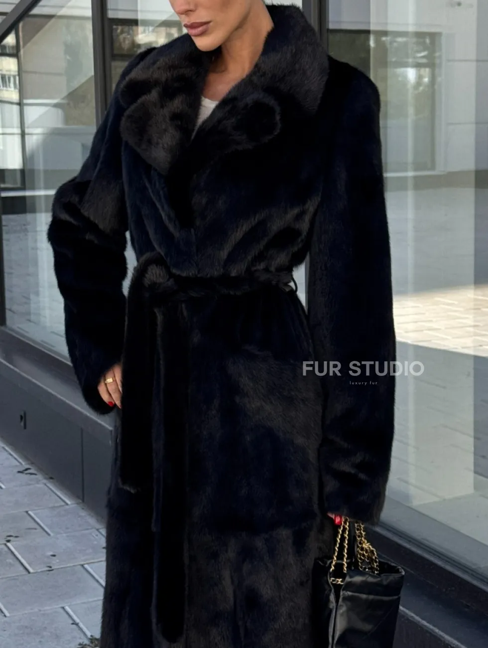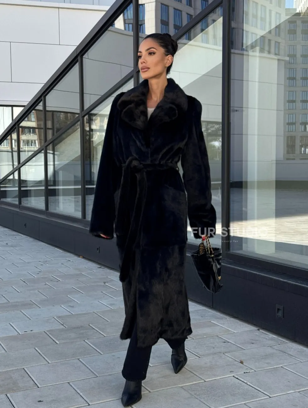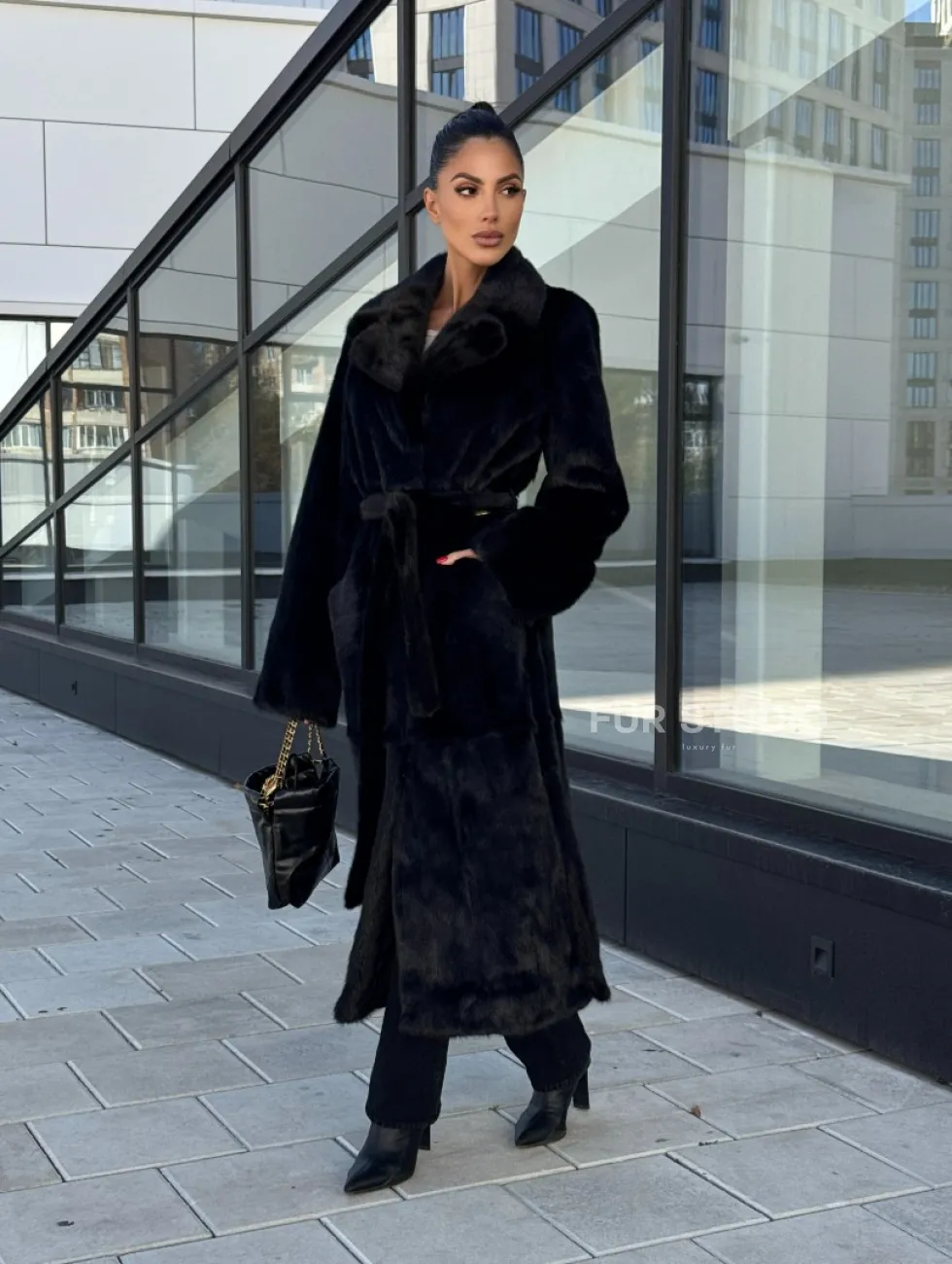 Мех данной шубы аукционная норка , цвет черный. Предлагается в размерах от 42 до 52. Длина модели 115-120 см, что выгодно подчеркивает фигуру девушек. Эта модель идеально подойдет для девушек и женщин, предпочитающих роскошные натуральные меха.