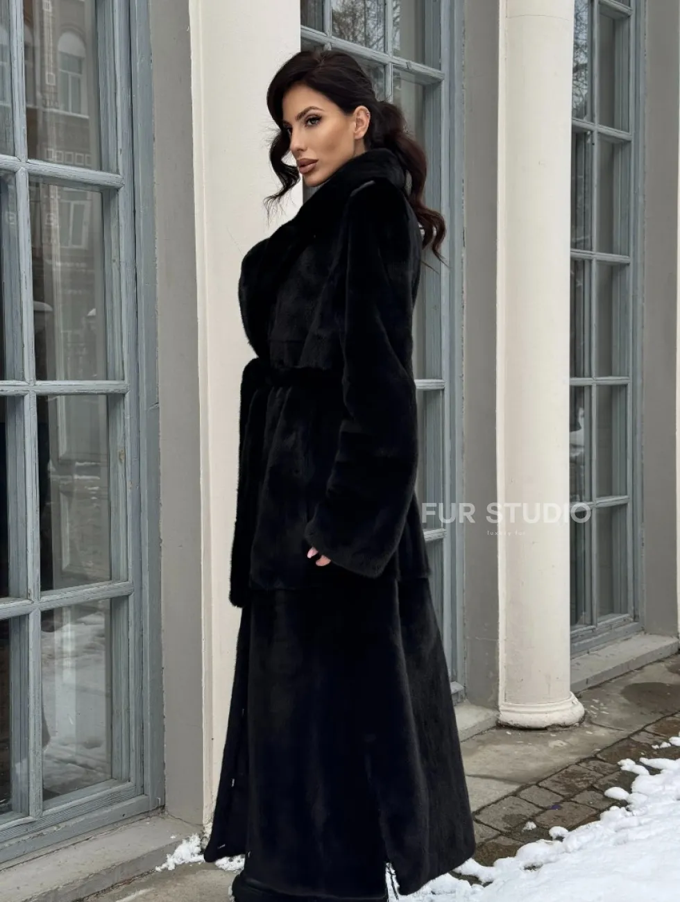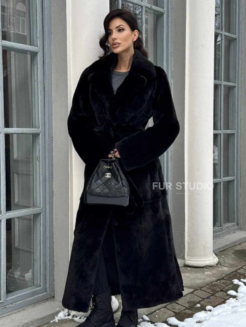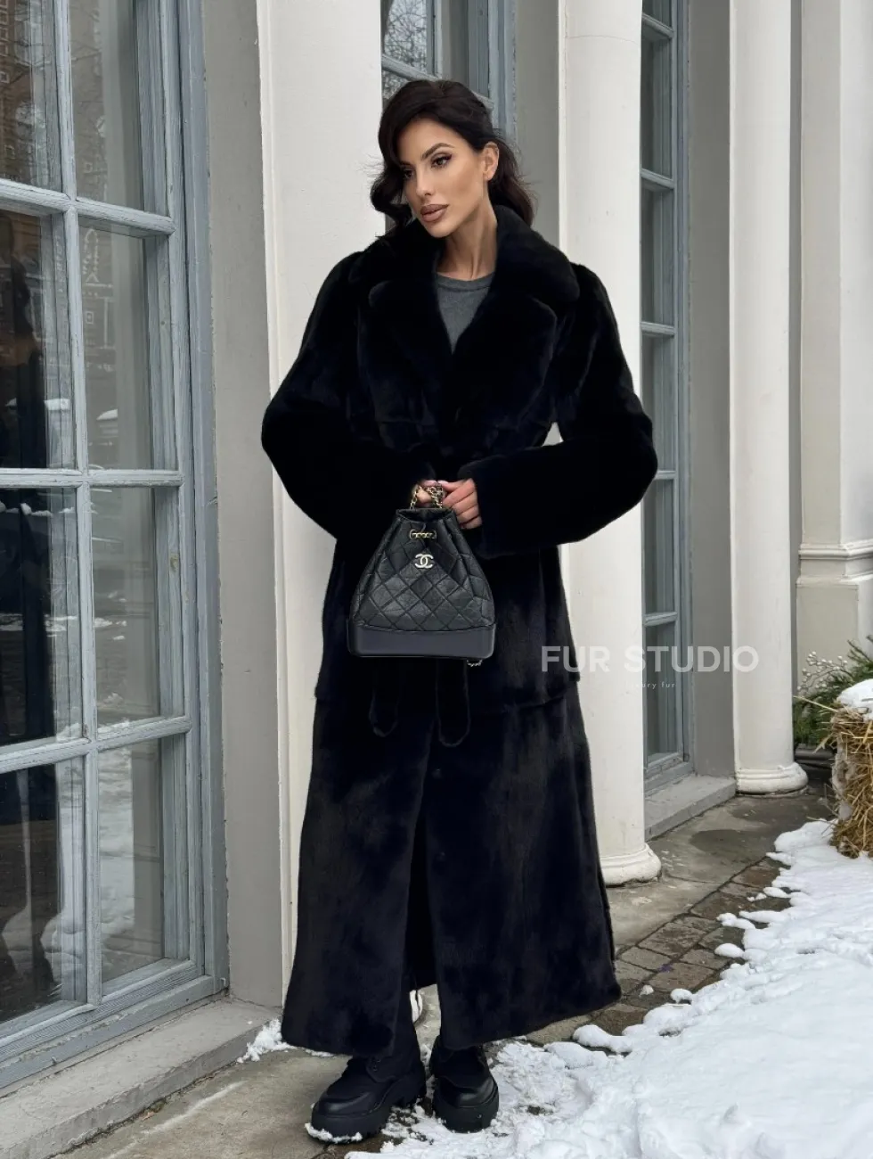 Мех данной шубы норка Blackglama , цвет черный. Предлагается в размерах от 40 до 52. Длина модели 125-130 см, что выгодно подчеркивает фигуру девушек. Эта модель идеально подойдет для девушек и женщин, предпочитающих роскошные натуральные меха.