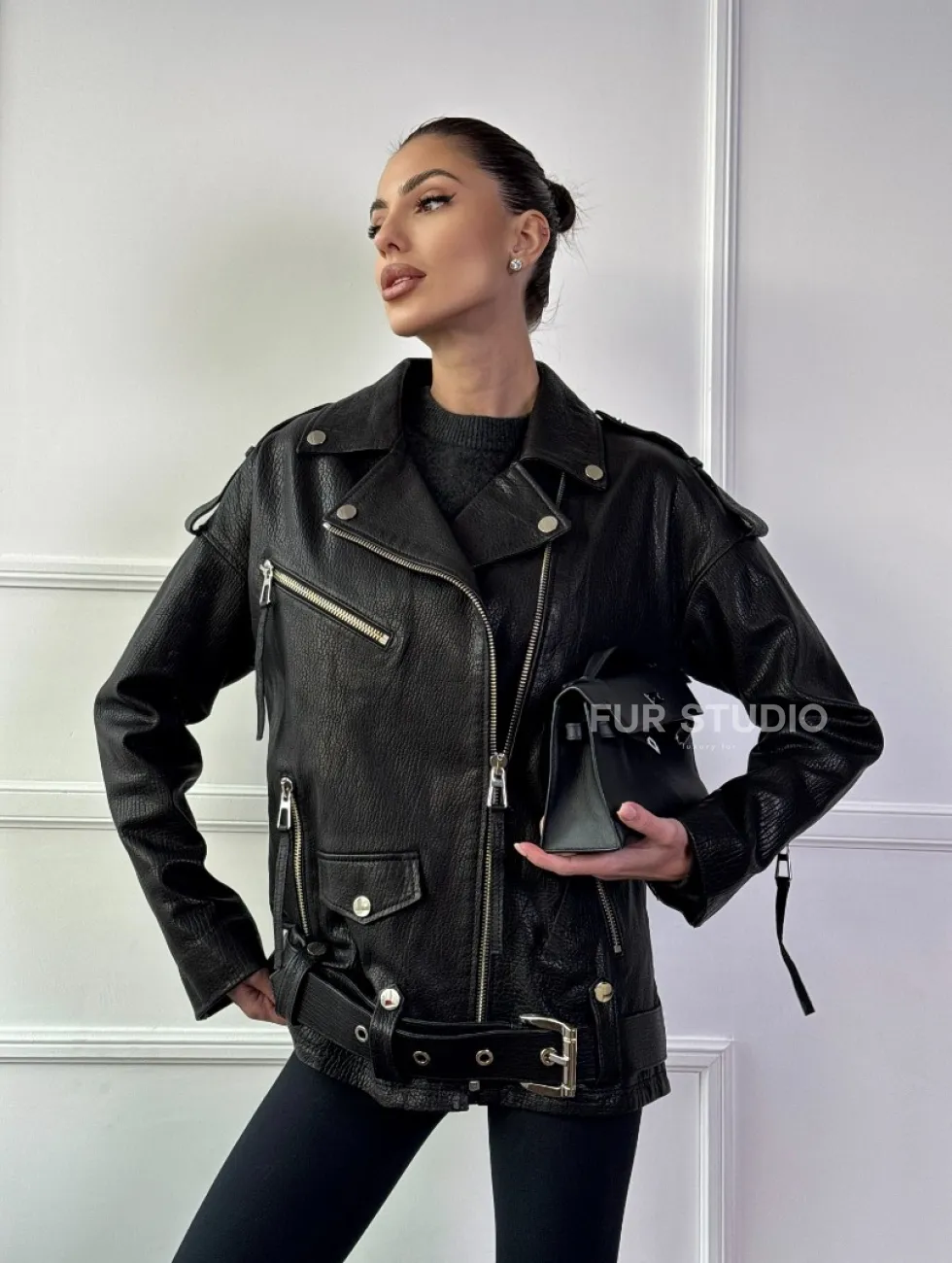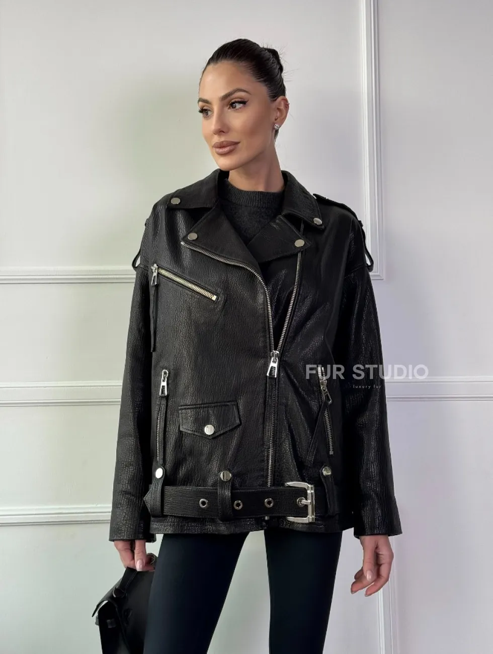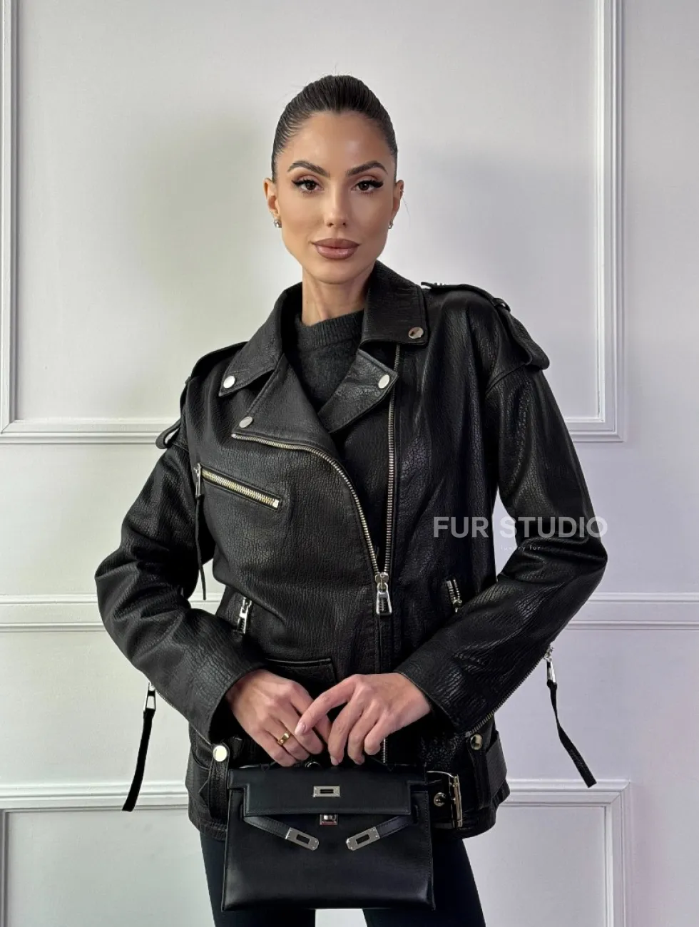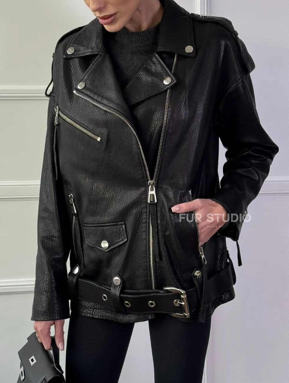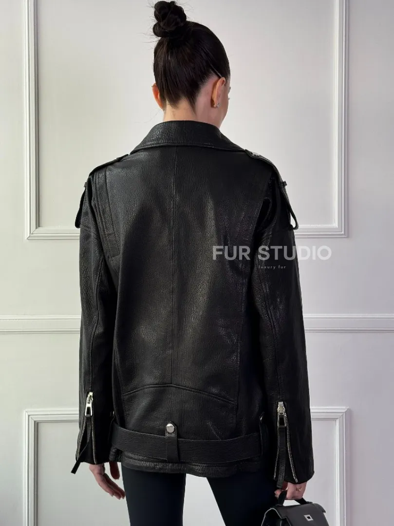 Классическая женская байкерская куртка - косуха из натуральной черной кожи Jumbo доступна для покупки в нашем шоуруме Furs Studio в Москве, где также предоставляется удобная доставка во все города России.