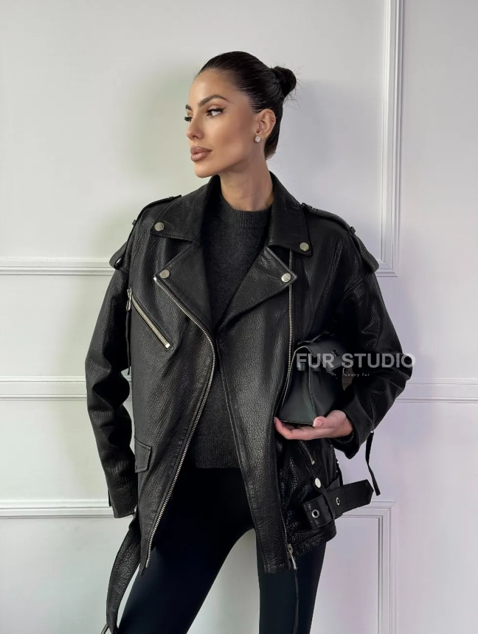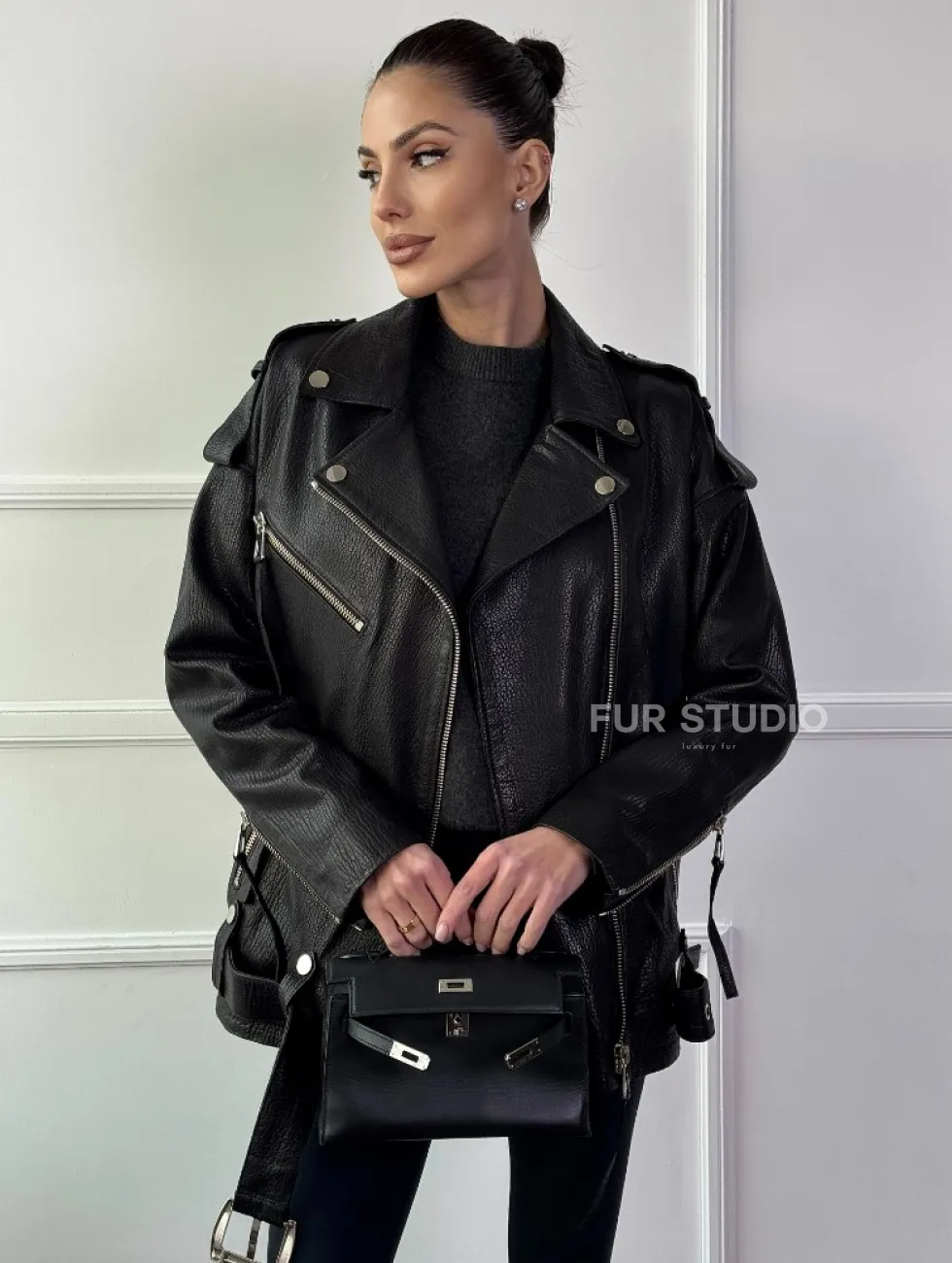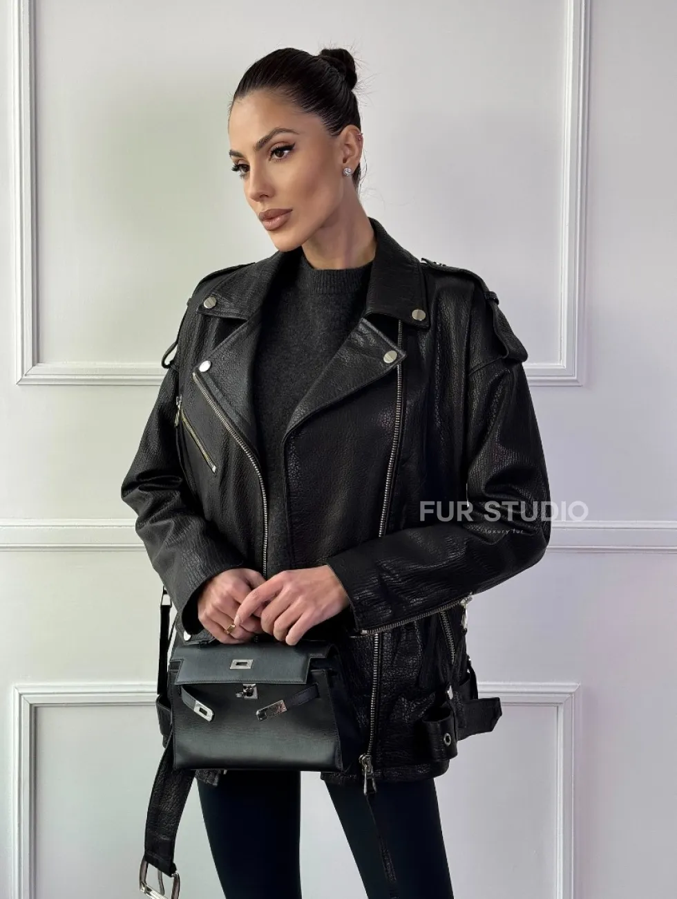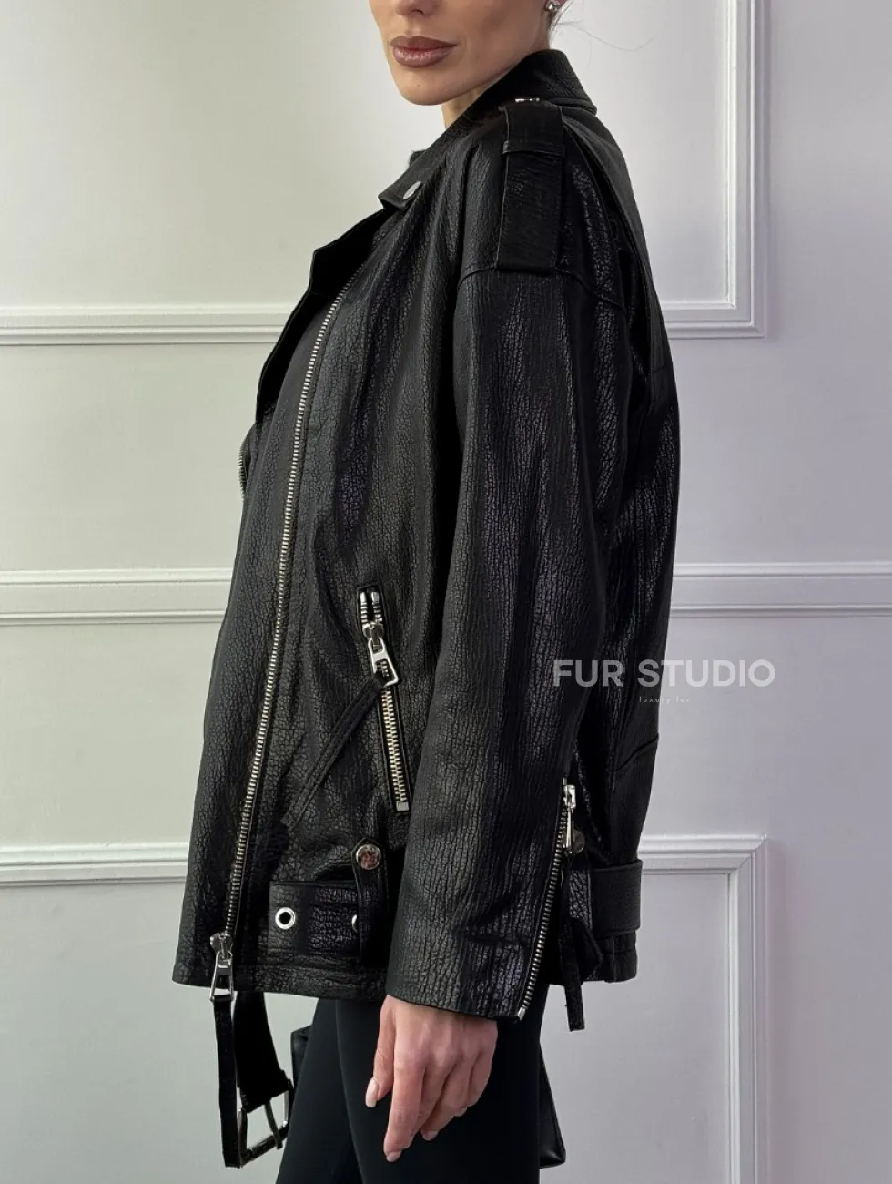 Классическая женская байкерская куртка - косуха из натуральной черной кожи Jumbo доступна для покупки в нашем шоуруме Furs Studio в Москве, где также предоставляется удобная доставка во все города России.