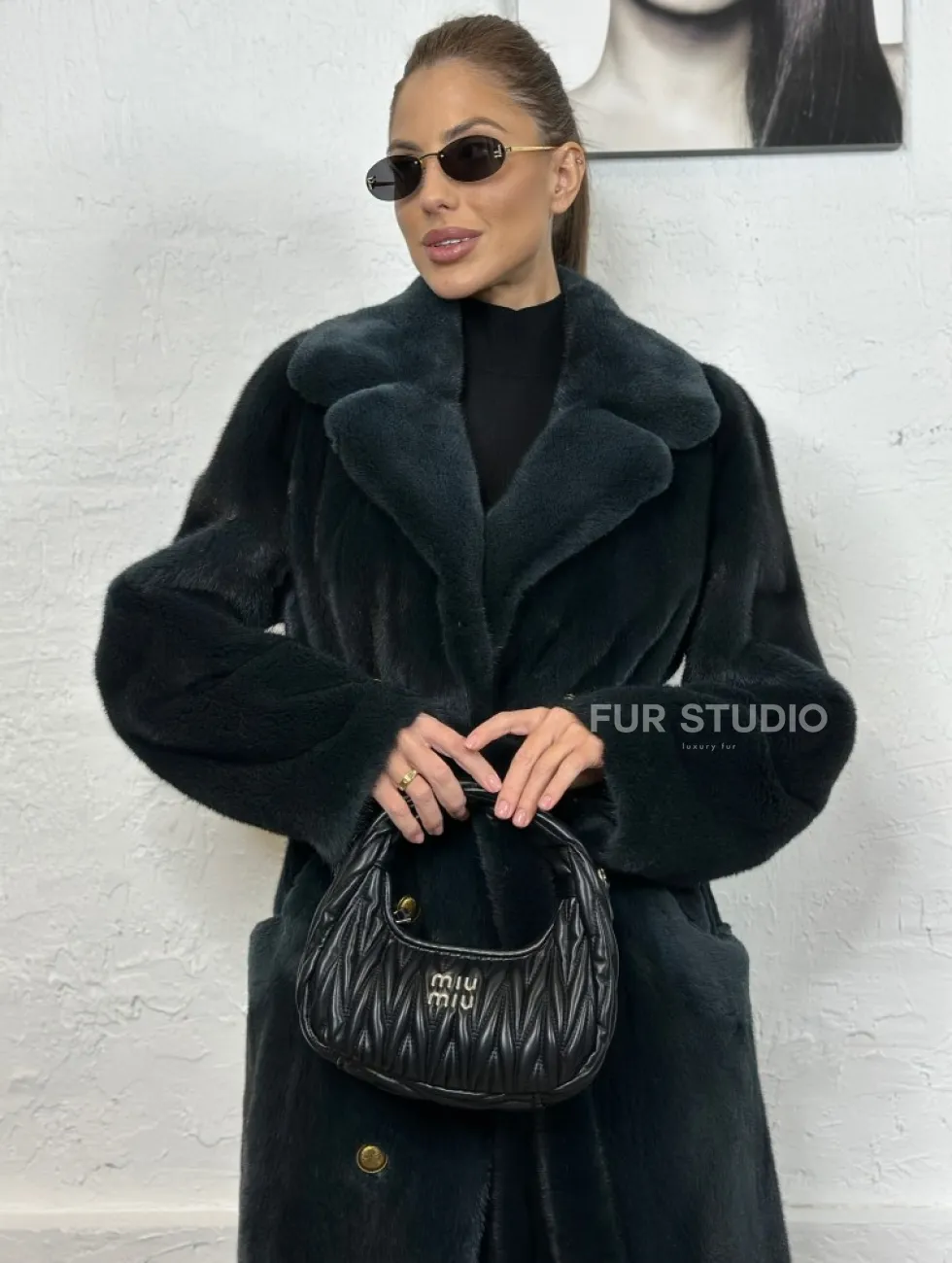 Мех данной шубы аукционная норка, цвет зеленый. Предлагается в размерах от 40 до 54. Длина модели 115-120 см, что выгодно подчеркивает фигуру девушек. Эта модель идеально подойдет для девушек и женщин, предпочитающих роскошные натуральные меха.