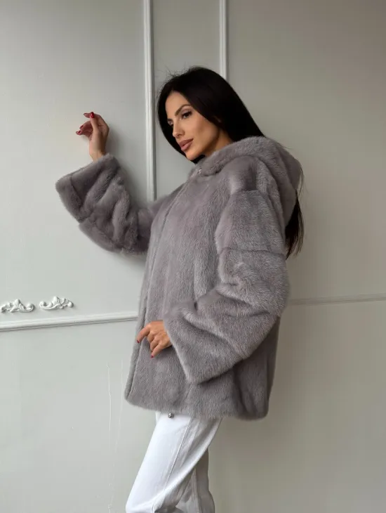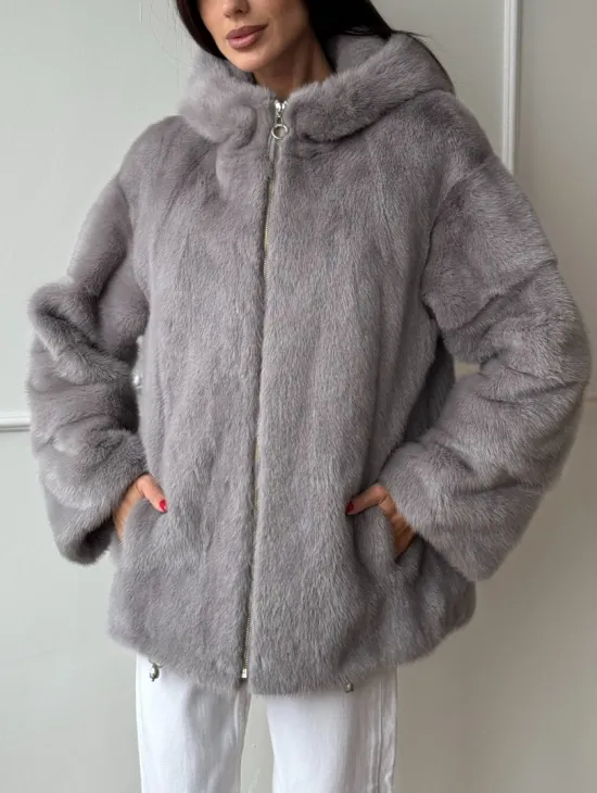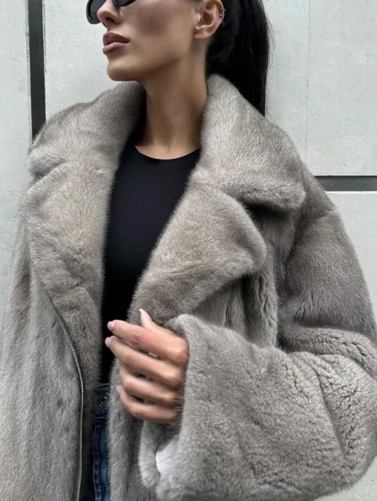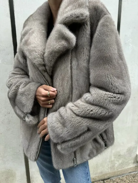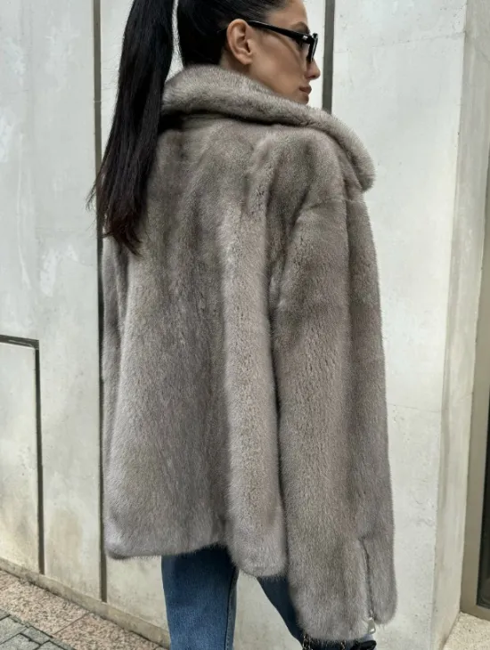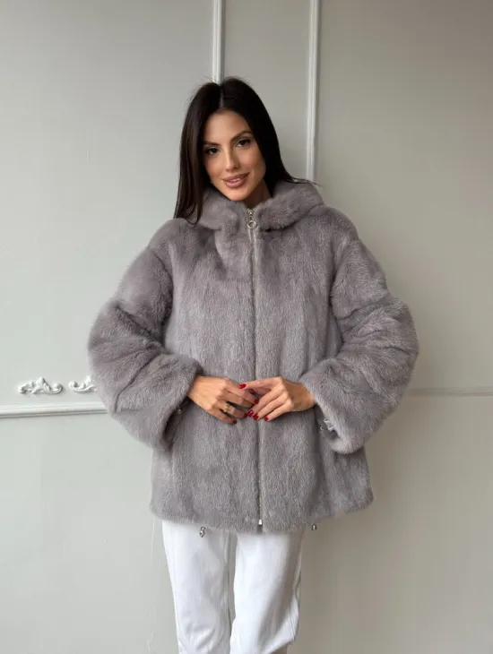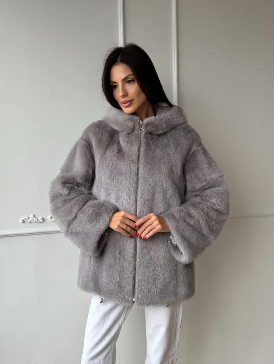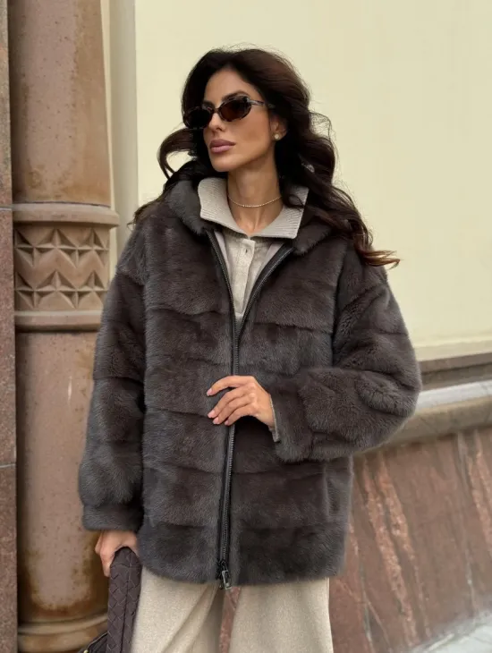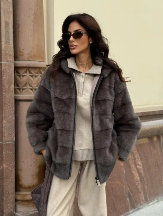 Материал выбранной модели — аукционная норка, доступна в цвете серый . Куртка предлагается в разнообразии размеров, от S до XL, а ее длина составляет 60-65 см, что выигрышно подчеркивает вашу фигуру. Этот вариант идеально подходит для тех, кто ценит роскошь и утонченность натуральных материалов.
