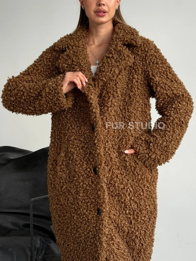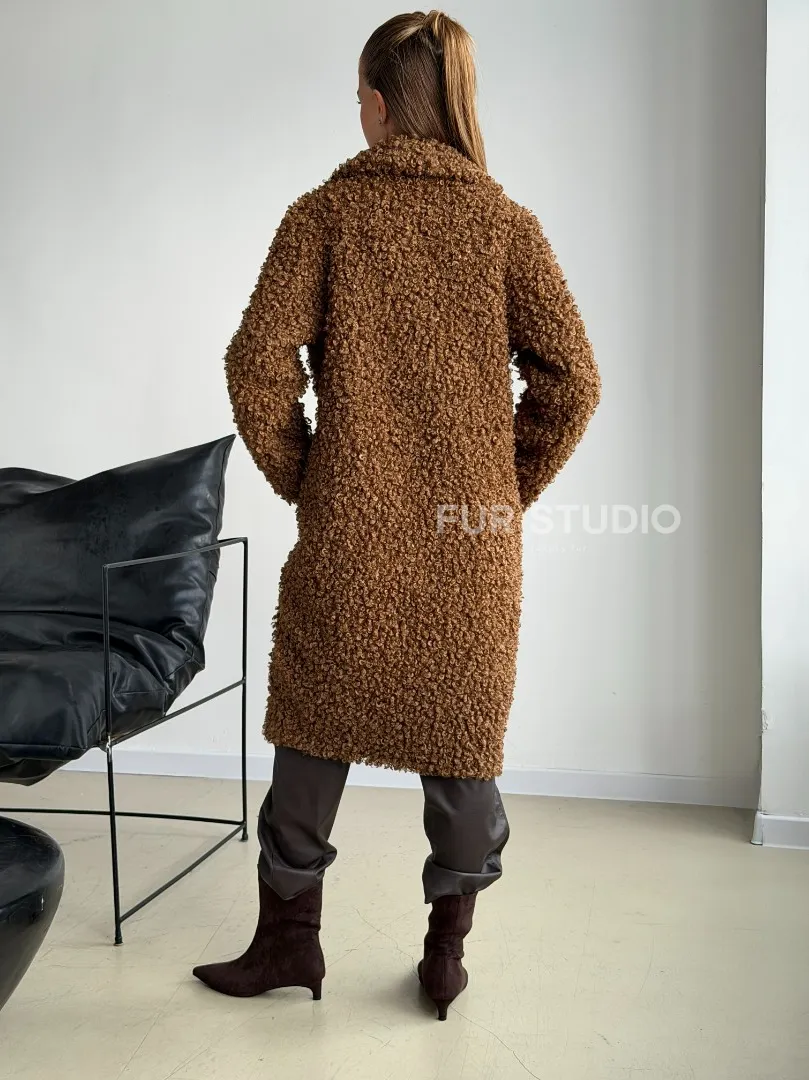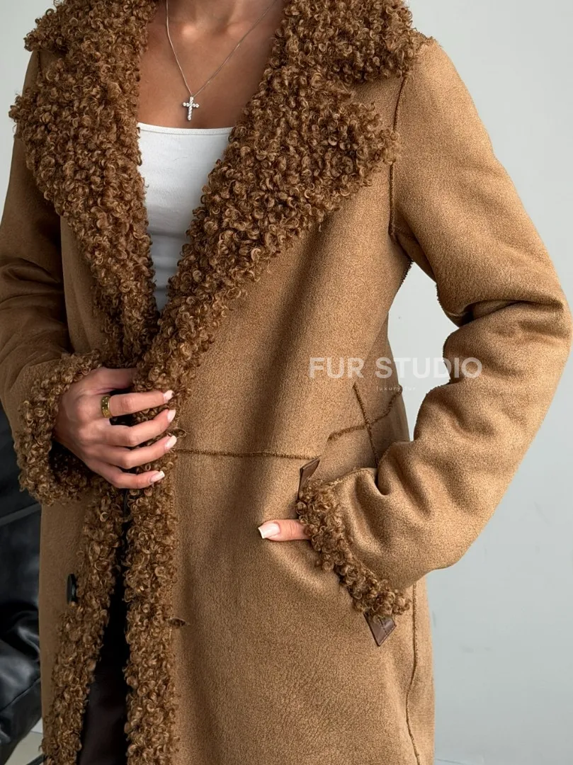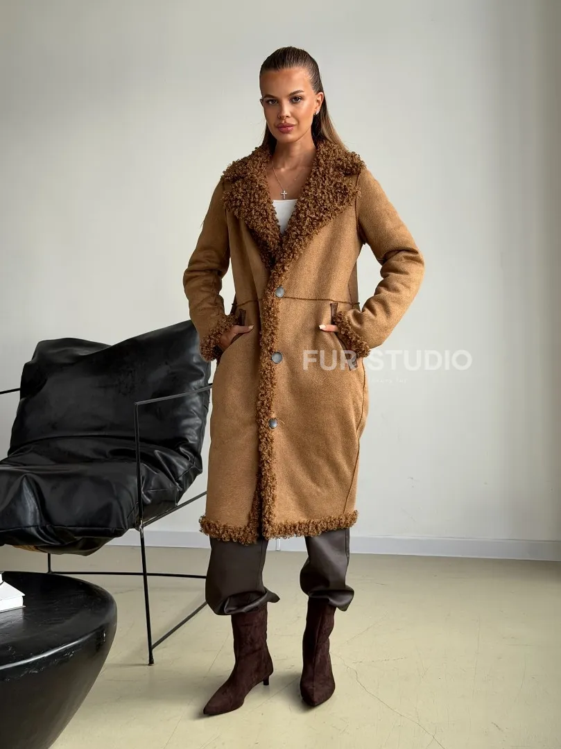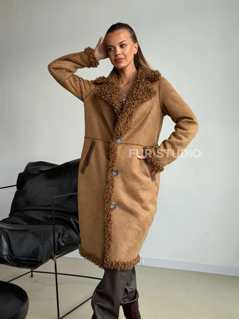 Коричневая двухсторонняя дубленка из экомеха. Модель предлагается в размерах от 42 до 44. Оптимальная длина моделей 95-100 см подчеркивает линии вашей фигуры. Эта дубленка станет неотъемлемой частью гардероба для тех, кто предпочитает роскошь и утонченность натуральной кожи.
