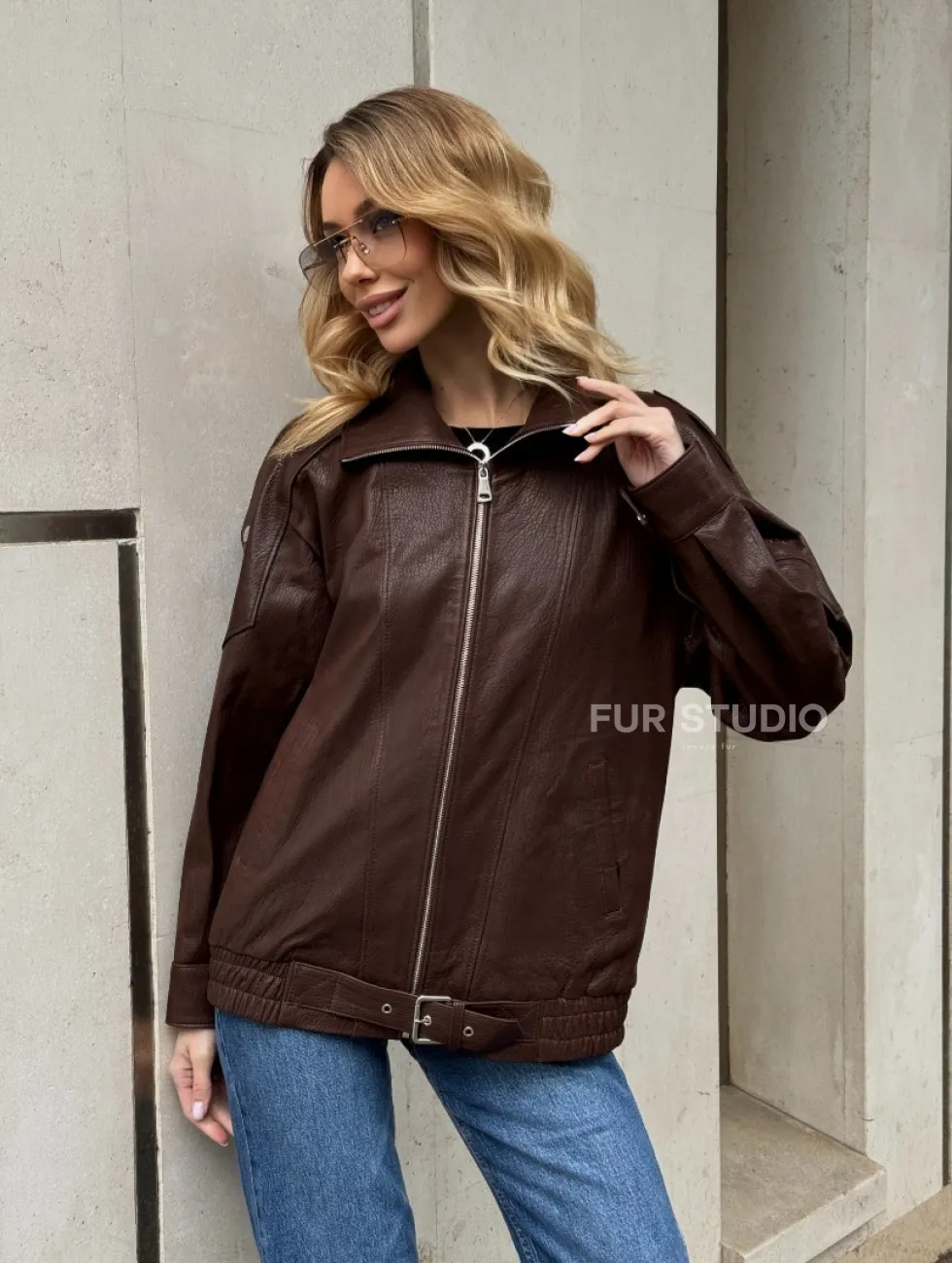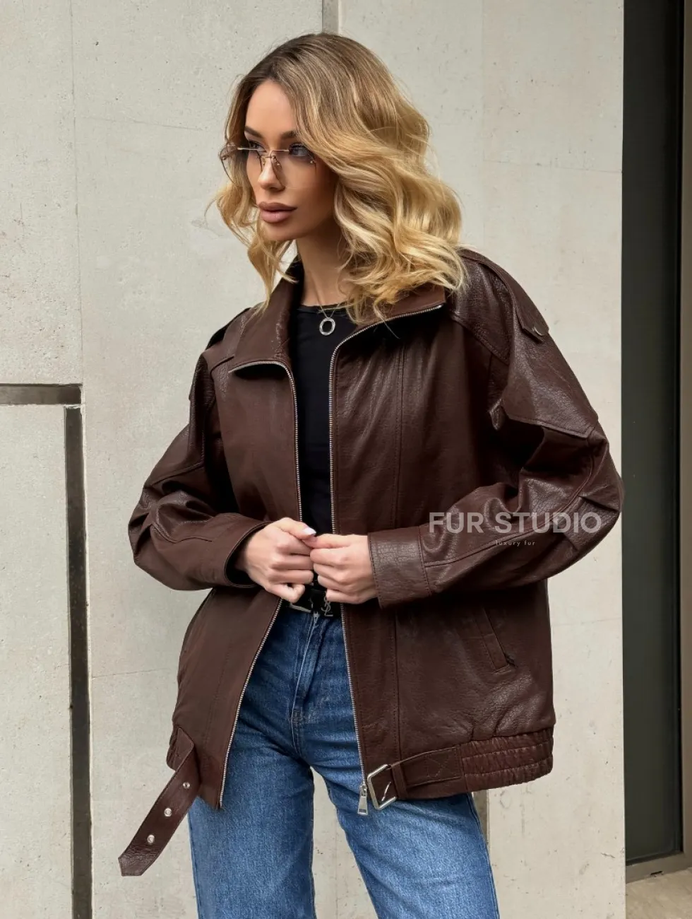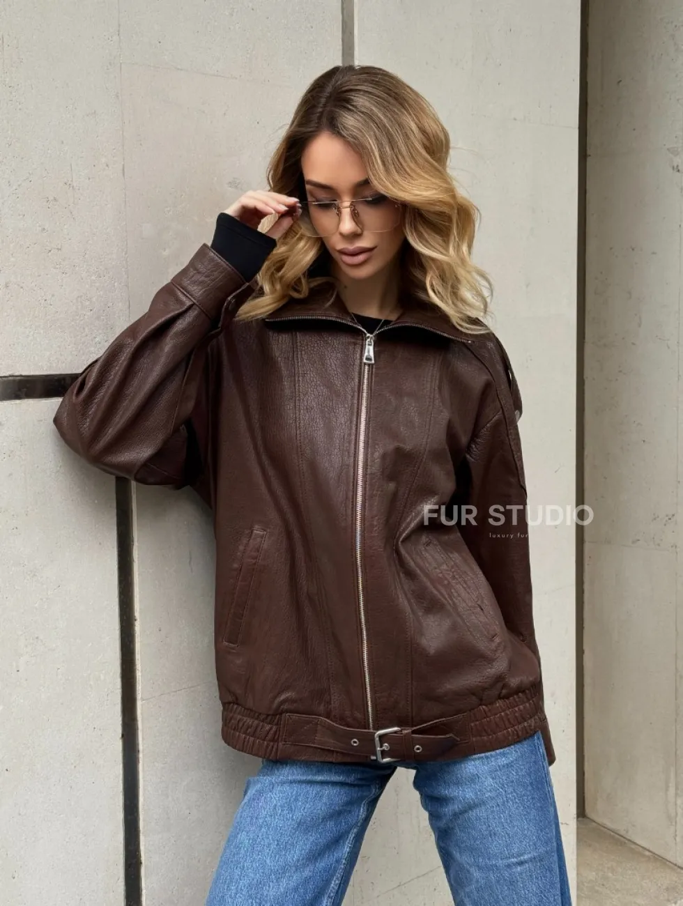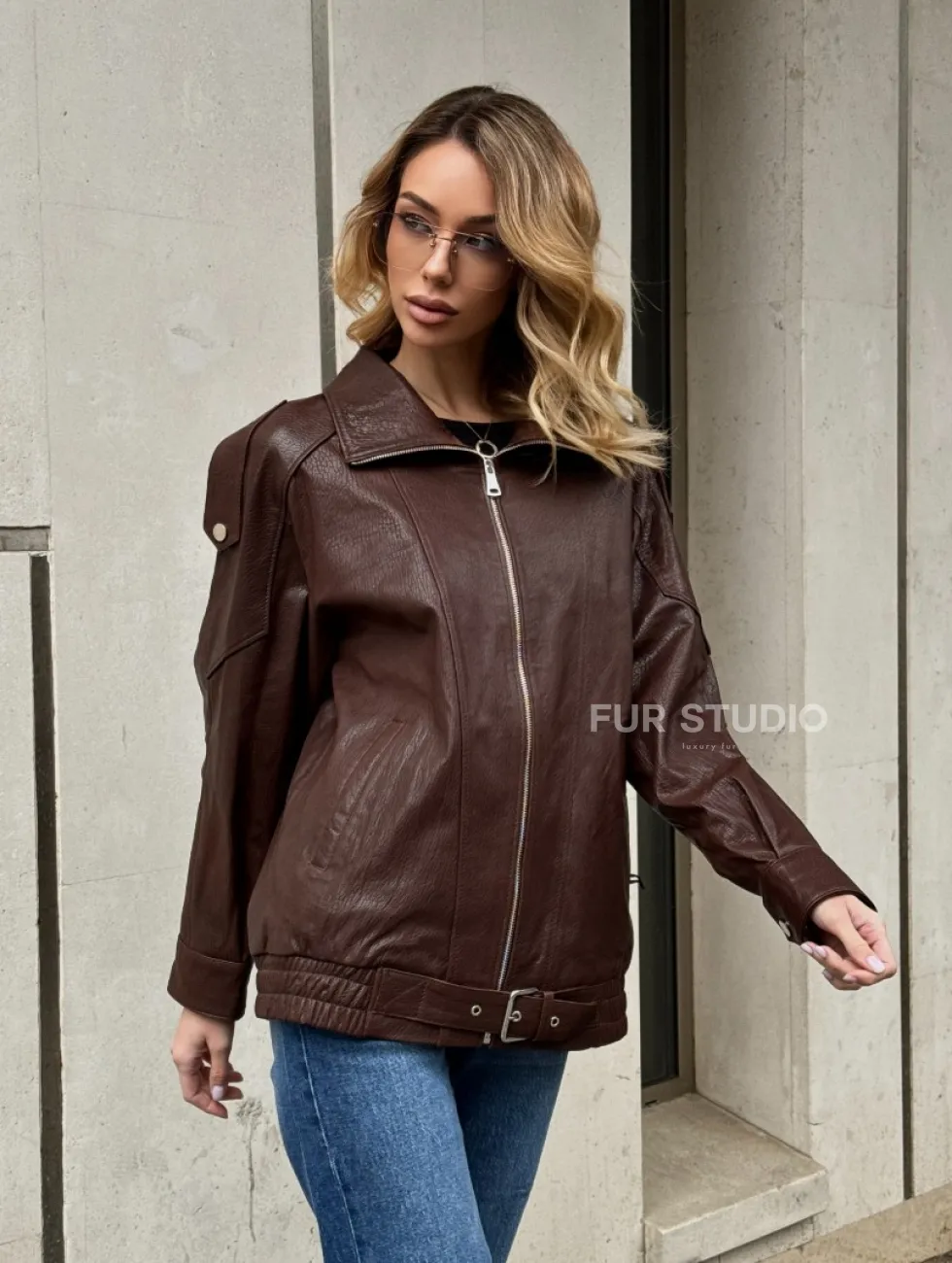 Коричневая кожаная курточка - бомбер на молнии доступна для покупки в нашем шоуруме Furs Studio в Москве, где также предоставляется удобная доставка во все города России.