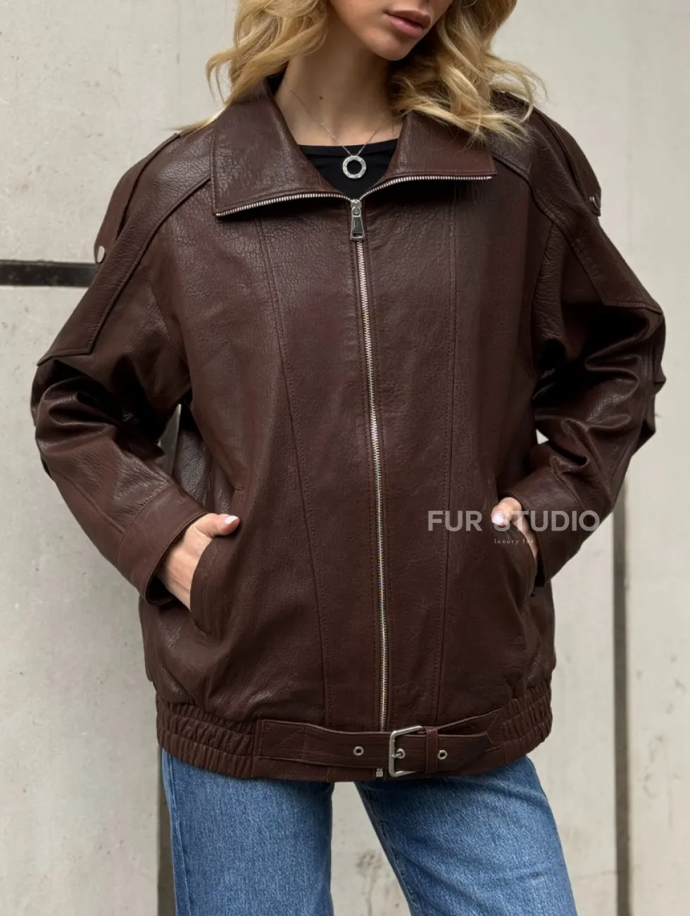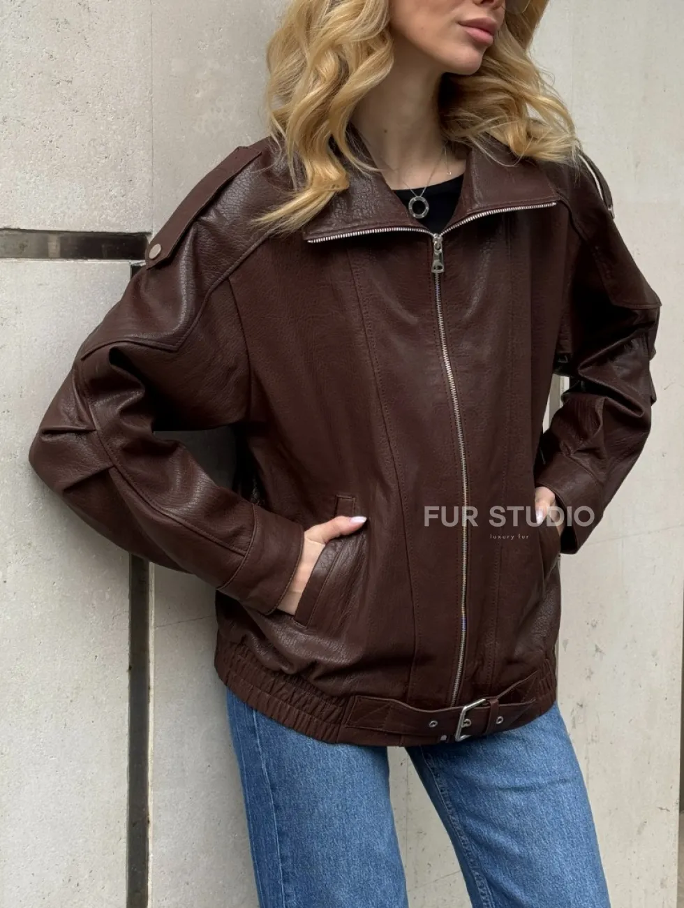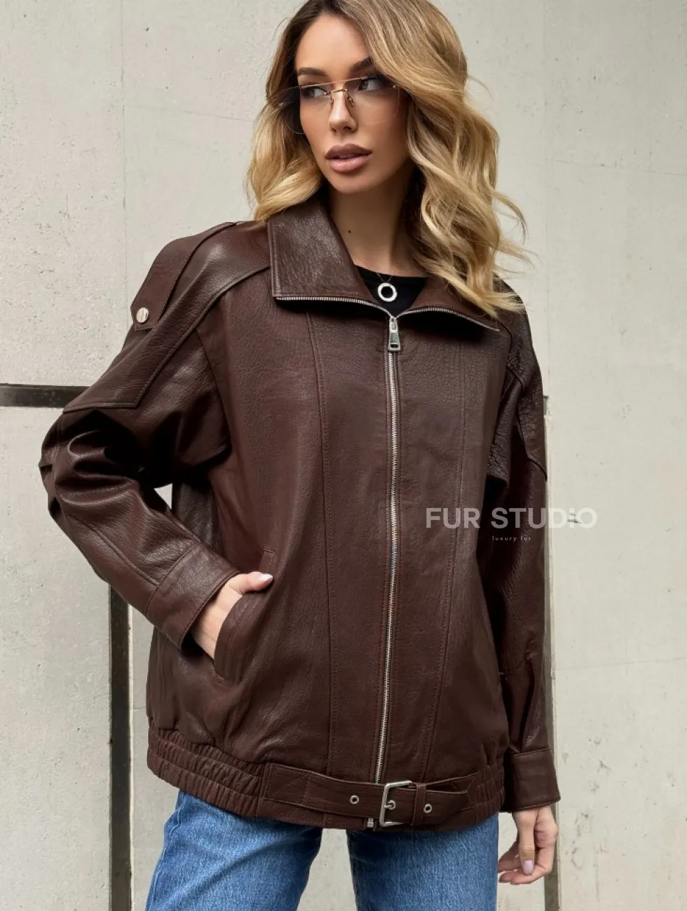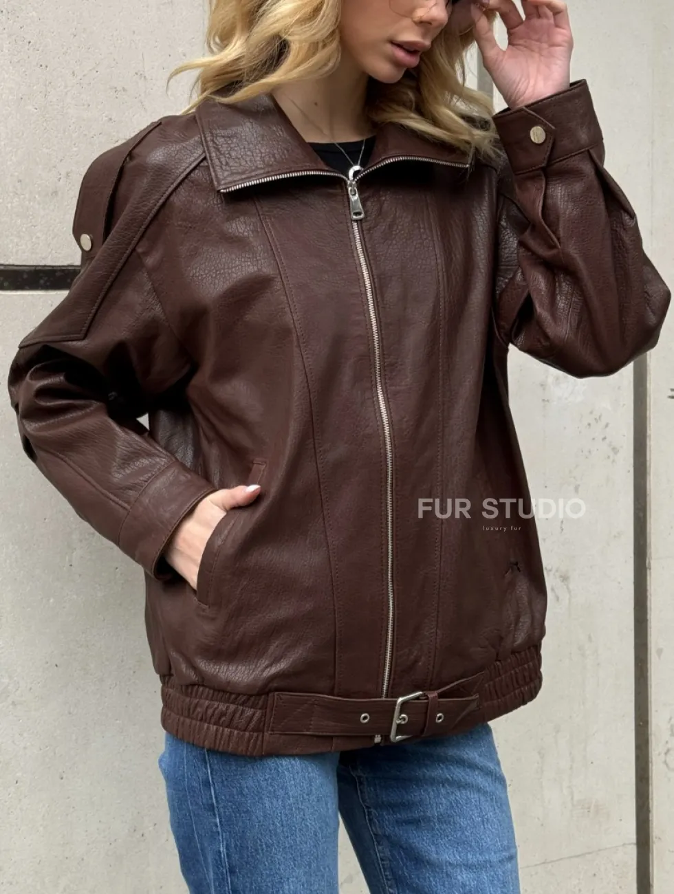 Коричневая кожаная курточка - бомбер на молнии доступна для покупки в нашем шоуруме Furs Studio в Москве, где также предоставляется удобная доставка во все города России.