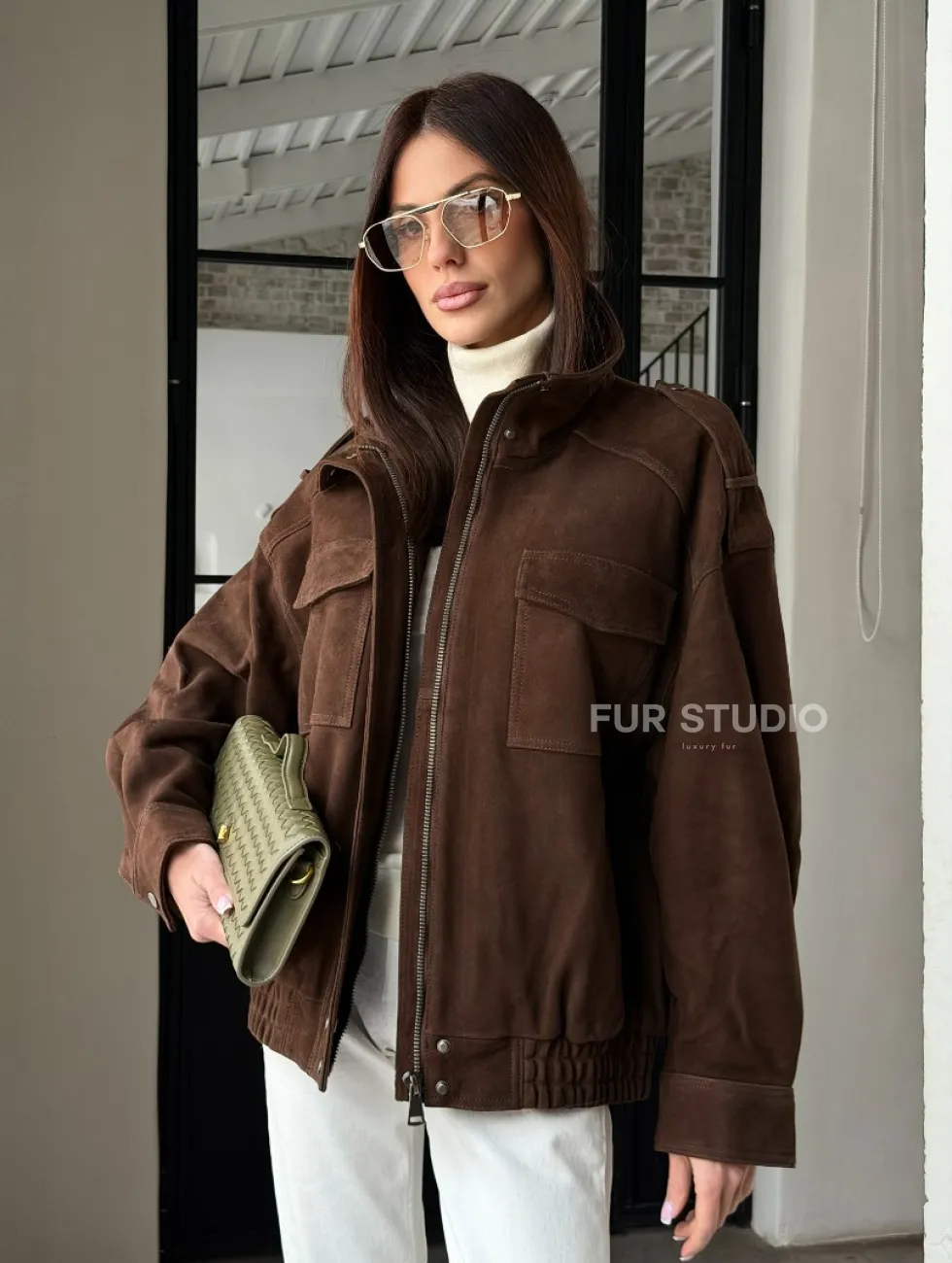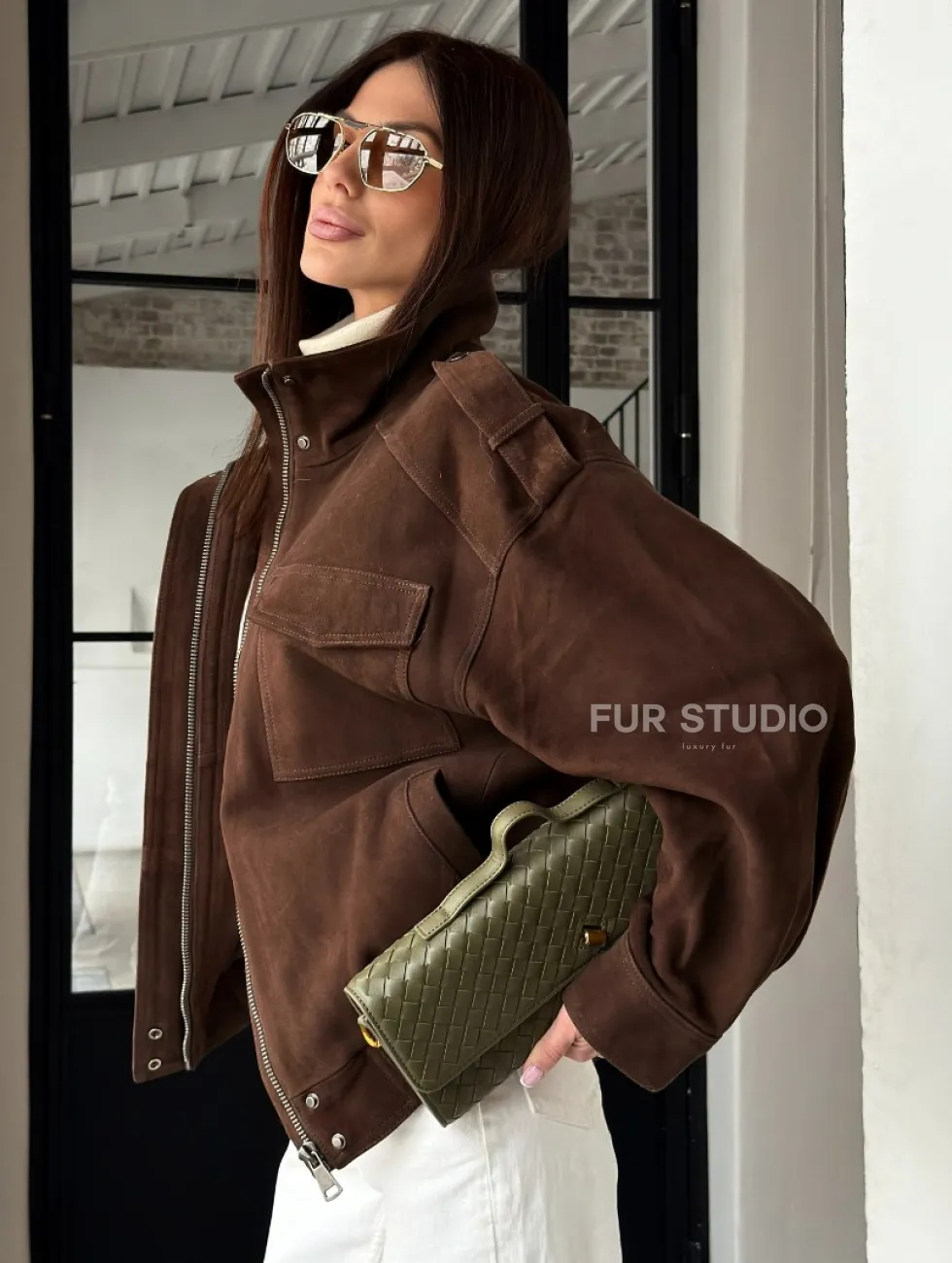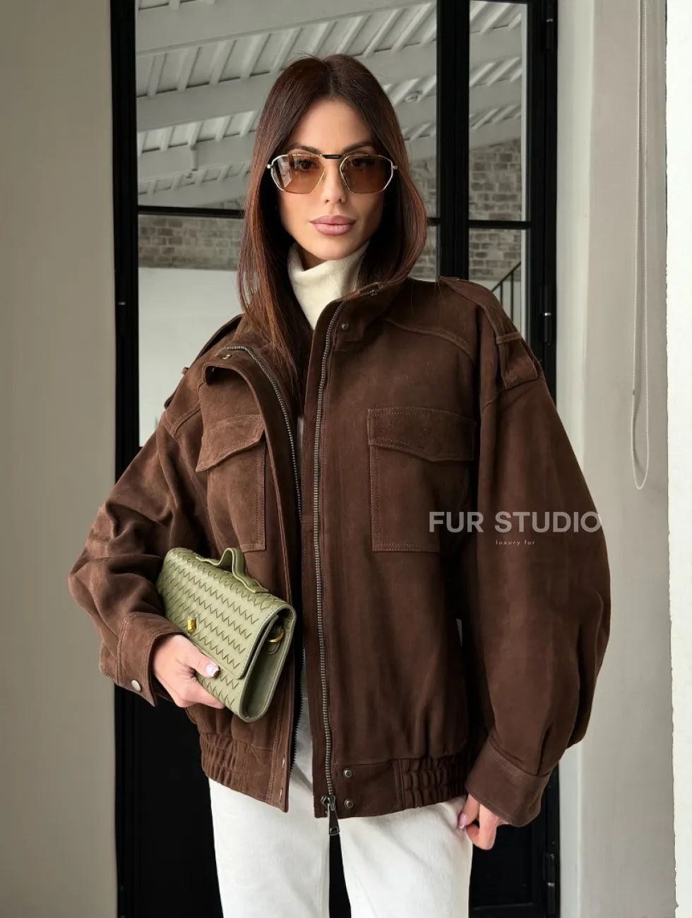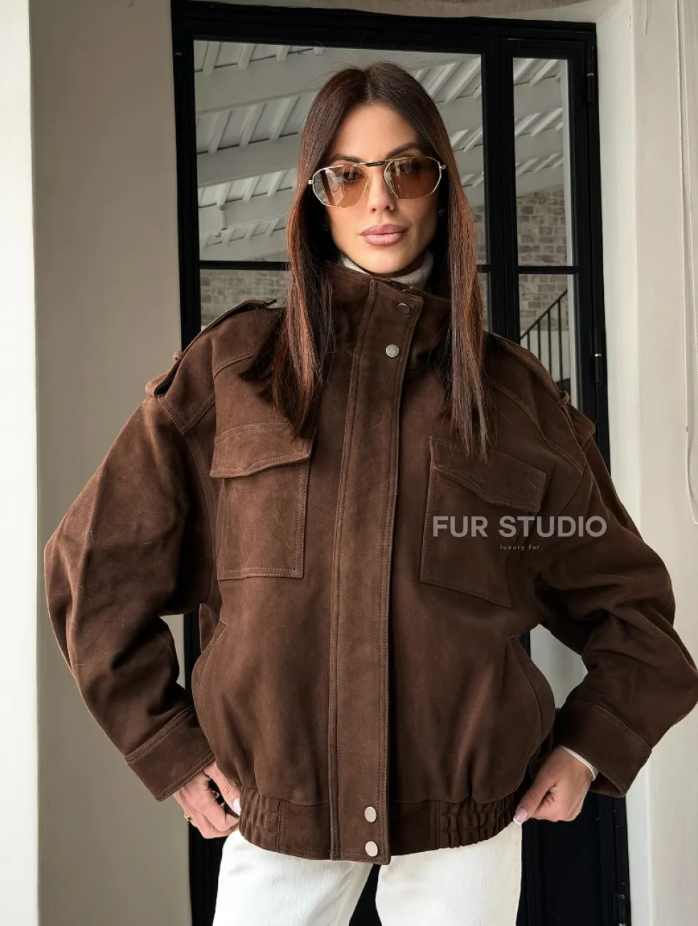 Коричневая куртка из натуральной замши тренд 2026 доступна для покупки в нашем шоуруме Furs Studio в Москве, где также предоставляется удобная доставка во все города России.