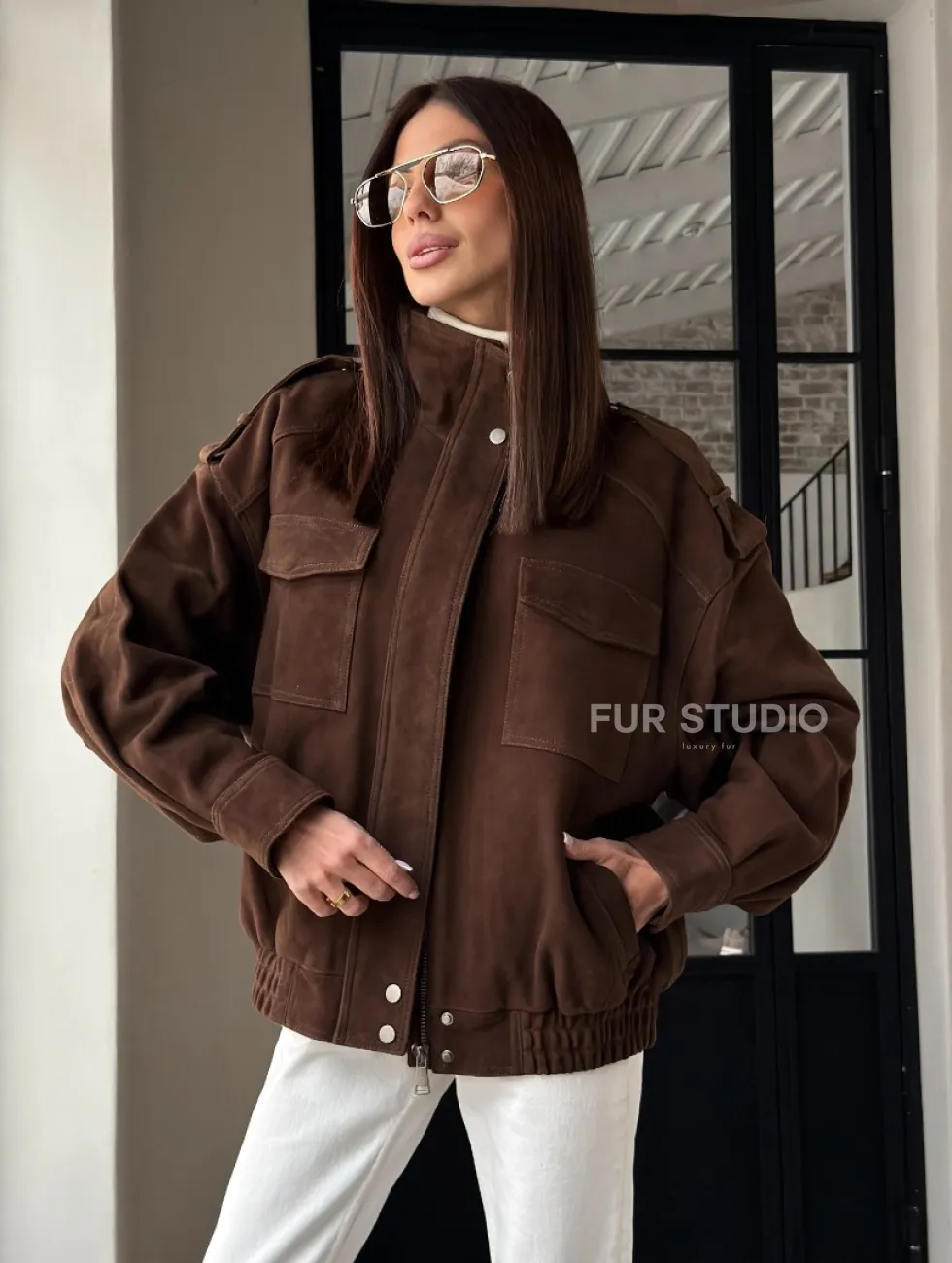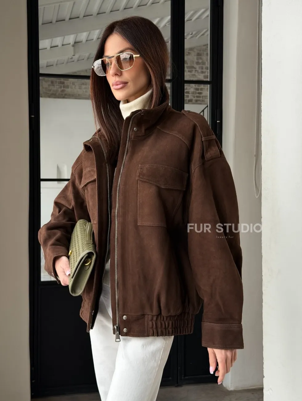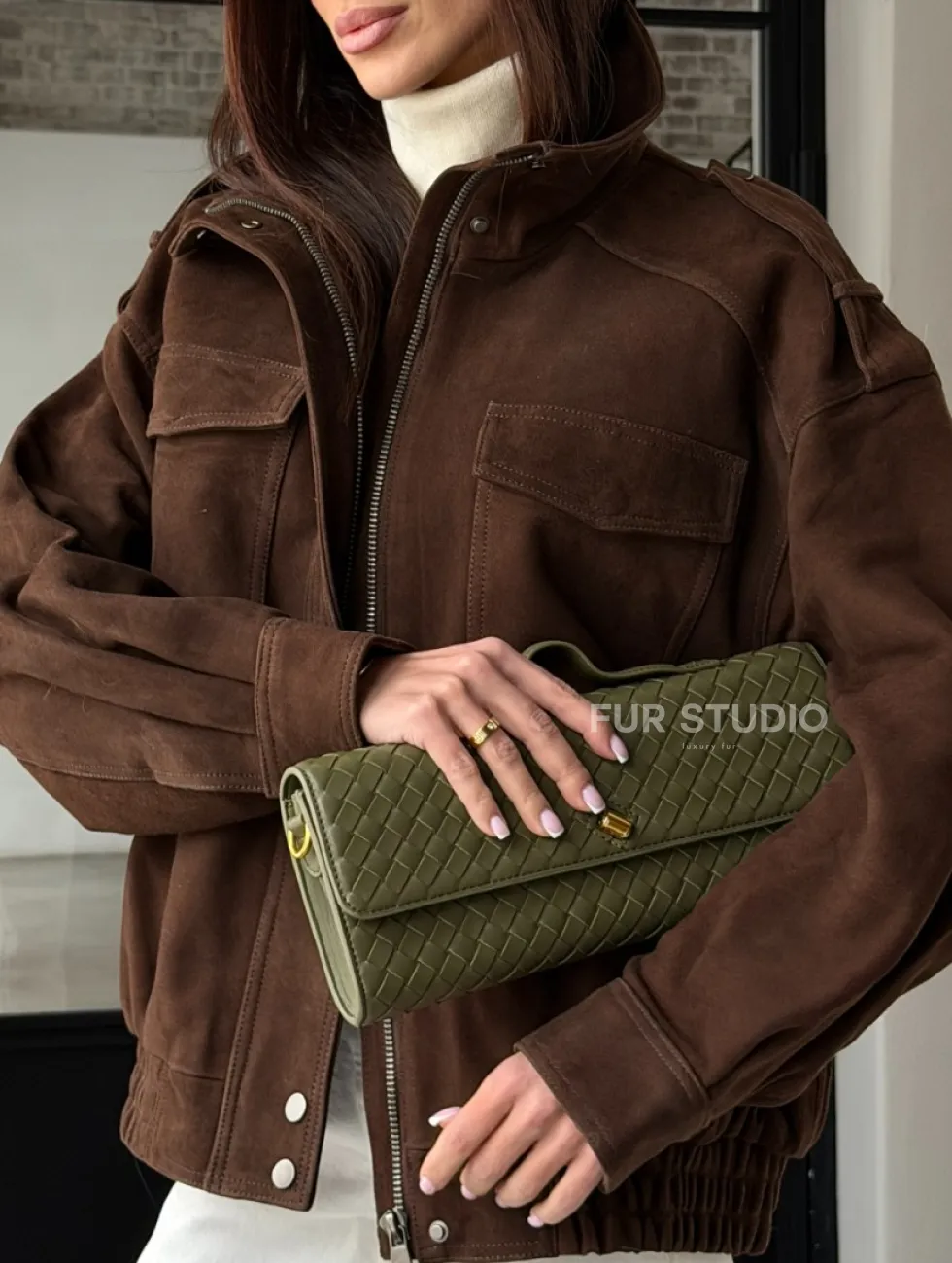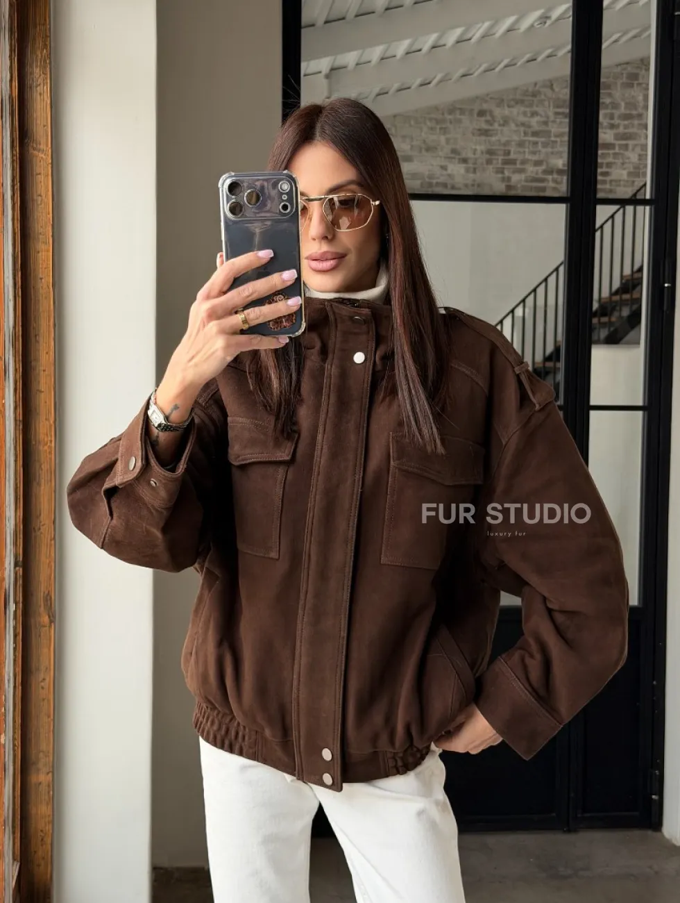 Коричневая куртка из натуральной замши тренд 2026 доступна для покупки в нашем шоуруме Furs Studio в Москве, где также предоставляется удобная доставка во все города России.