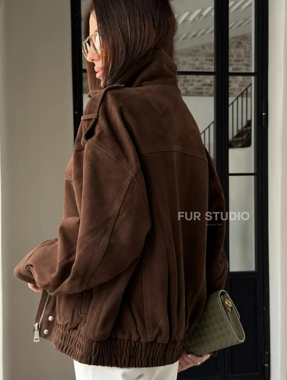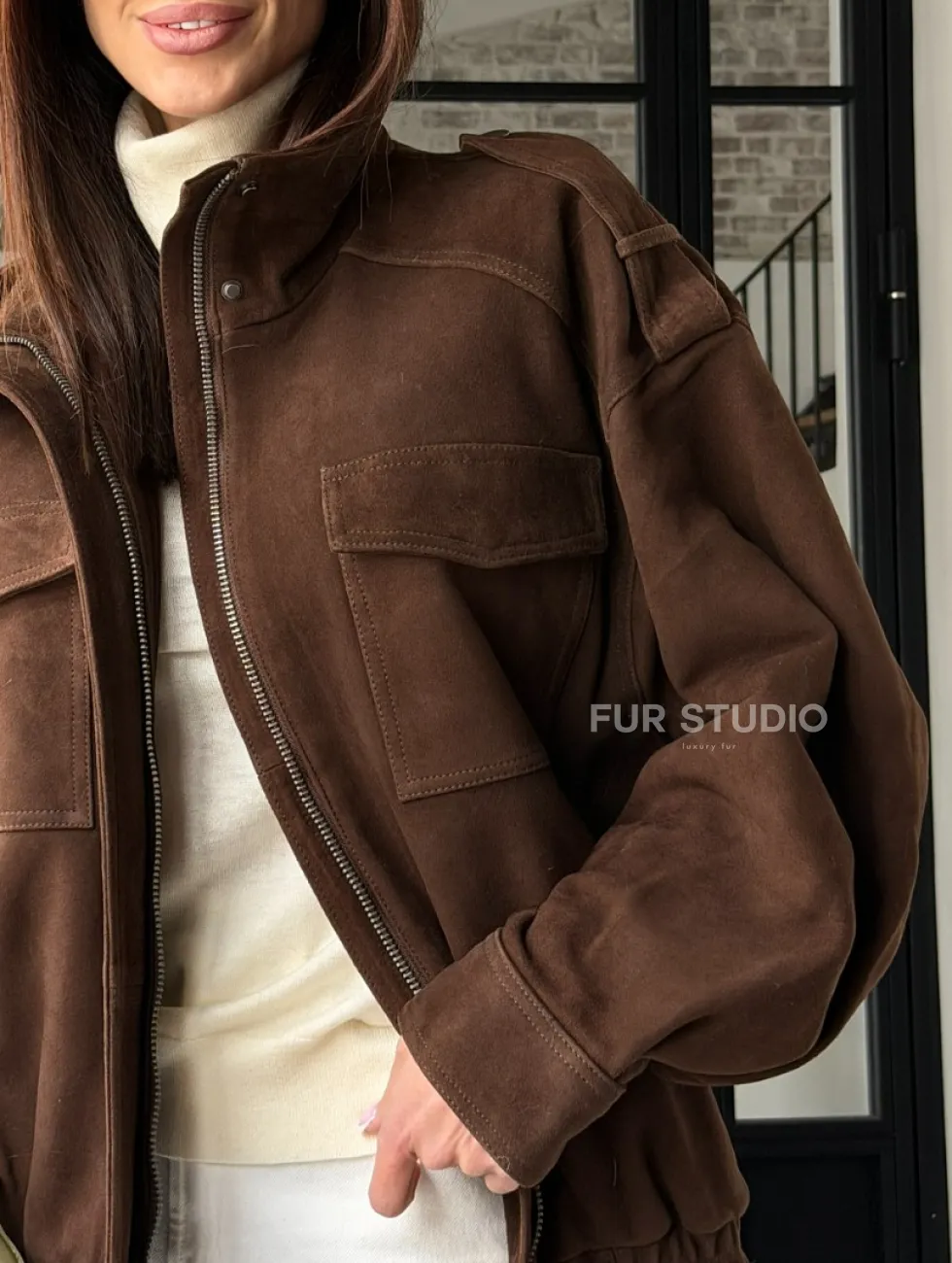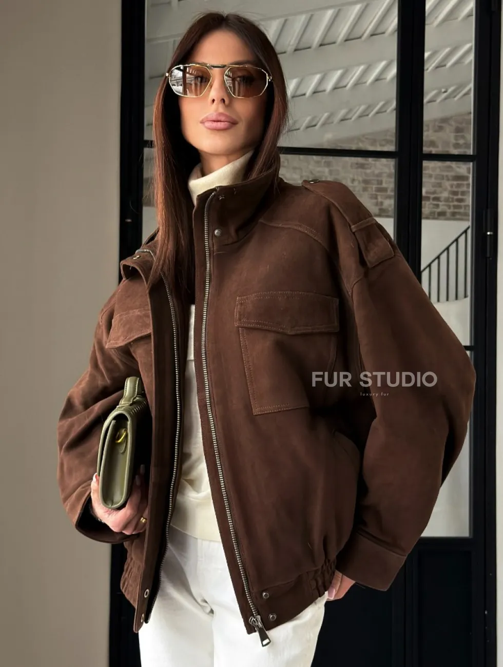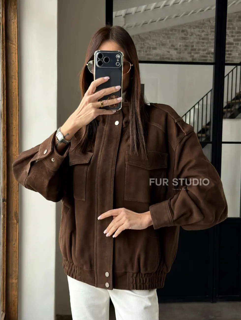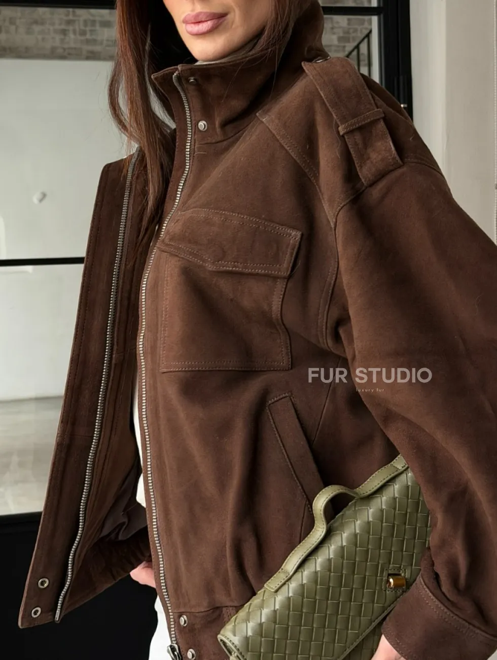 Коричневая куртка из натуральной замши тренд 2026 доступна для покупки в нашем шоуруме Furs Studio в Москве, где также предоставляется удобная доставка во все города России.