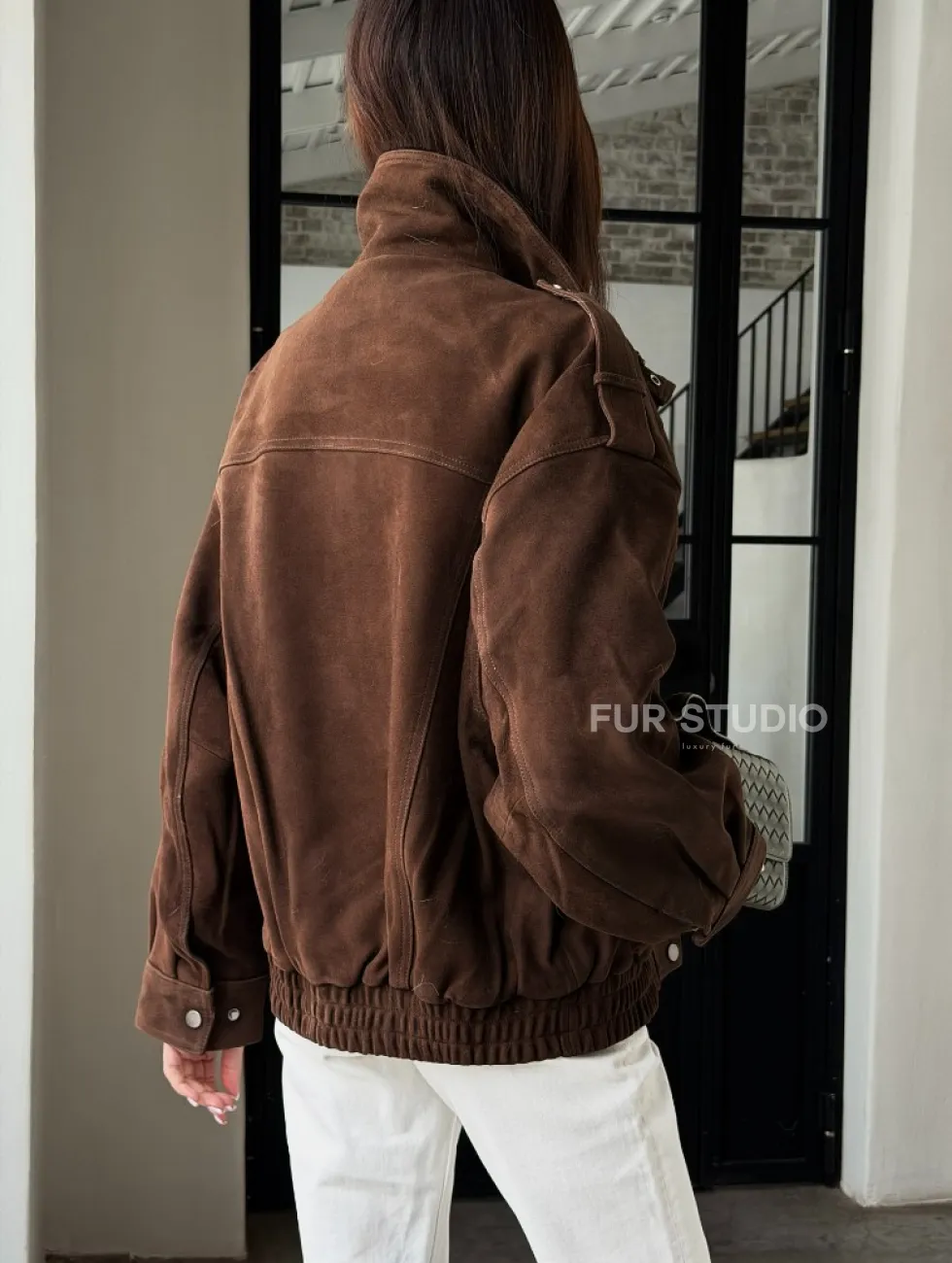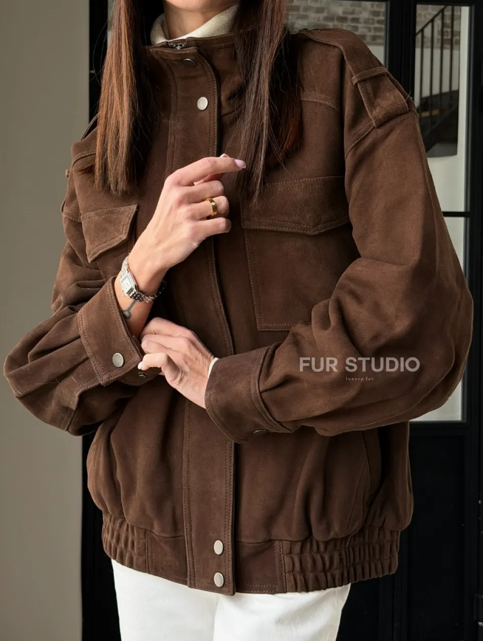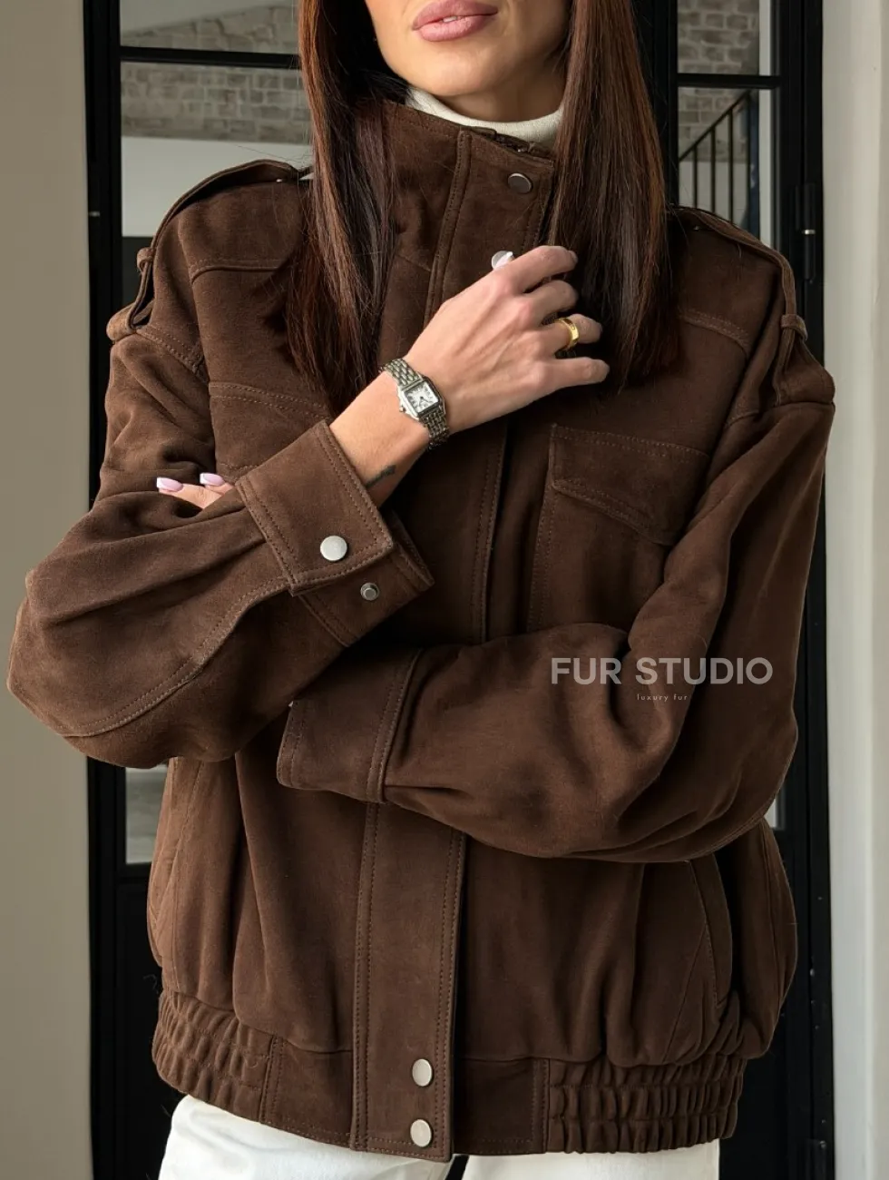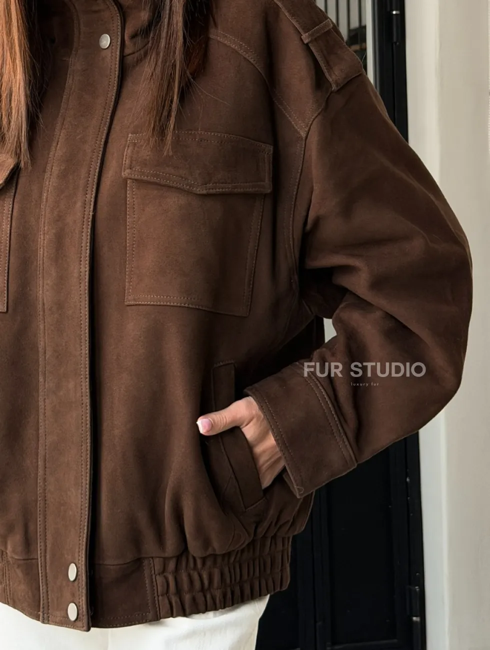 Коричневая куртка из натуральной замши тренд 2026 доступна для покупки в нашем шоуруме Furs Studio в Москве, где также предоставляется удобная доставка во все города России.
