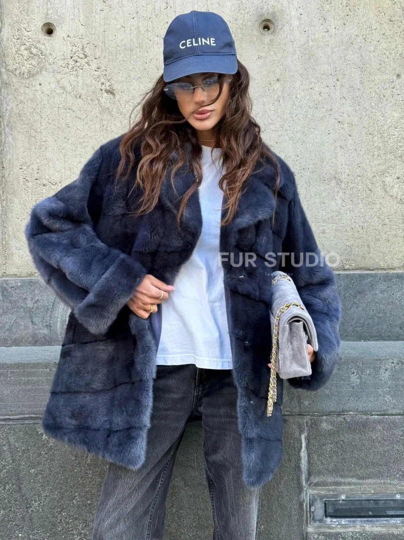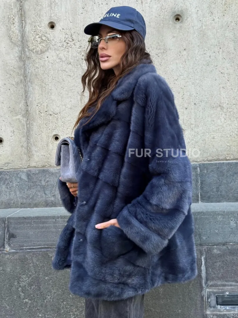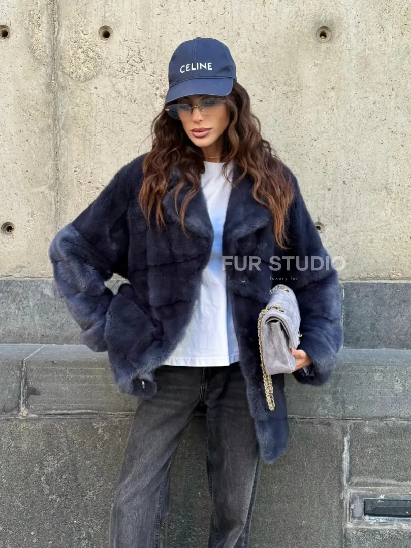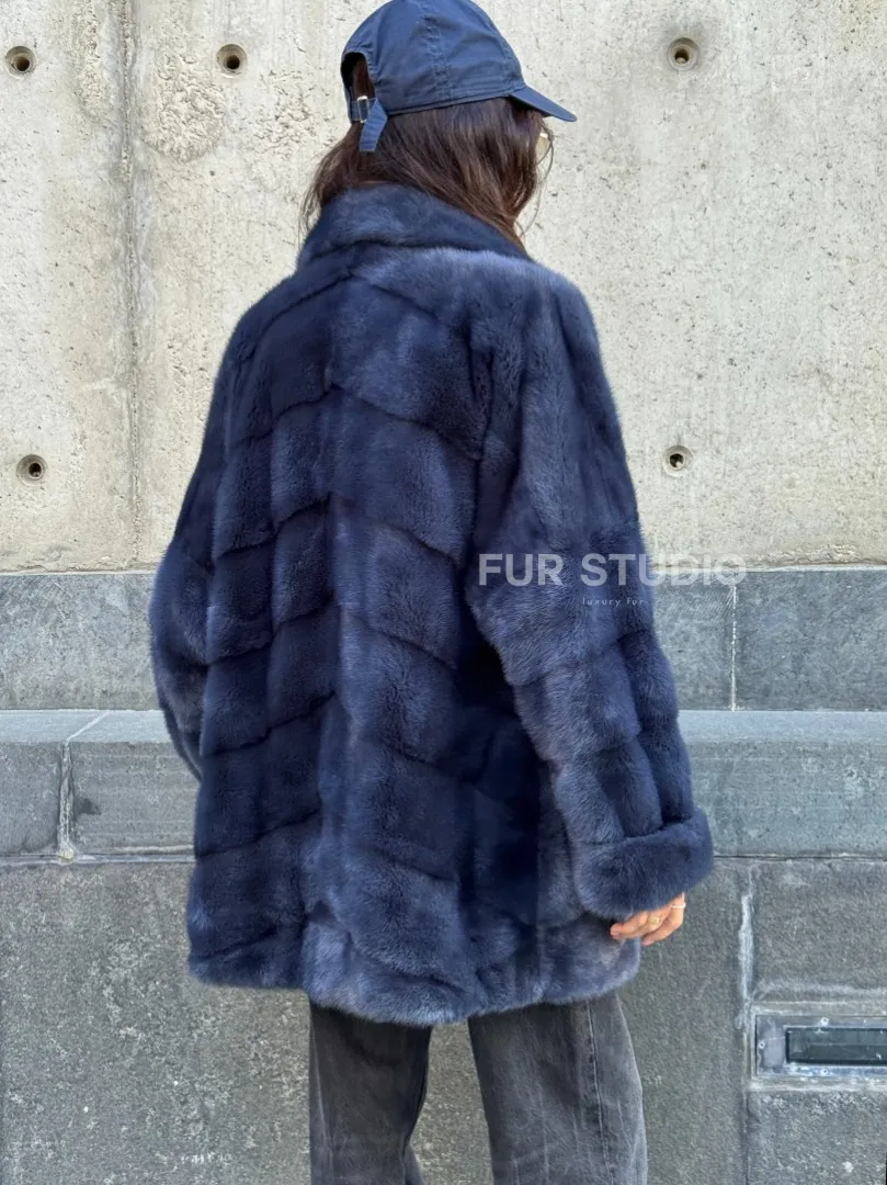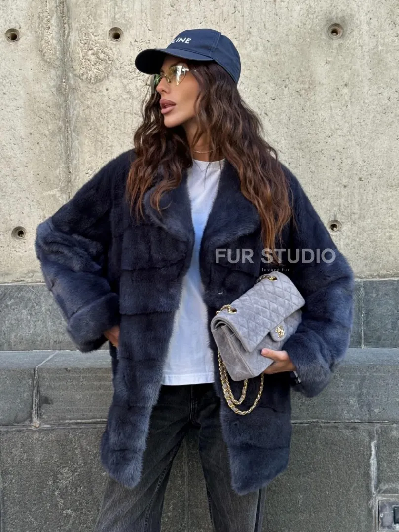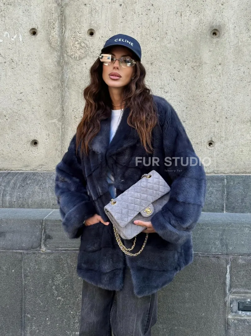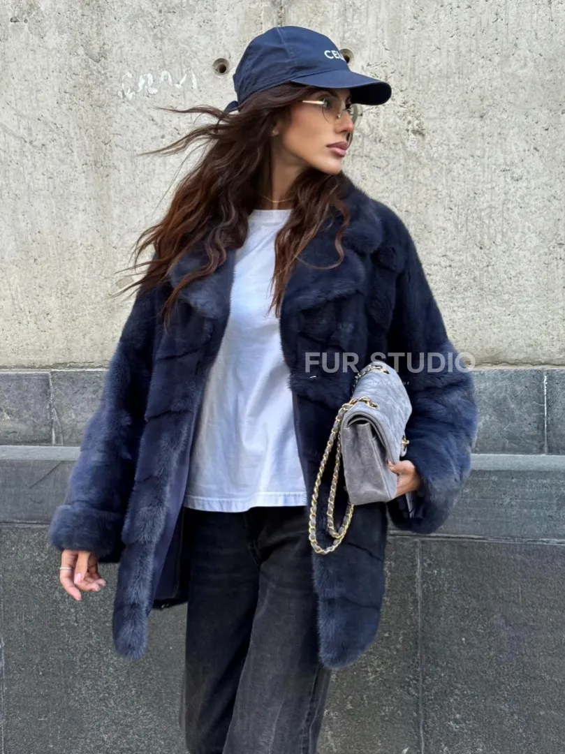 Мех данной шубы аукционная норка, цвет синий. Предлагается в размерах от 42 до 50. Длина модели 70-75 см, что выгодно подчеркивает фигуру девушек. Эта модель идеально подойдет для девушек и женщин, предпочитающих роскошные натуральные меха.