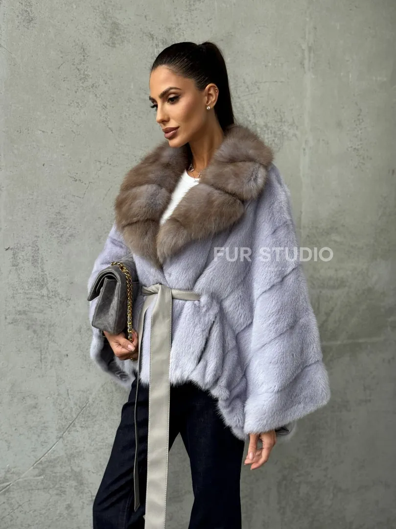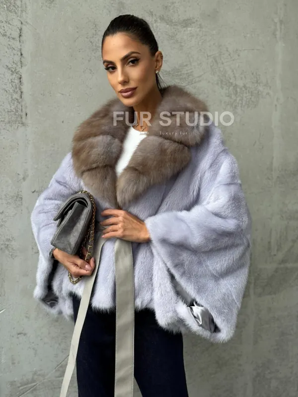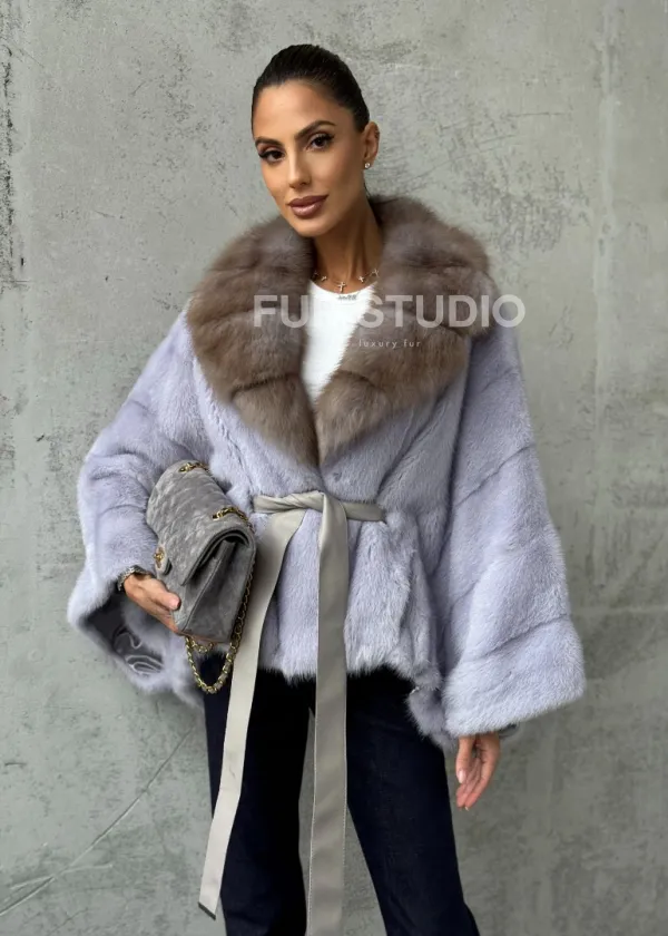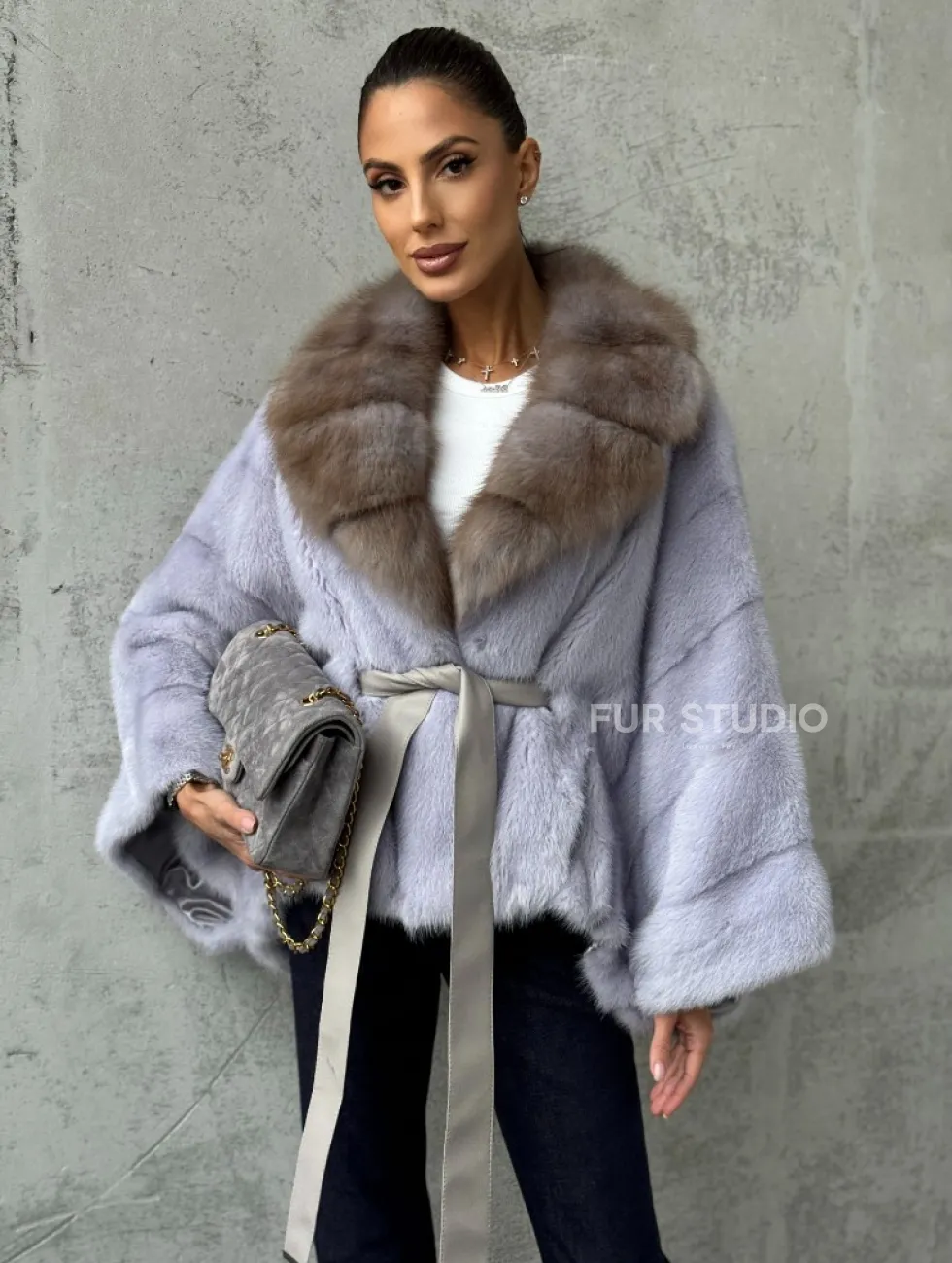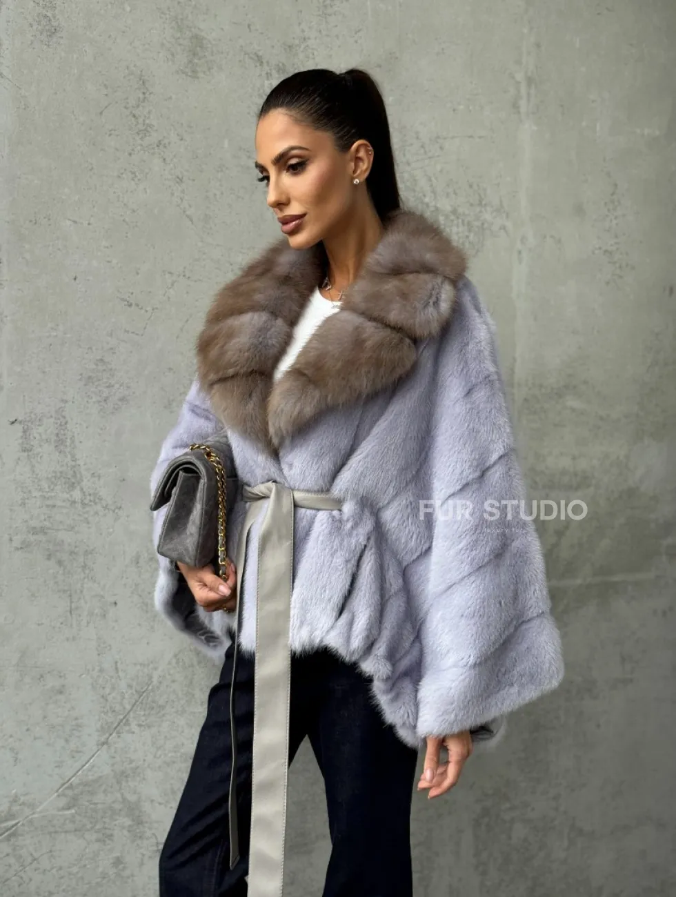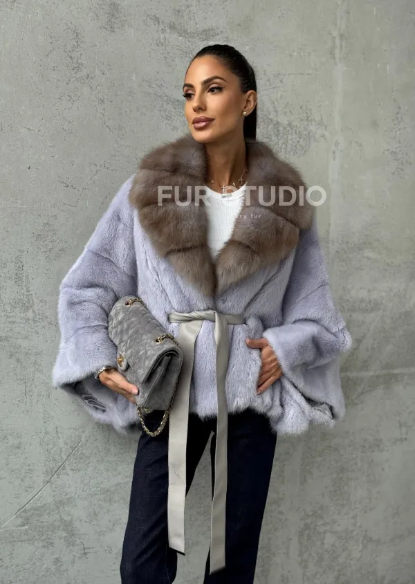 Мех данной шубы аукционная норка, цвет голубой. Предлагается в размерах от 42 до 58 (oversize). Длина модели 50-55 см, что выгодно подчеркивает фигуру девушек. Эта модель идеально подойдет для девушек и женщин, предпочитающих роскошные натуральные меха.