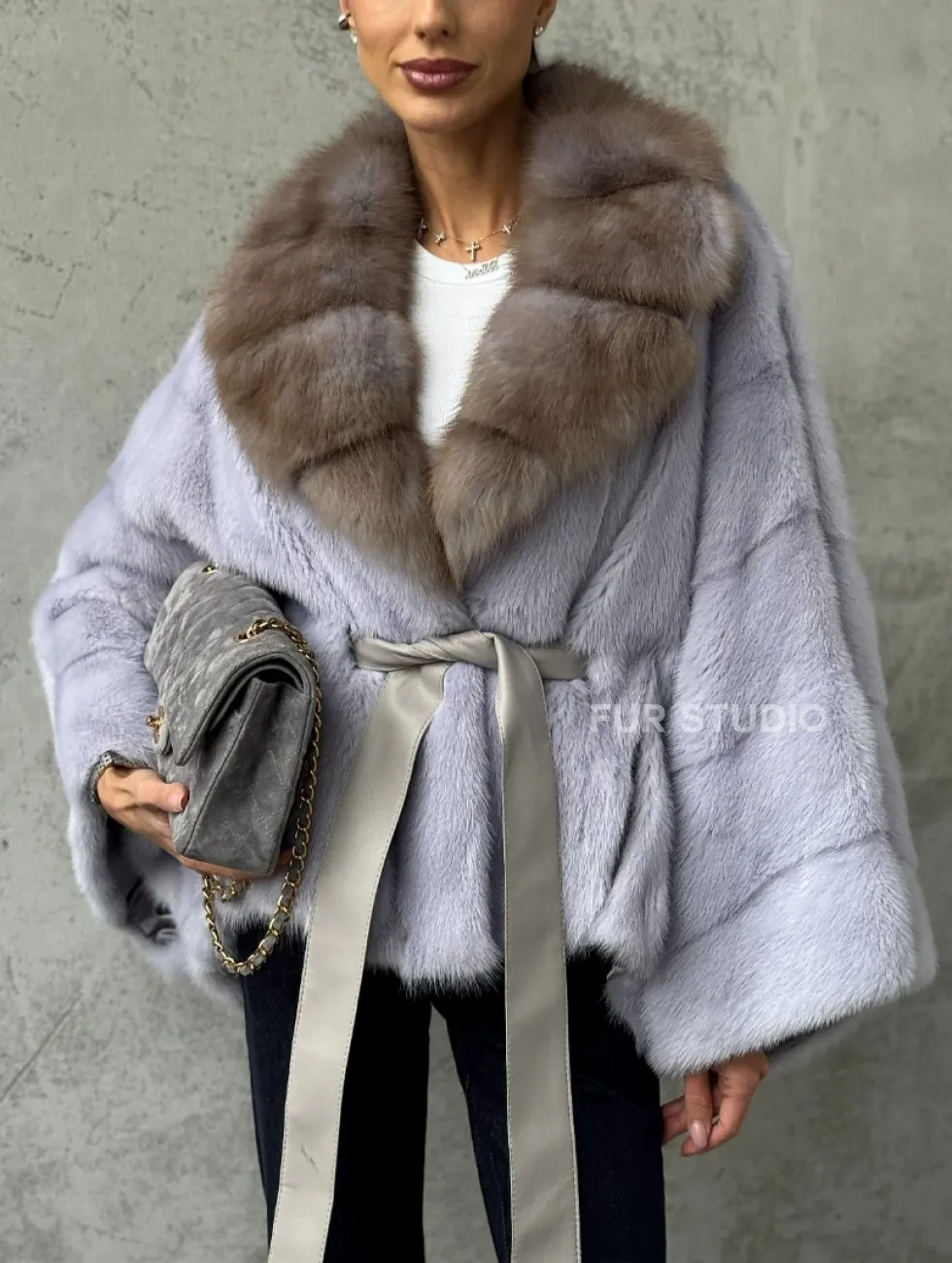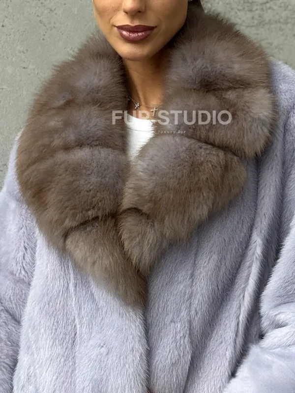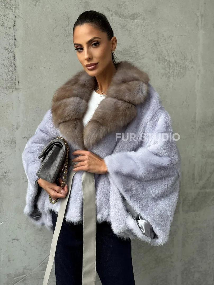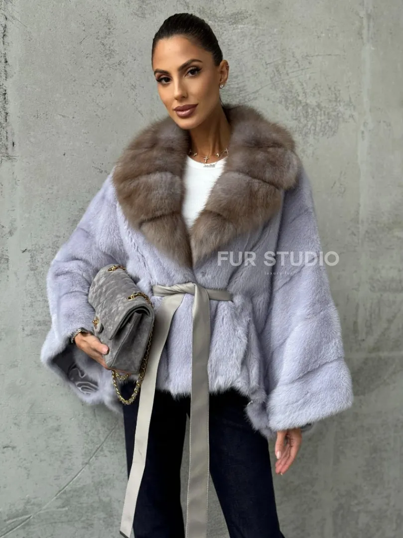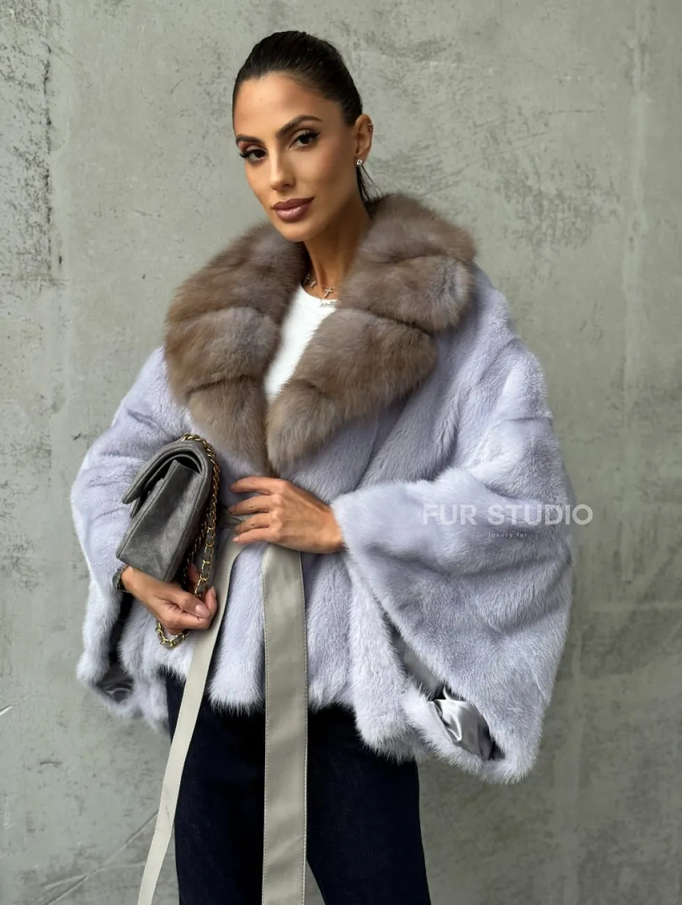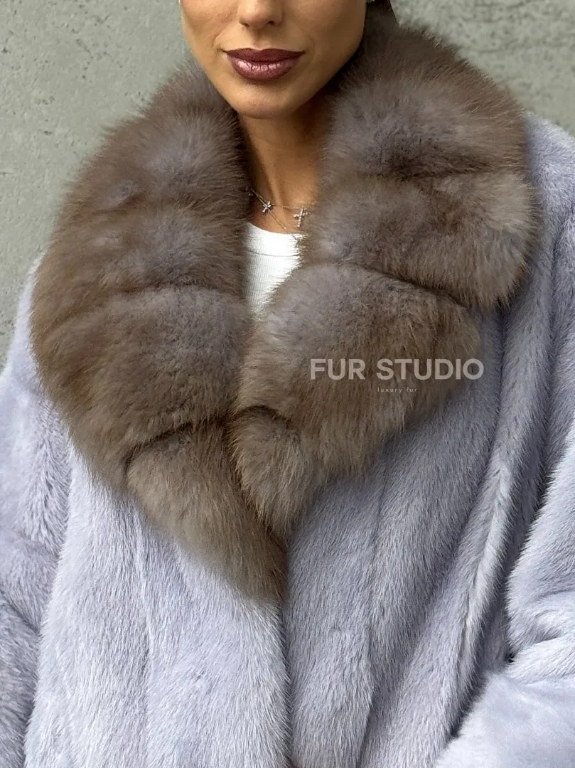 Мех данной шубы аукционная норка, цвет голубой. Предлагается в размерах от 42 до 58 (oversize). Длина модели 50-55 см, что выгодно подчеркивает фигуру девушек. Эта модель идеально подойдет для девушек и женщин, предпочитающих роскошные натуральные меха.