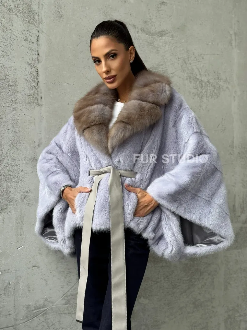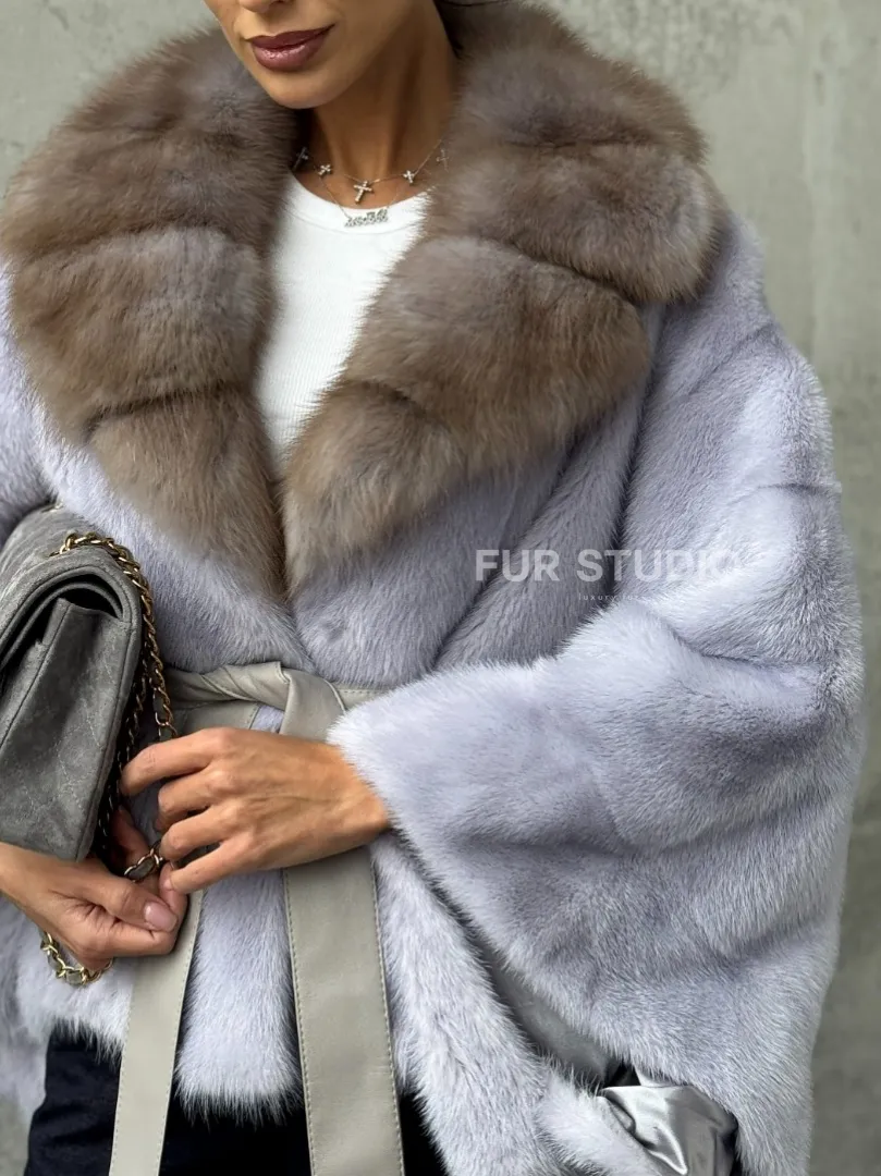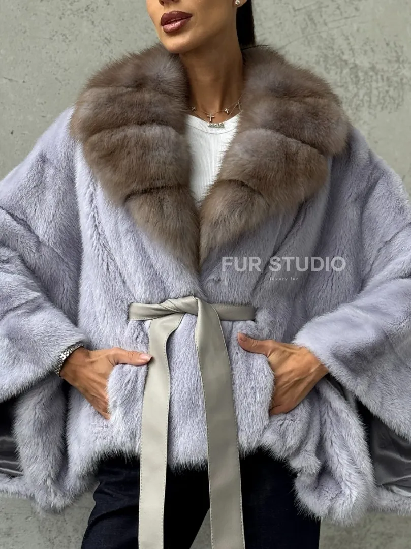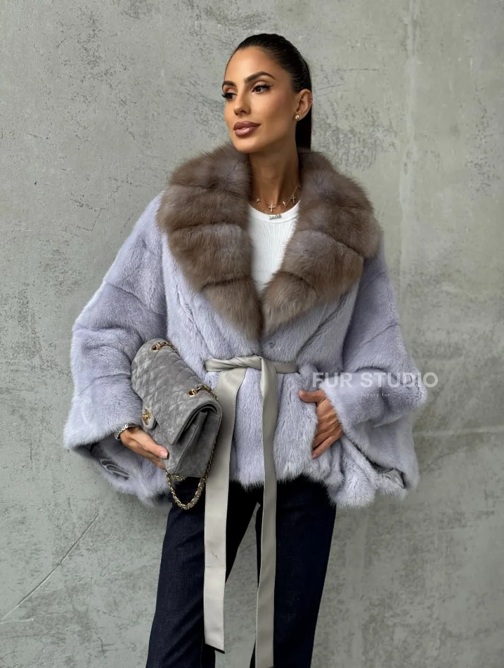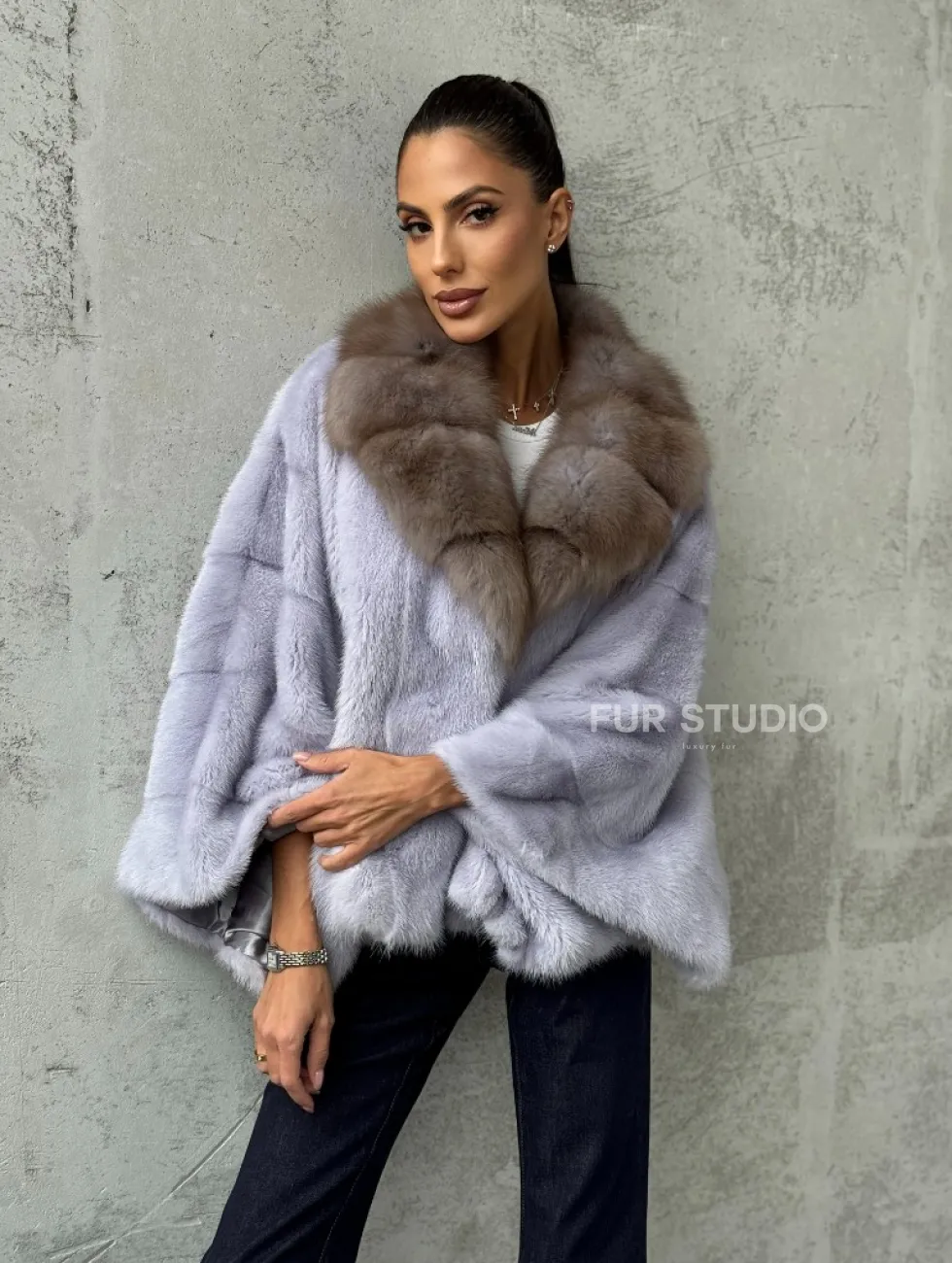 Мех данной шубы аукционная норка, цвет голубой. Предлагается в размерах от 42 до 58 (oversize). Длина модели 50-55 см, что выгодно подчеркивает фигуру девушек. Эта модель идеально подойдет для девушек и женщин, предпочитающих роскошные натуральные меха.