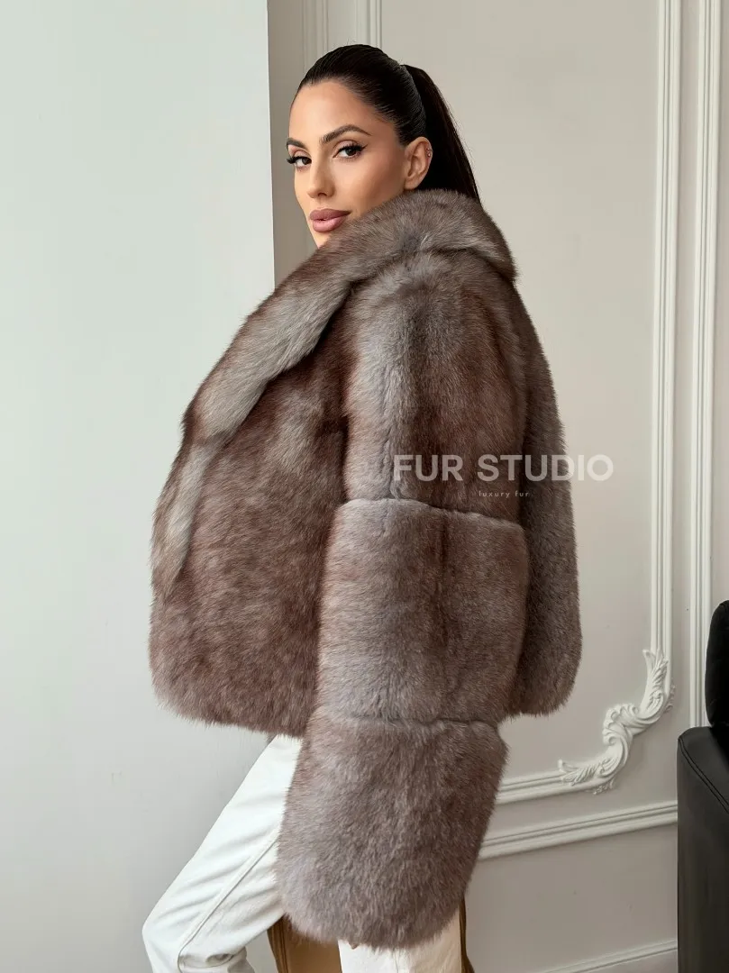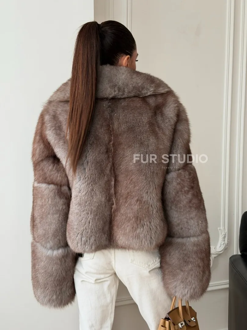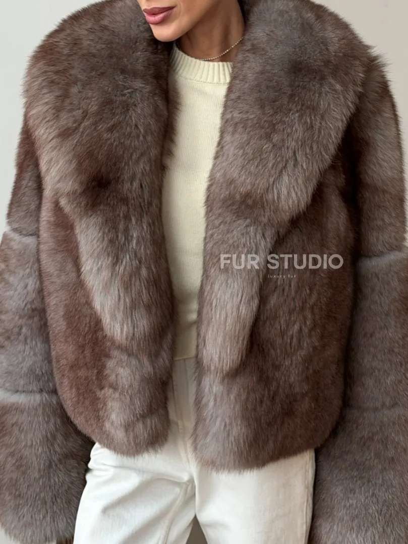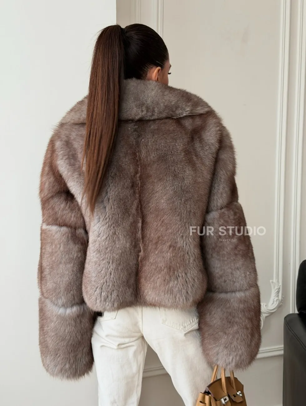 Мех данной шубы финский песец, цвет коричневый. Предлагается в размерах от 40 до 48. Длина модели 55-60 см, что выгодно подчеркивает фигуру девушек. Эта модель идеально подойдет для девушек и женщин, предпочитающих роскошные натуральные меха.