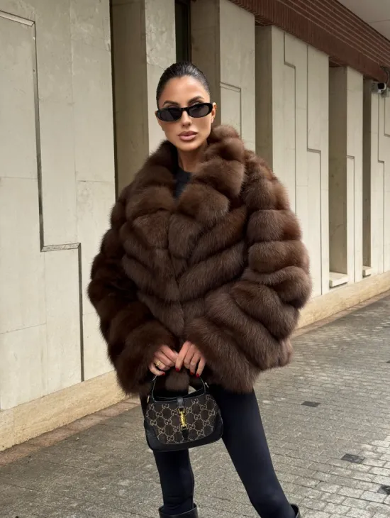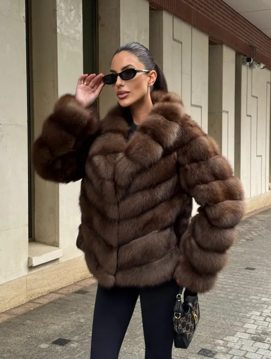 Мех данной шубы лесная куница, цвет коричневый. Предлагается в размерах от 42 до 46. Длина модели 50-55 см , что выгодно подчеркивает фигуру девушек. Эта модель идеально подойдет для девушек и женщин, предпочитающих роскошные натуральные меха.