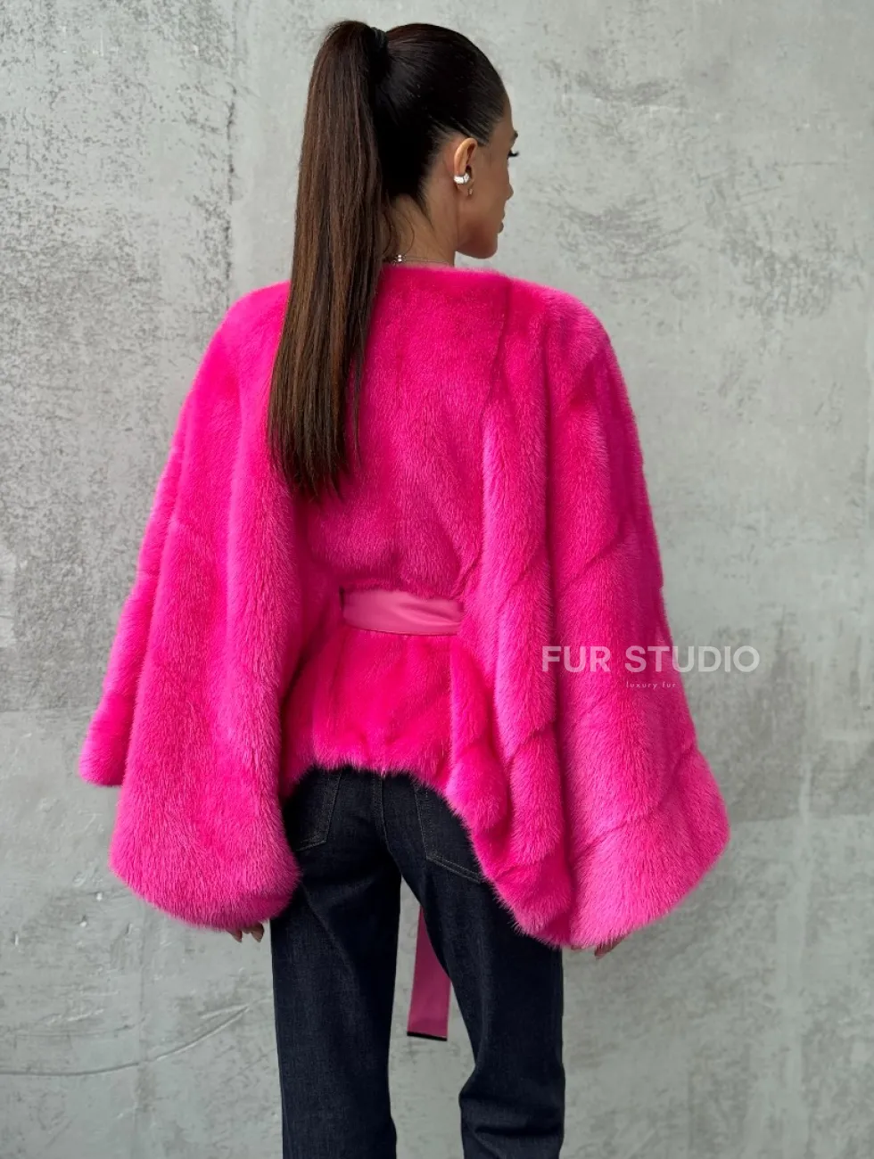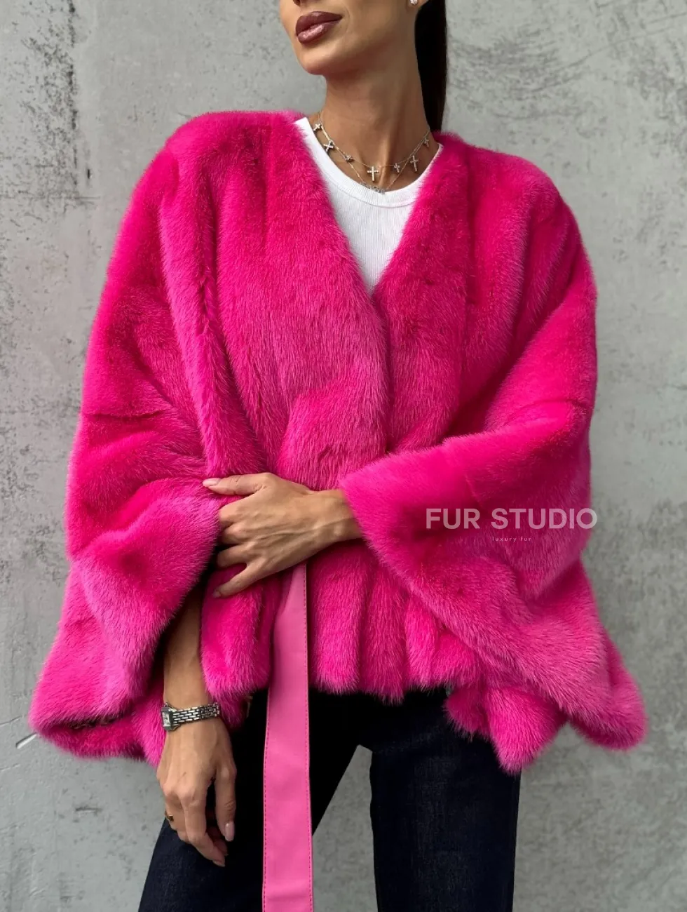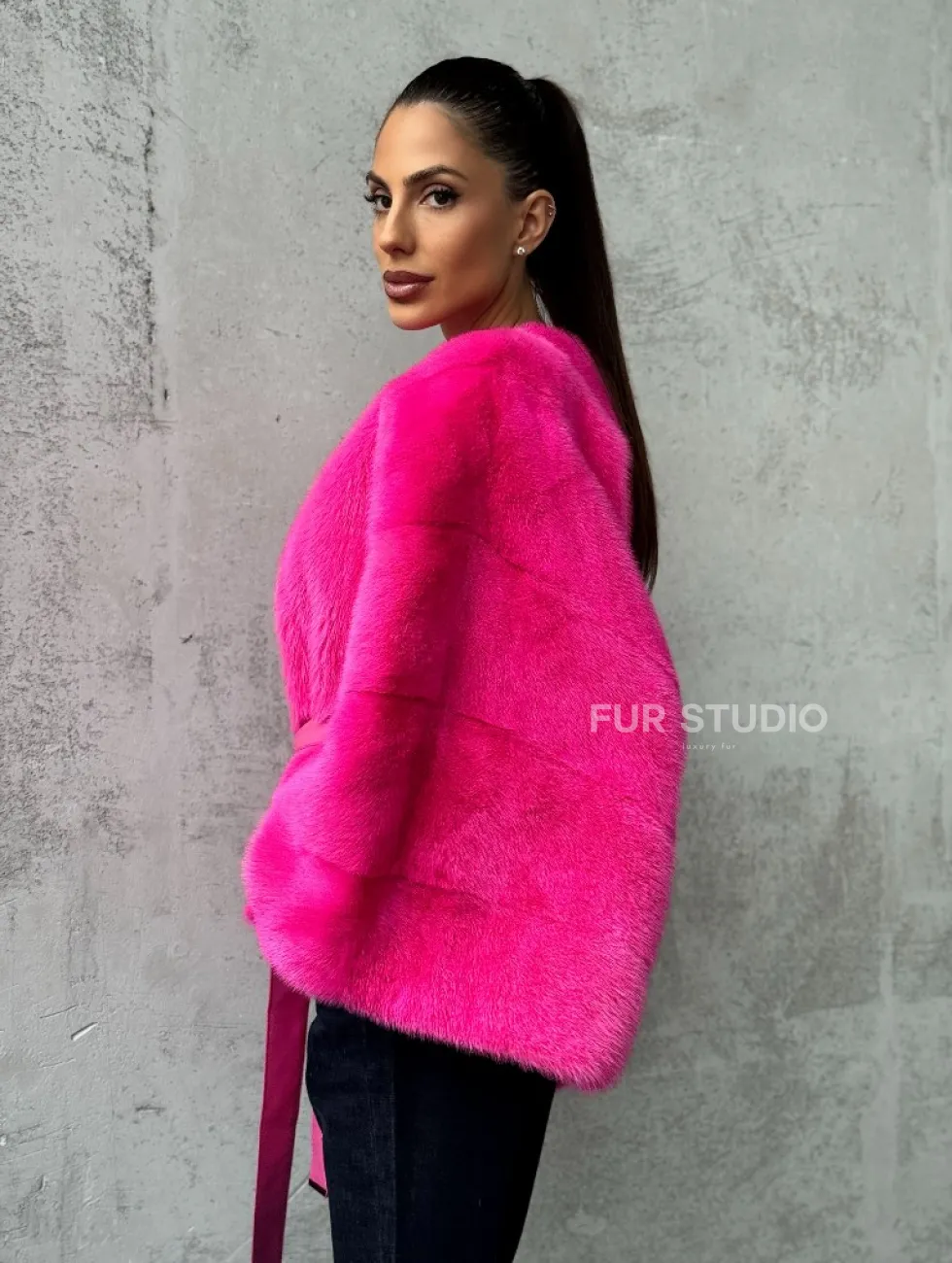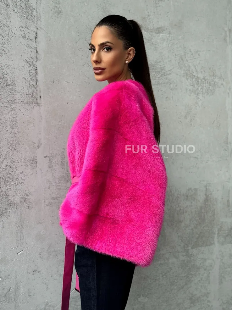 Мех данной шубы аукционная норка, цвет розовый. Предлагается в размерах от 40 до 58 (oversize). Длина модели 50-55 см, что выгодно подчеркивает фигуру девушек. Эта модель идеально подойдет для девушек и женщин, предпочитающих роскошные натуральные меха.