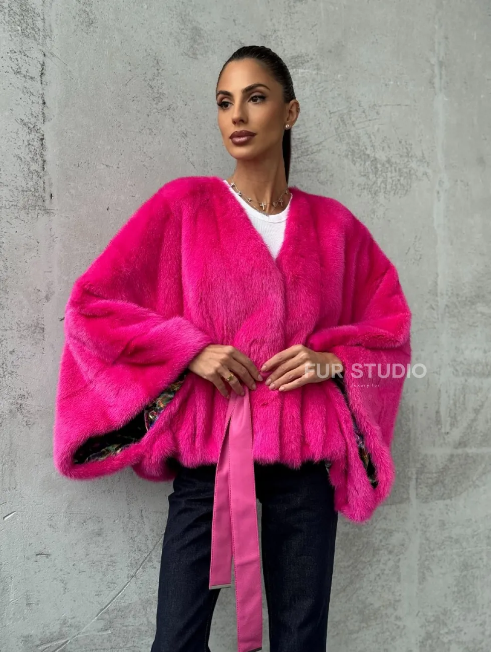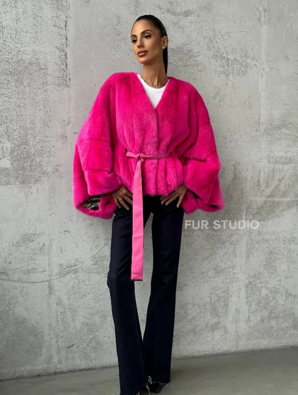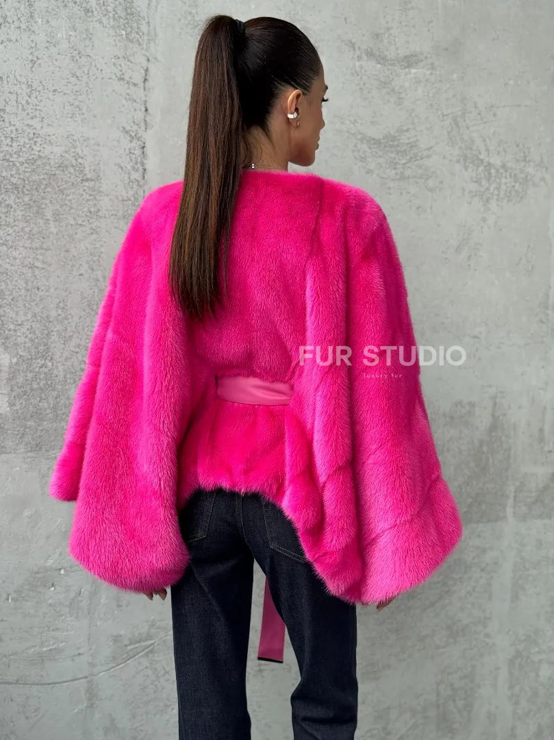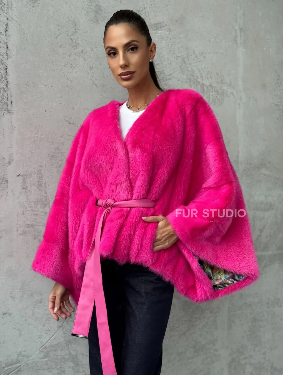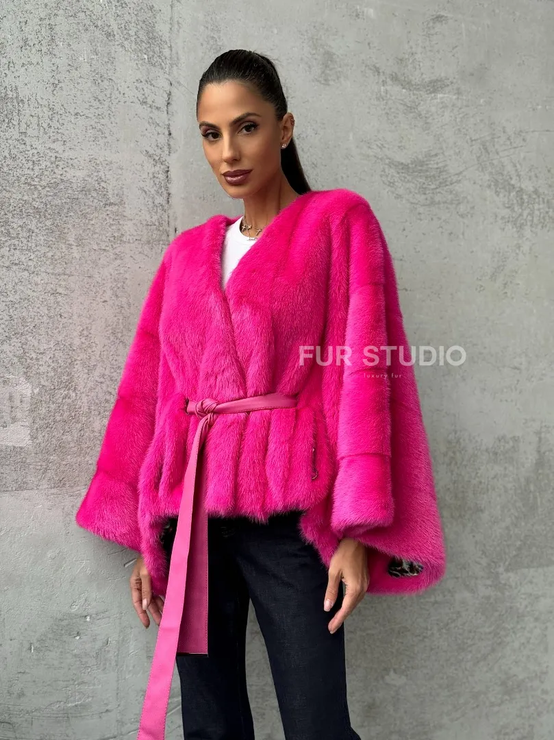 Мех данной шубы аукционная норка, цвет розовый. Предлагается в размерах от 40 до 58 (oversize). Длина модели 50-55 см, что выгодно подчеркивает фигуру девушек. Эта модель идеально подойдет для девушек и женщин, предпочитающих роскошные натуральные меха.