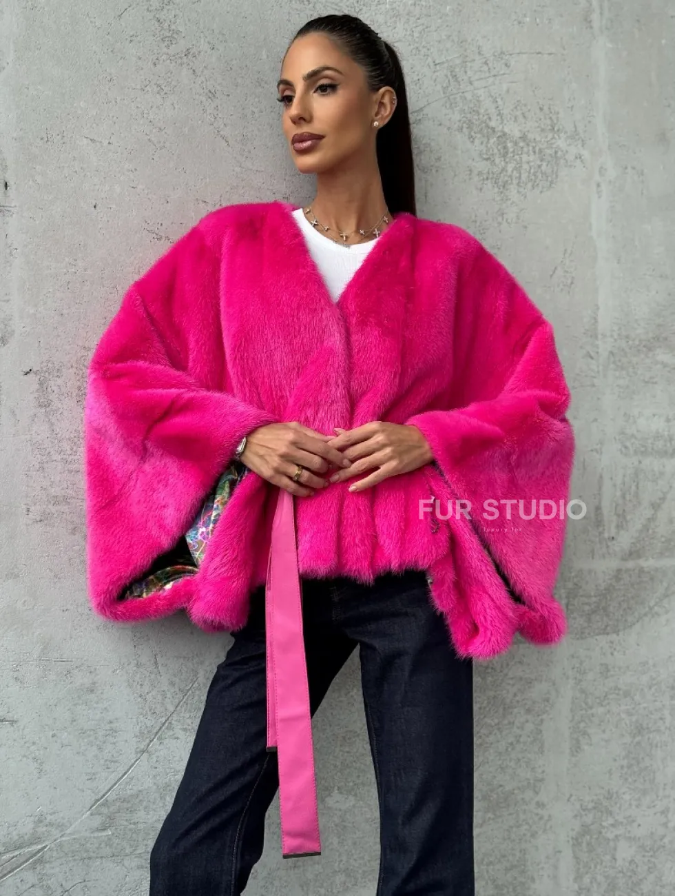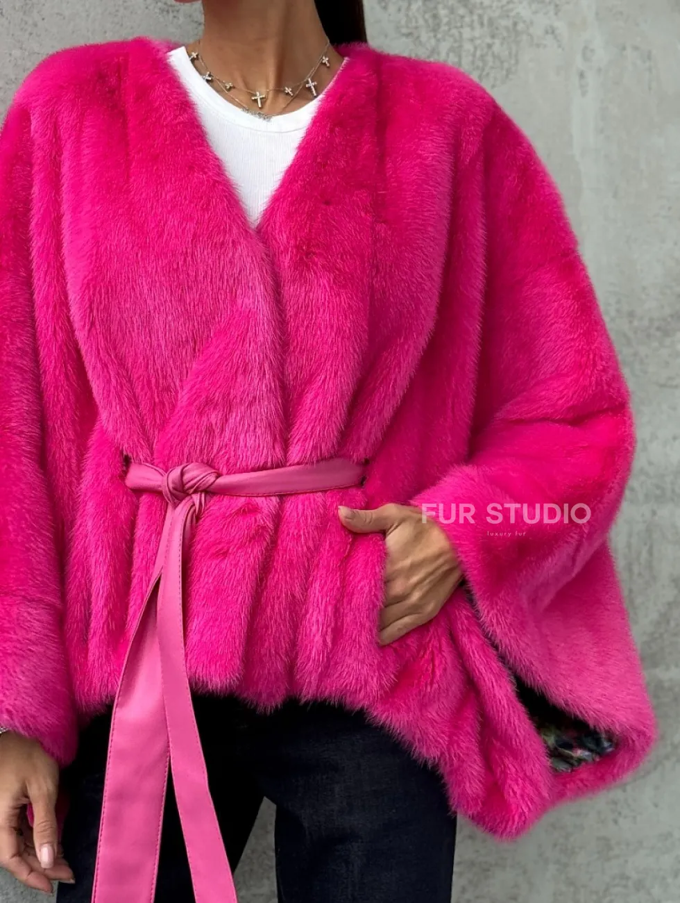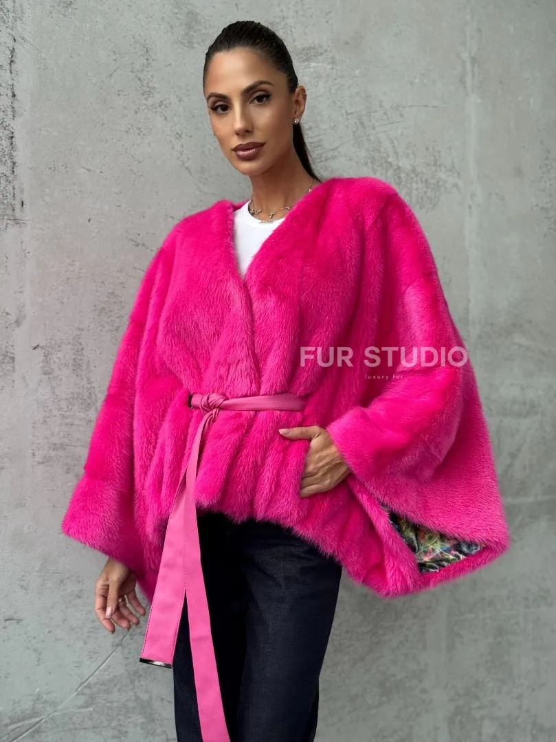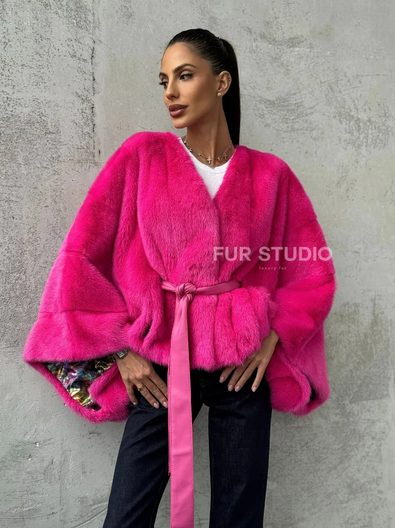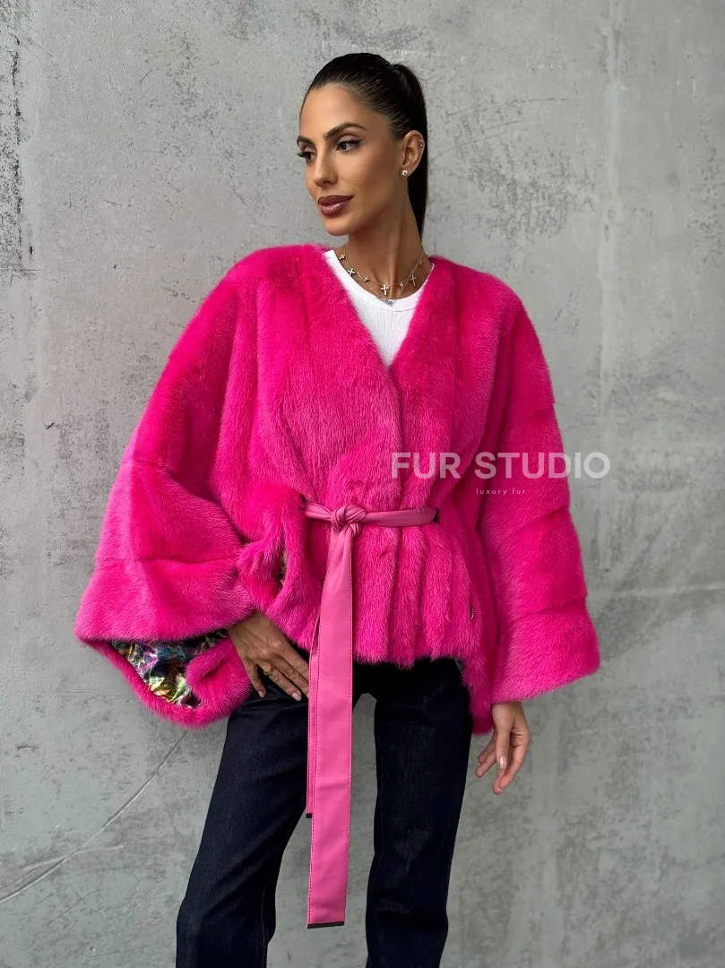 Мех данной шубы аукционная норка, цвет розовый. Предлагается в размерах от 40 до 58 (oversize). Длина модели 50-55 см, что выгодно подчеркивает фигуру девушек. Эта модель идеально подойдет для девушек и женщин, предпочитающих роскошные натуральные меха.