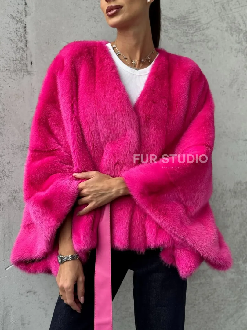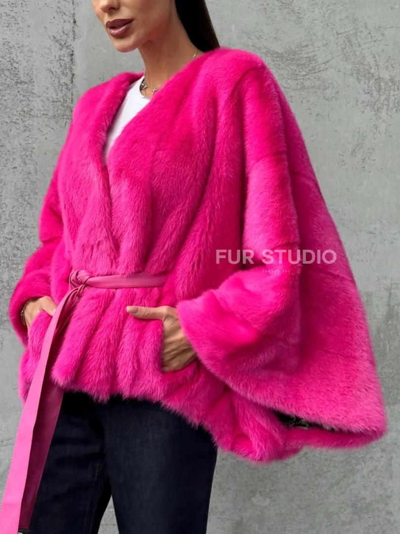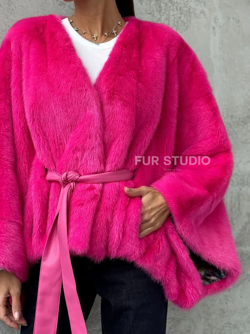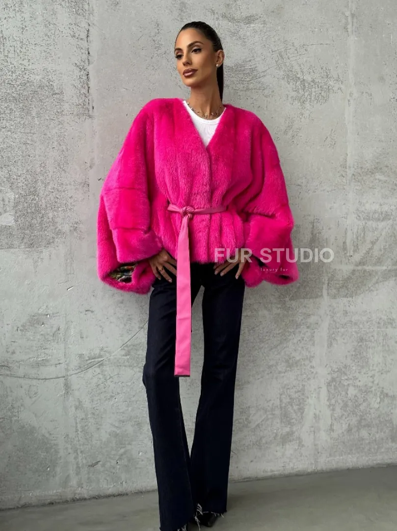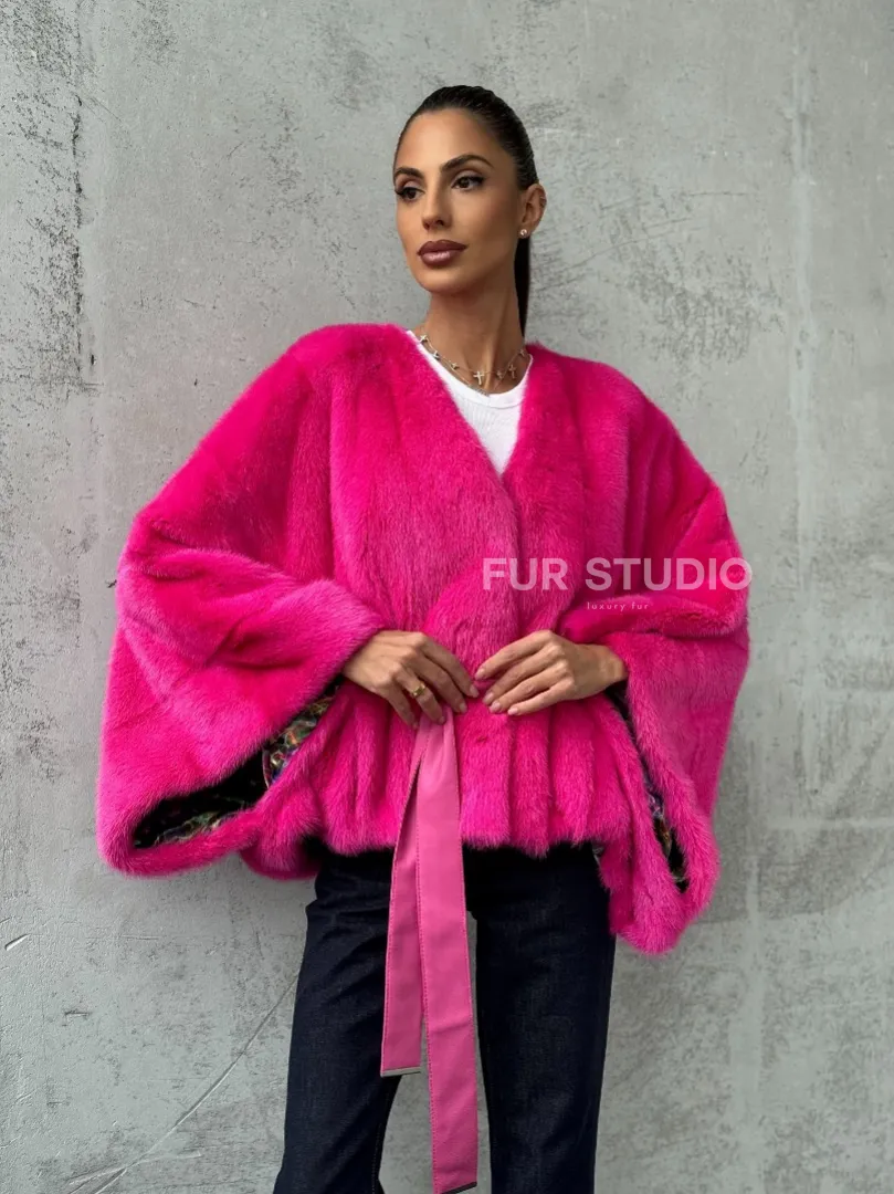 Мех данной шубы аукционная норка, цвет розовый. Предлагается в размерах от 40 до 58 (oversize). Длина модели 50-55 см, что выгодно подчеркивает фигуру девушек. Эта модель идеально подойдет для девушек и женщин, предпочитающих роскошные натуральные меха.