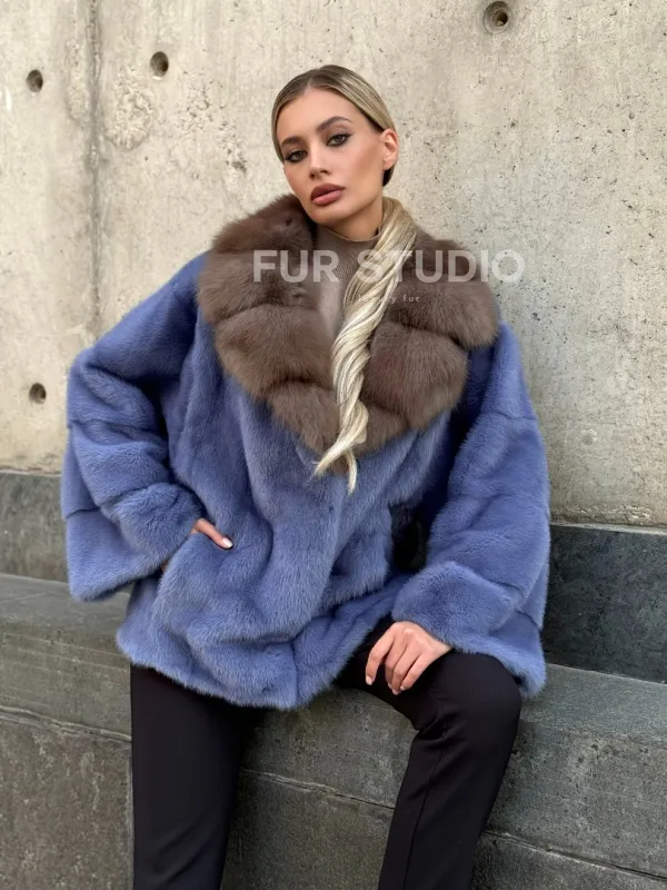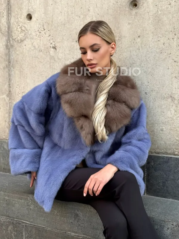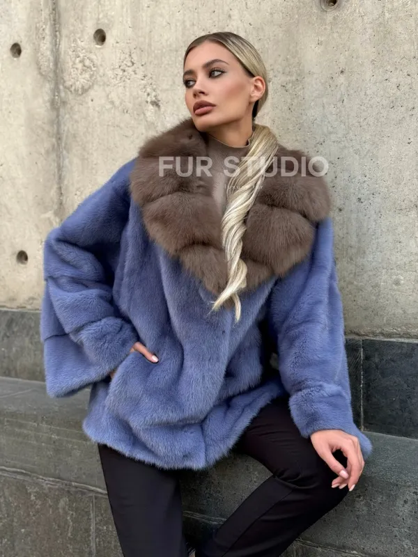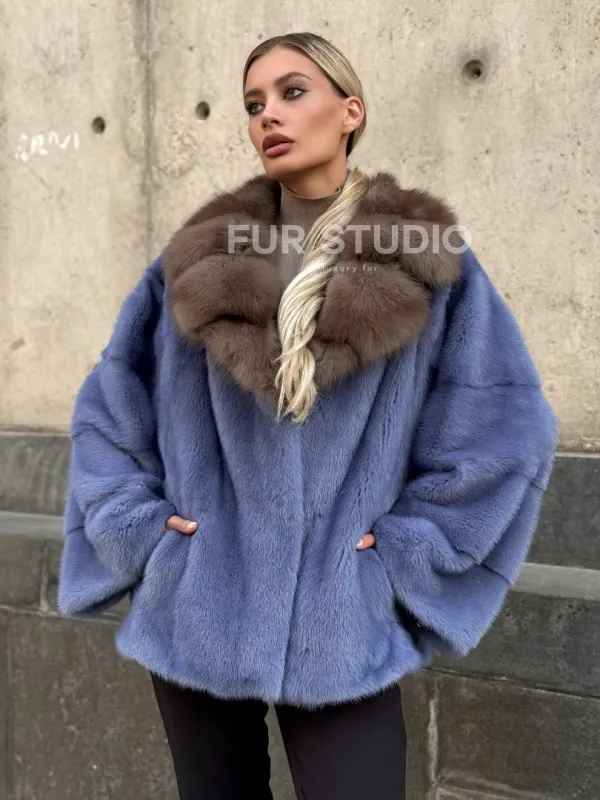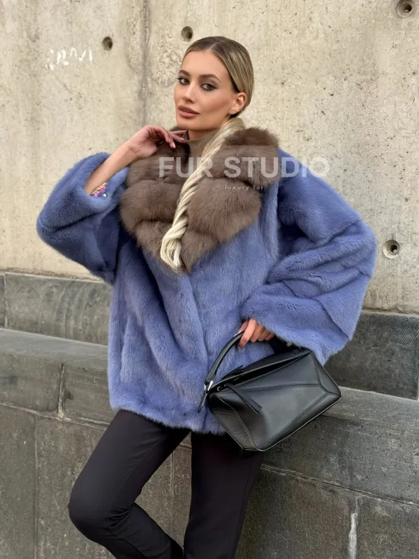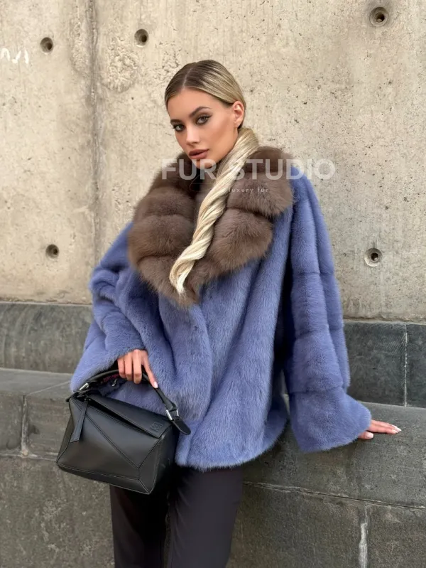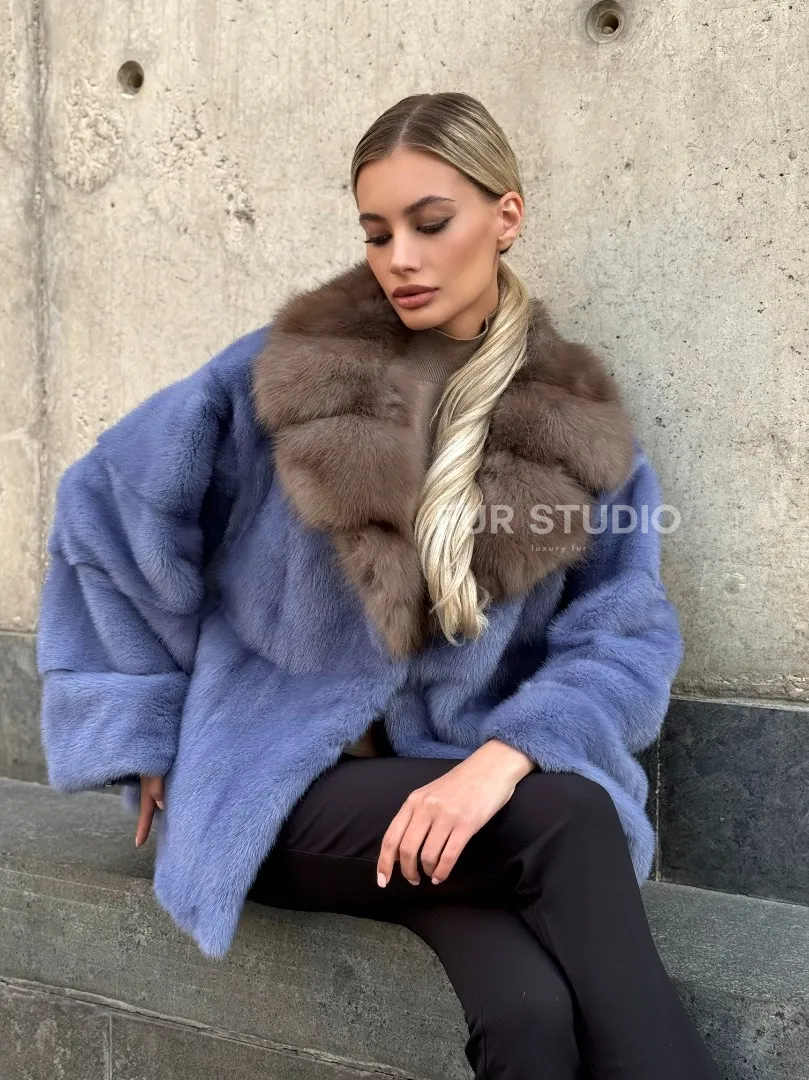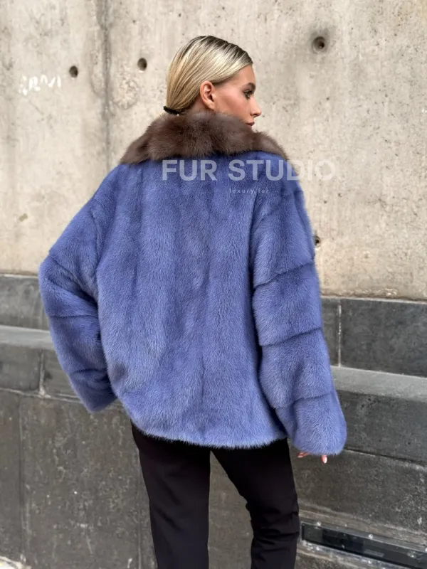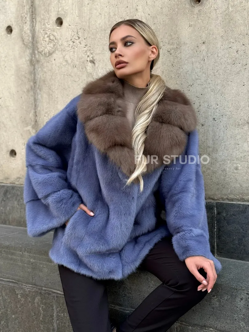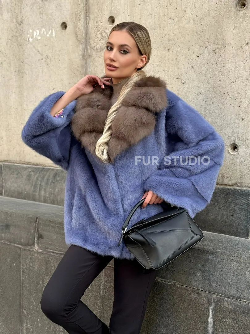 Мех данной шубы аукционная норка , цвет голубой. Предлагается в размерах от 42 до 50. Длина модели 55-60 см, что выгодно подчеркивает фигуру девушек. Эта модель идеально подойдет для девушек и женщин, предпочитающих роскошные натуральные меха.
