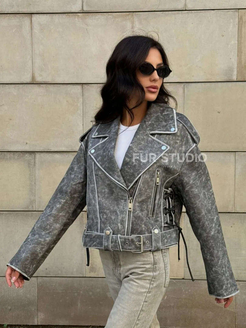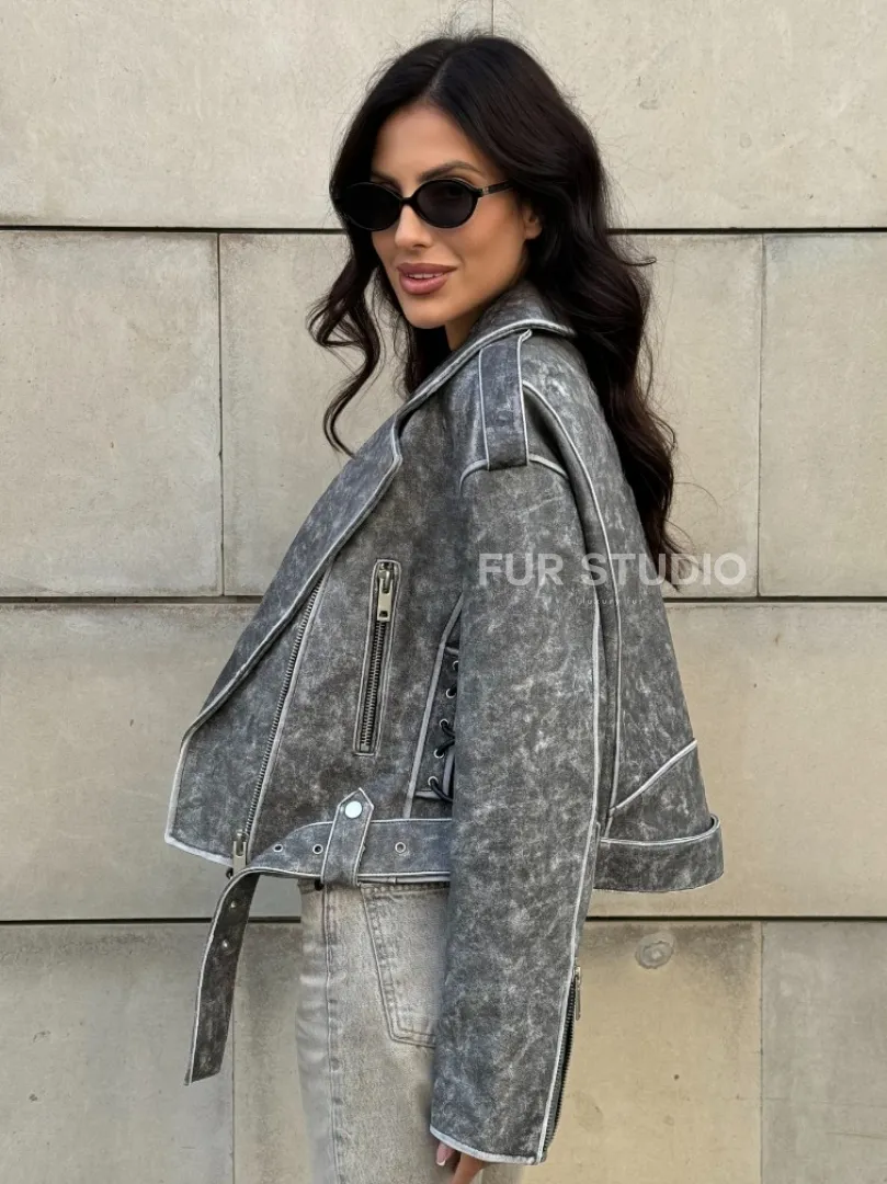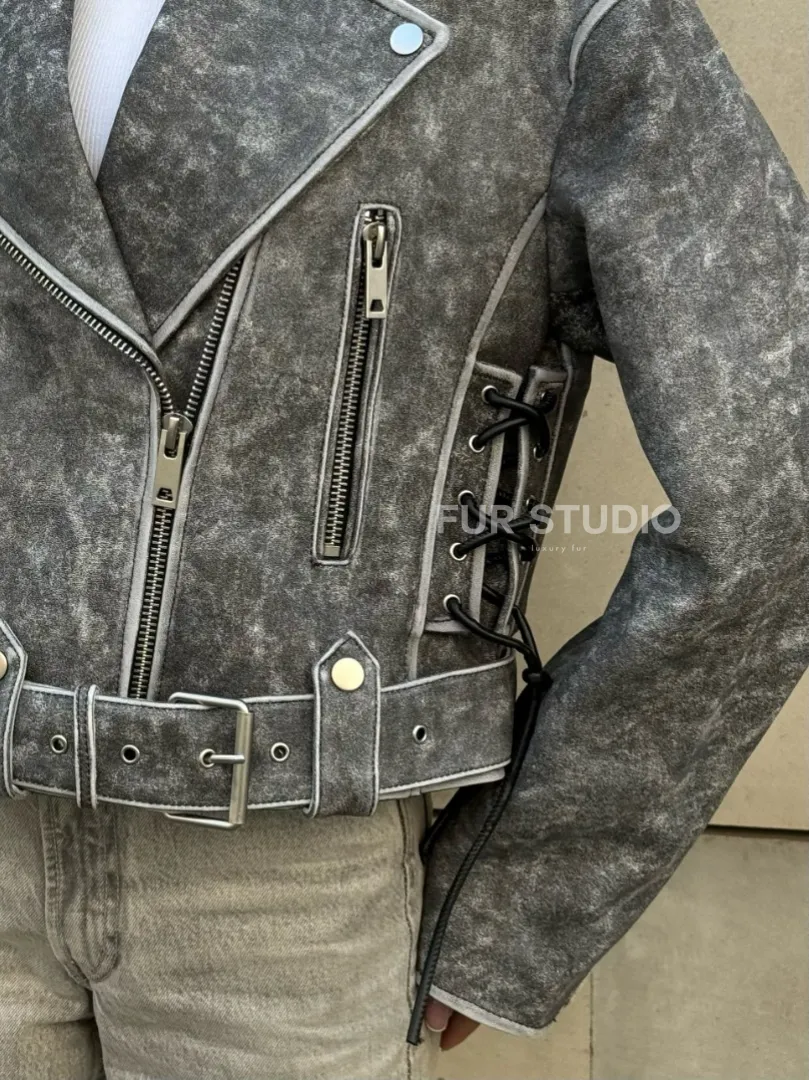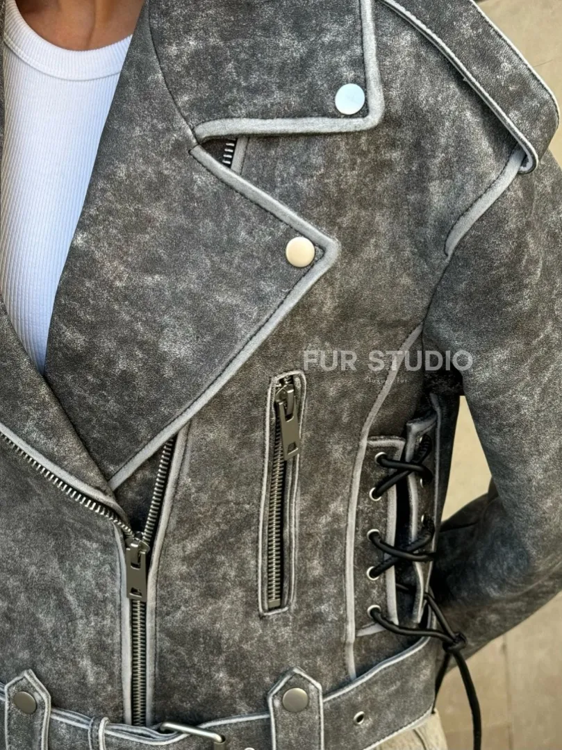 Косуха из натуральной кожи Vintage со шнуровкой - цвет серый доступна для покупки в нашем шоуруме Furs Studio в Москве, где также предоставляется удобная доставка во все города России.