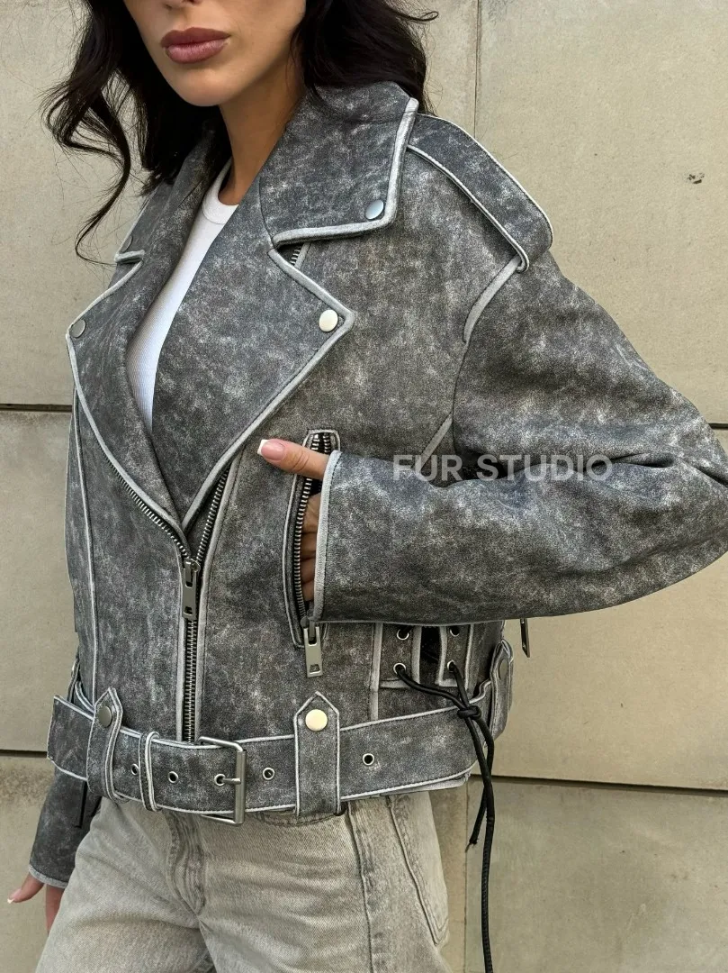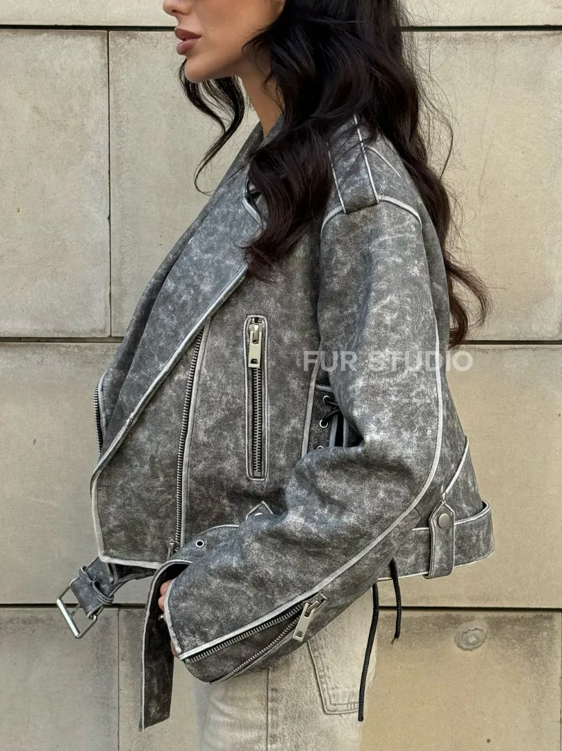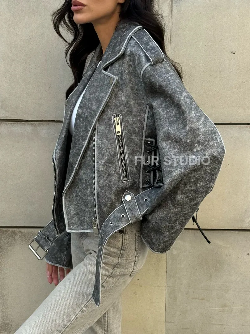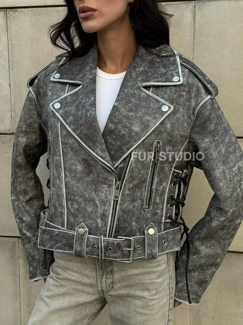 Косуха из натуральной кожи Vintage со шнуровкой - цвет серый доступна для покупки в нашем шоуруме Furs Studio в Москве, где также предоставляется удобная доставка во все города России.