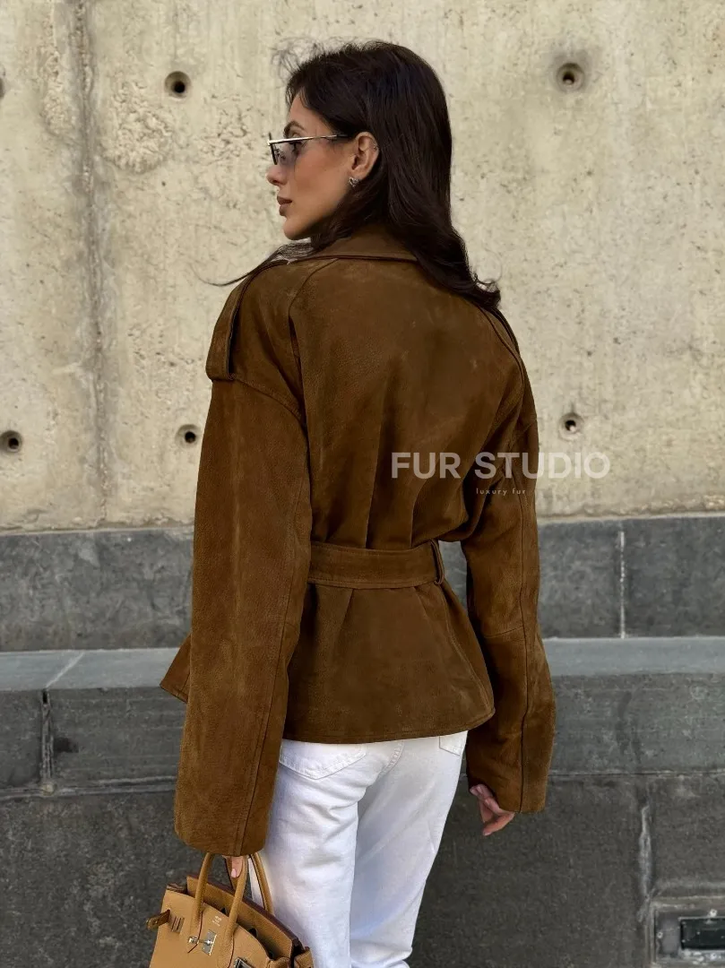Косуха из натуральной замши под пояс "весна 2026" доступна для покупки в нашем шоуруме Furs Studio в Москве, где также предоставляется удобная доставка во все города России.