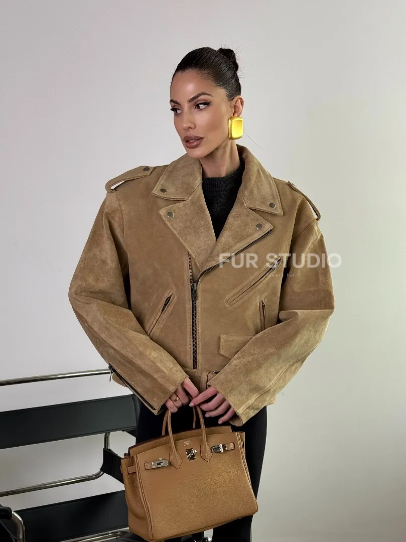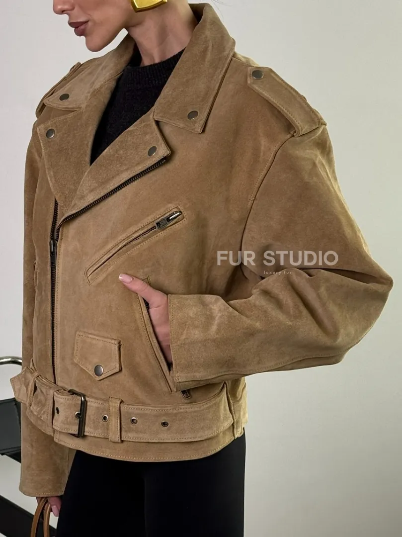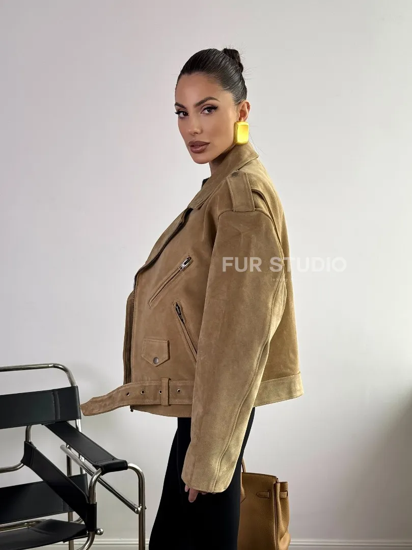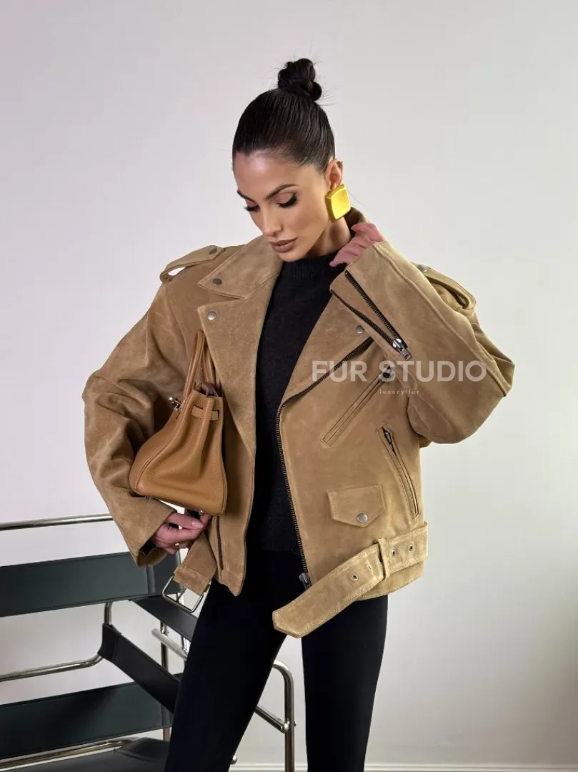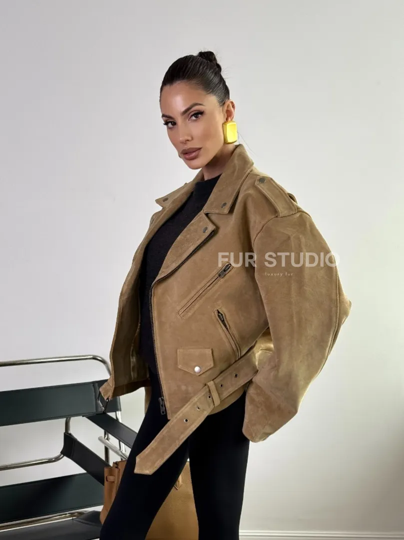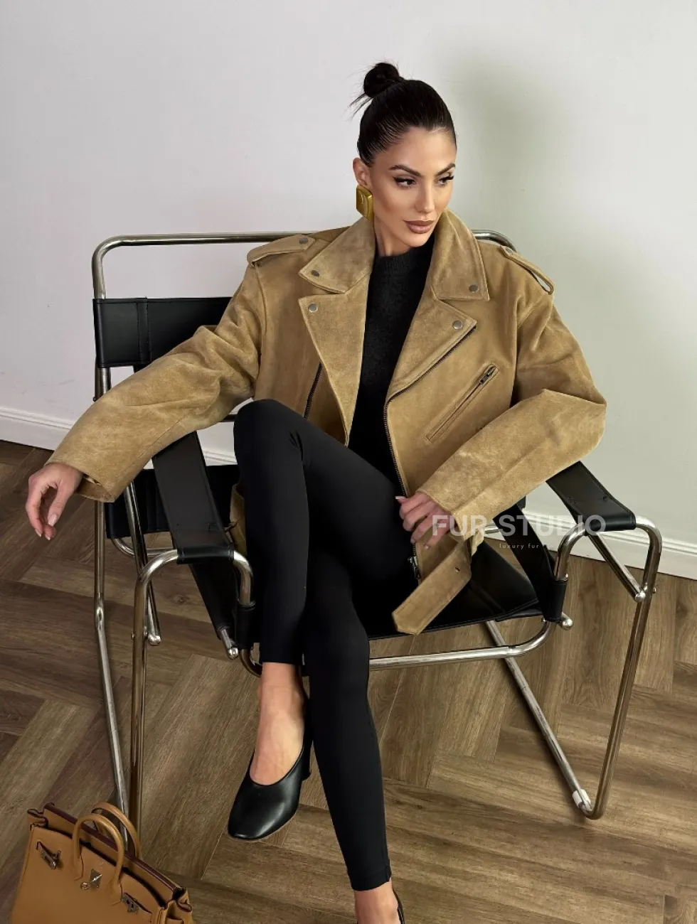 Косуха «Прямой Оверсайз» из мягкой кожи (замши) Camel доступна для покупки в нашем шоуруме Furs Studio в Москве, где также предоставляется удобная доставка во все города России.