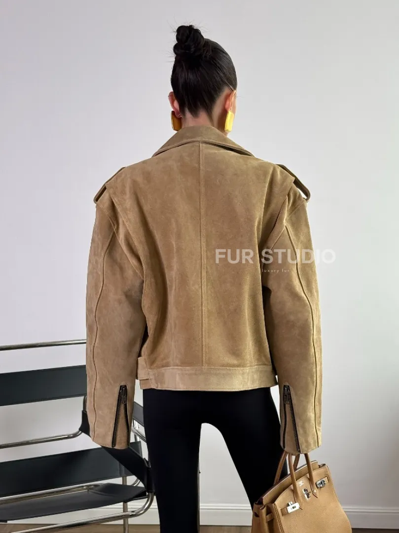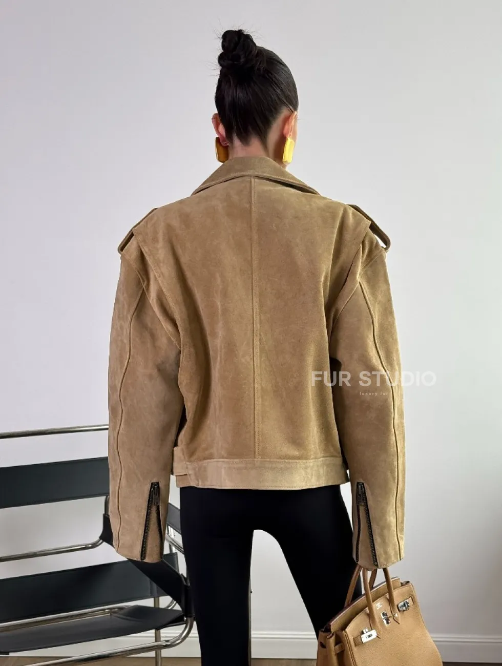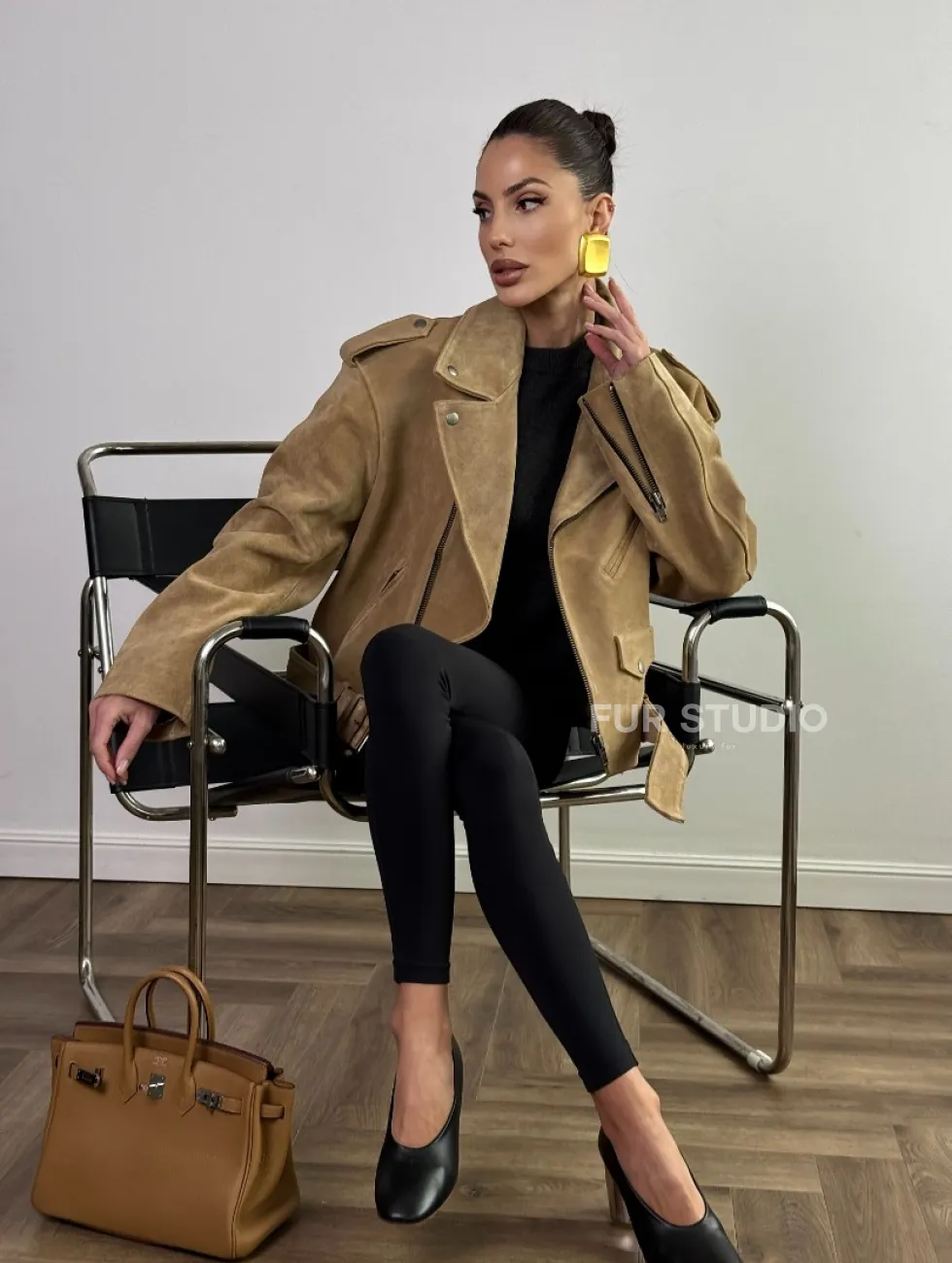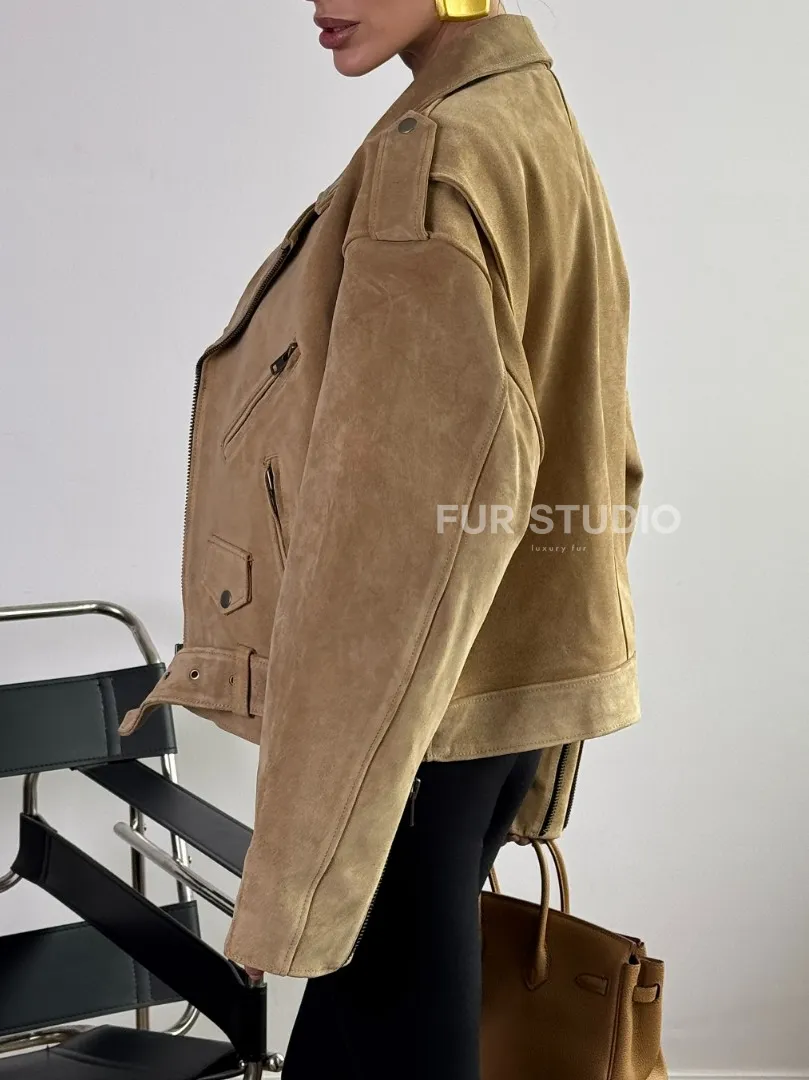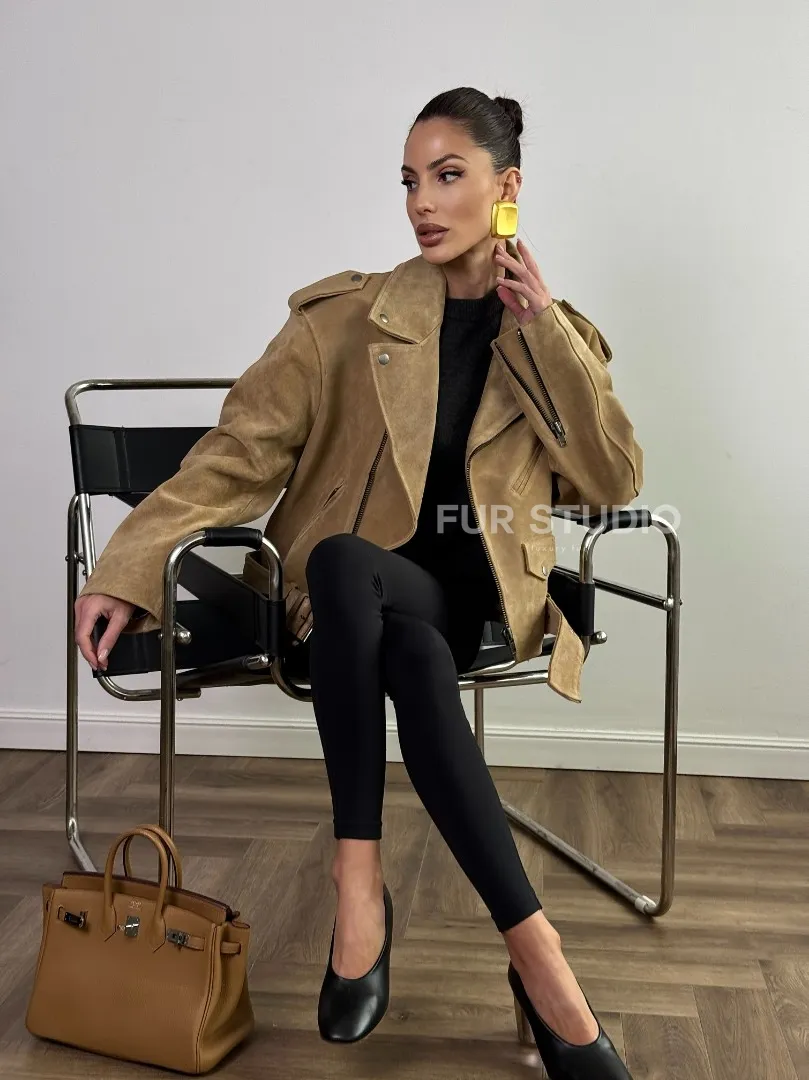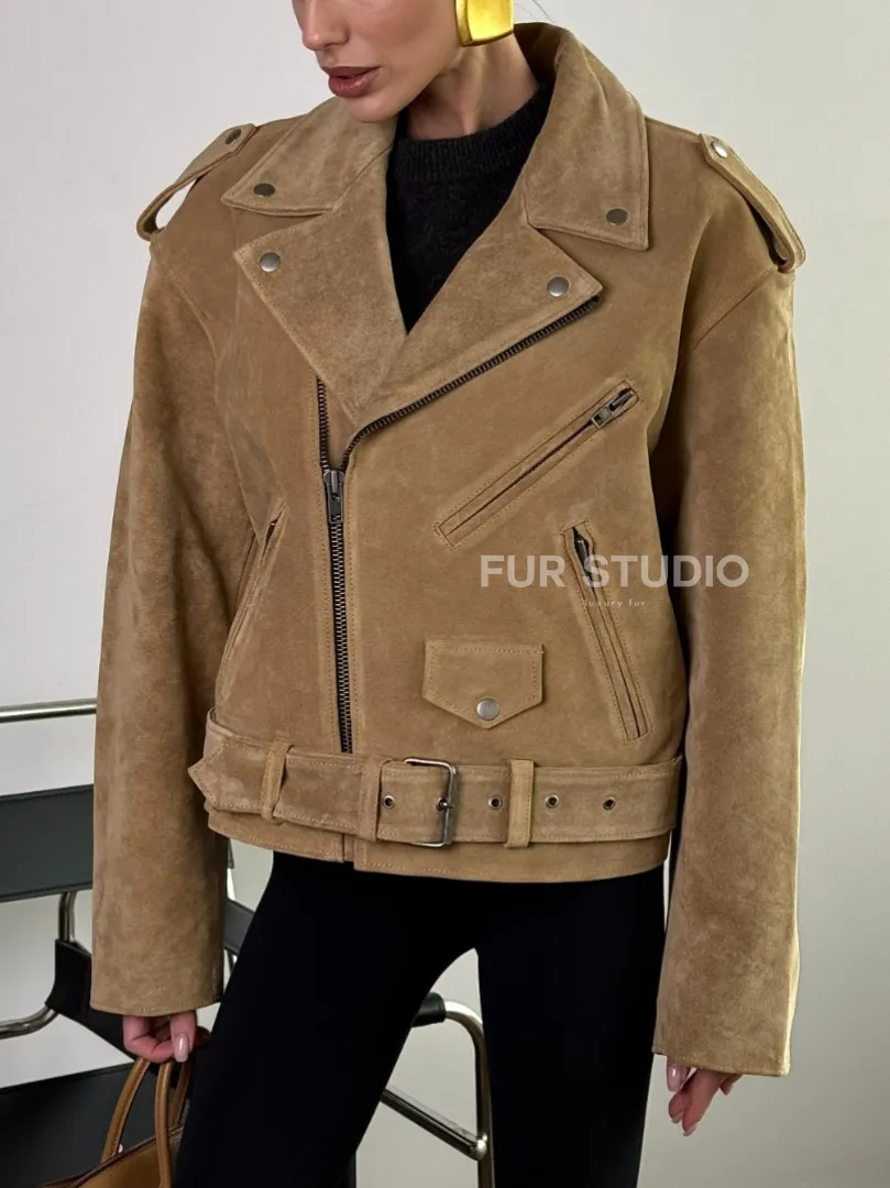 Косуха «Прямой Оверсайз» из мягкой кожи (замши) Camel доступна для покупки в нашем шоуруме Furs Studio в Москве, где также предоставляется удобная доставка во все города России.