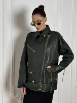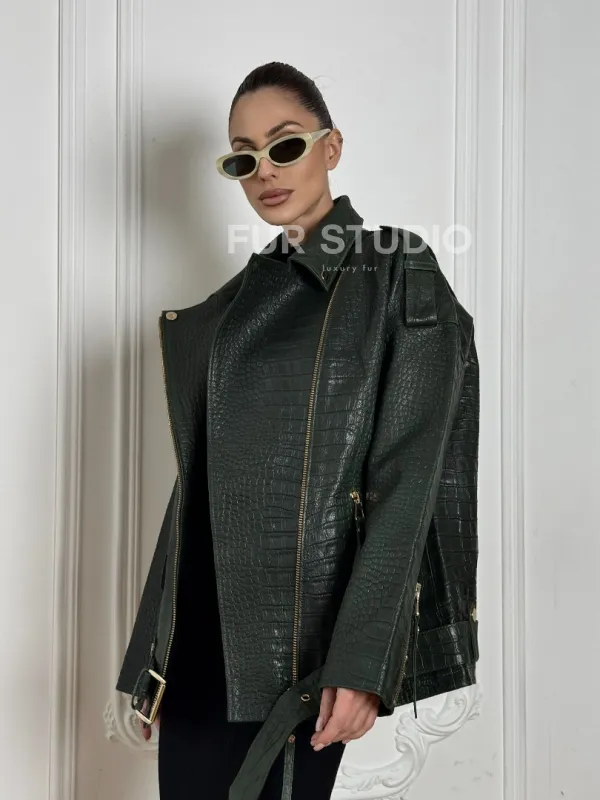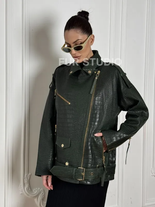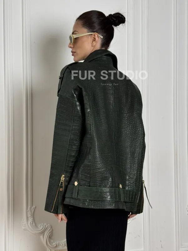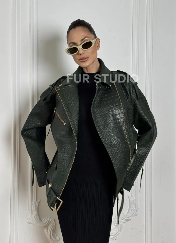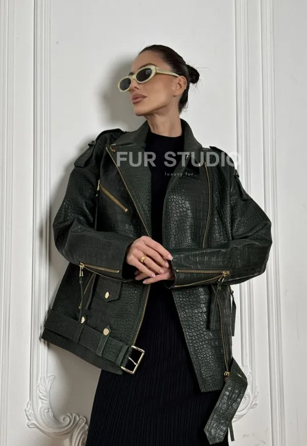 Куртка - косуха из натуральной кожи «CROCO» Dark green доступна для покупки в нашем шоуруме Furs Studio в Москве, где также предоставляется удобная доставка во все города России.