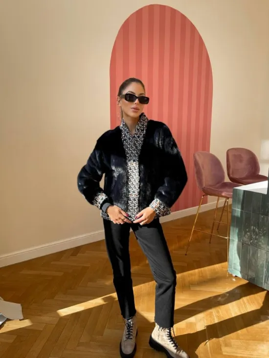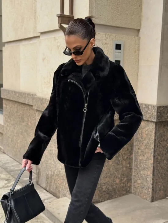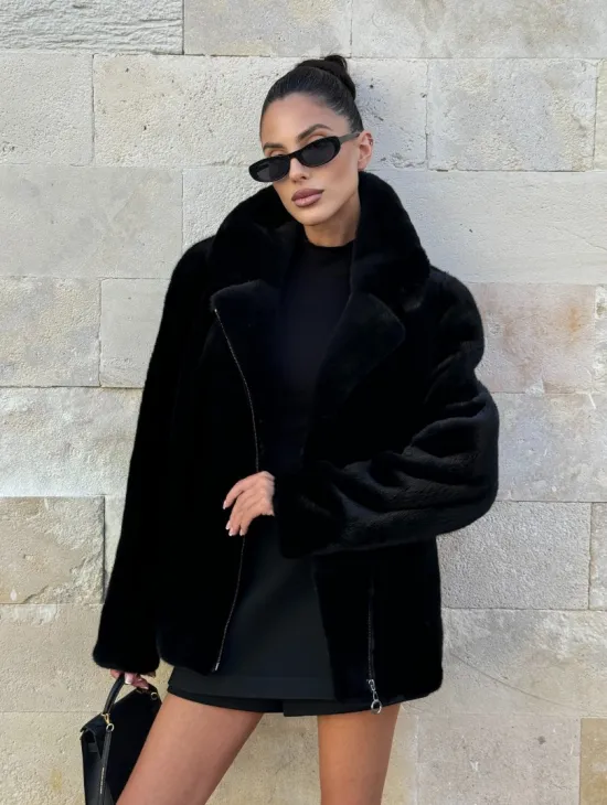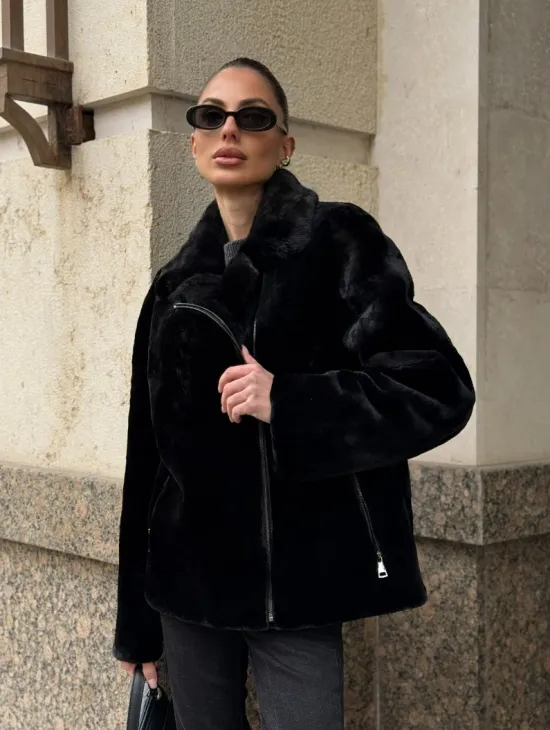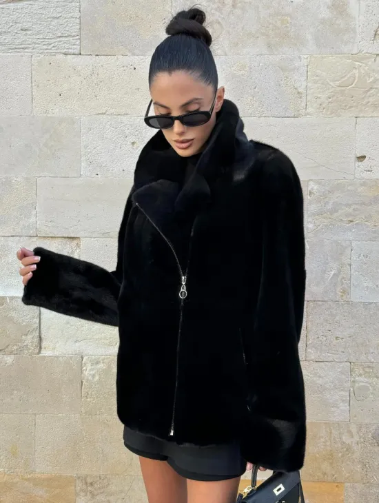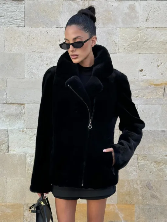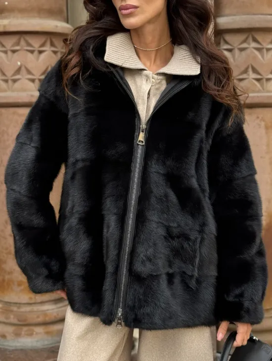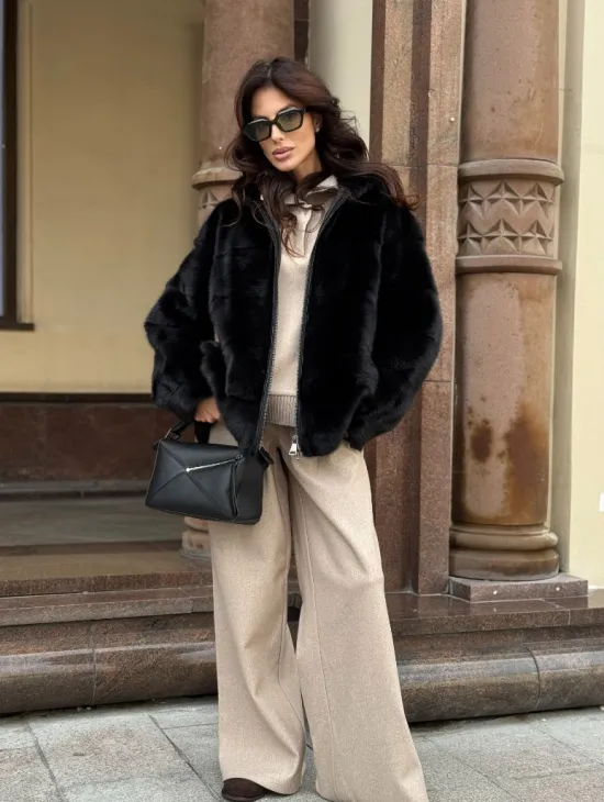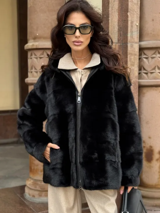 Материал выбранной модели — аукционная норка, доступна в цвете черный. Куртка предлагается в разнообразии размеров, от S до XL, а ее длина составляет 55-60 см, что выигрышно подчеркивает вашу фигуру. Этот вариант идеально подходит для тех, кто ценит роскошь и утонченность натуральных материалов.