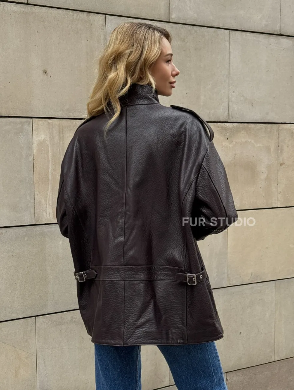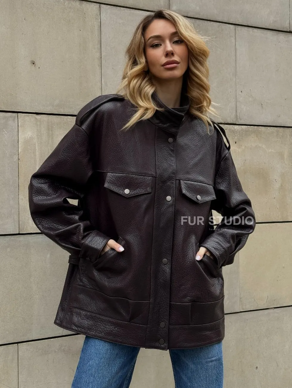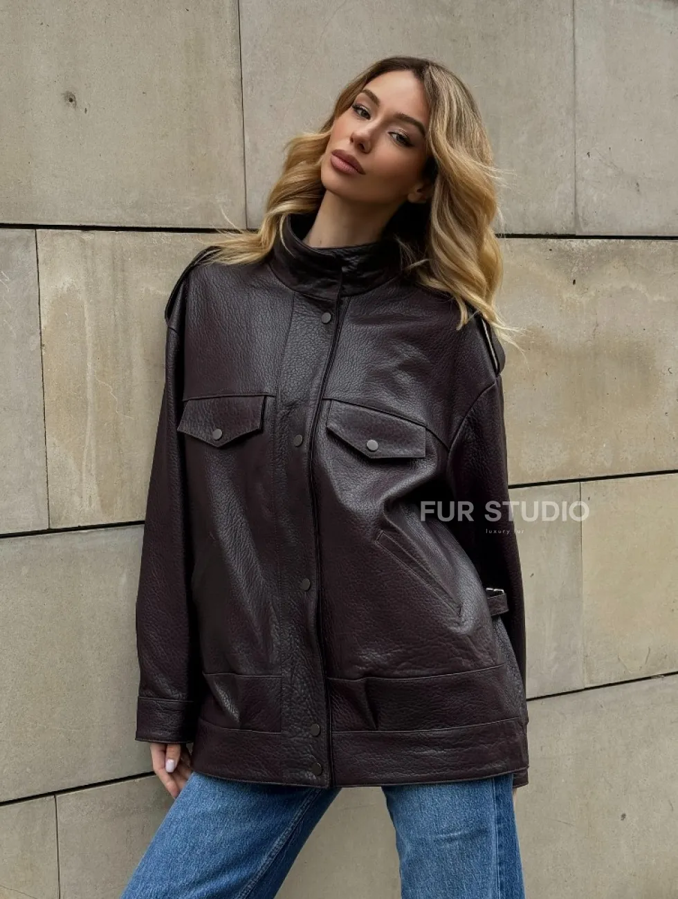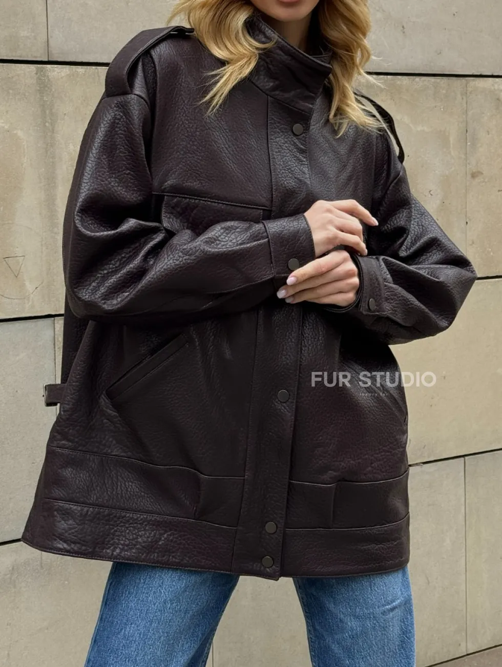 Кутка - бомбер оверсайз из натуральной кожи в стиле Y2K доступна для покупки в нашем шоуруме Furs Studio в Москве, где также предоставляется удобная доставка во все города России.