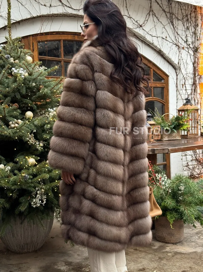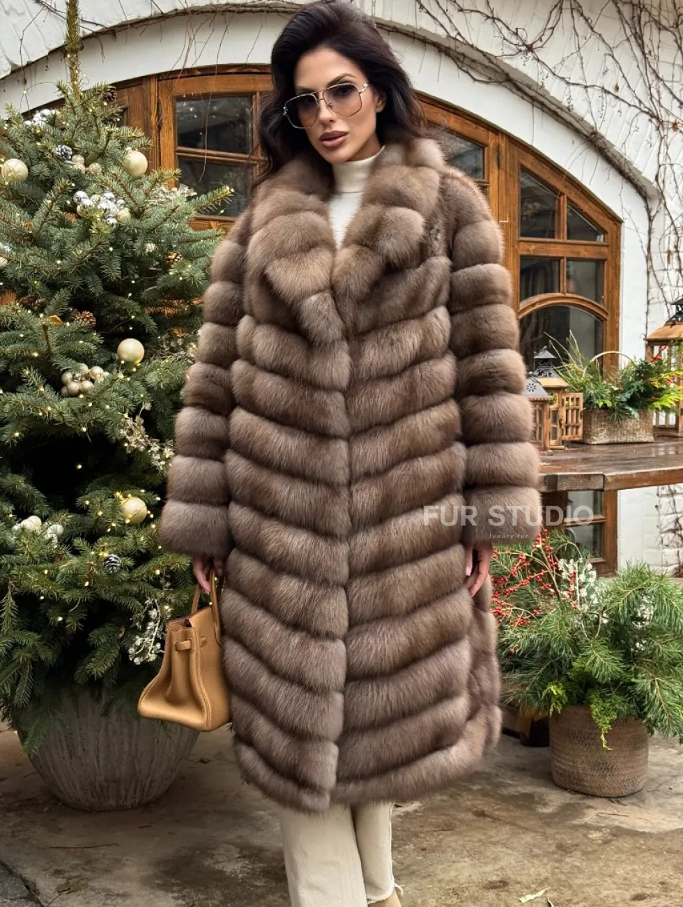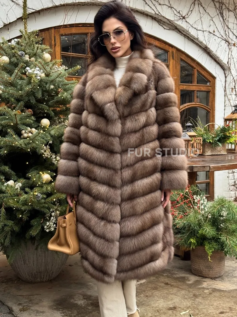 Мех данной шубы лесная куница, цвет натуральный. Предлагается в размерах от 42 до 50. Длина модели 105-110 см, что выгодно подчеркивает фигуру девушек. Эта модель идеально подойдет для девушек и женщин, предпочитающих роскошные натуральные меха.
