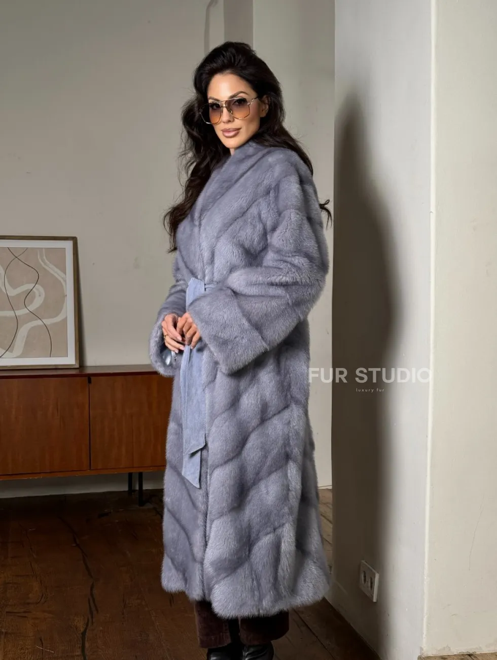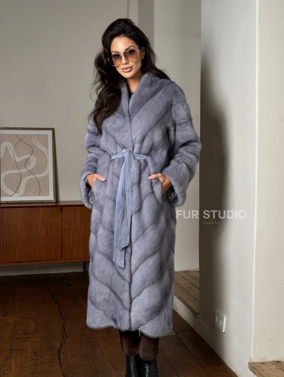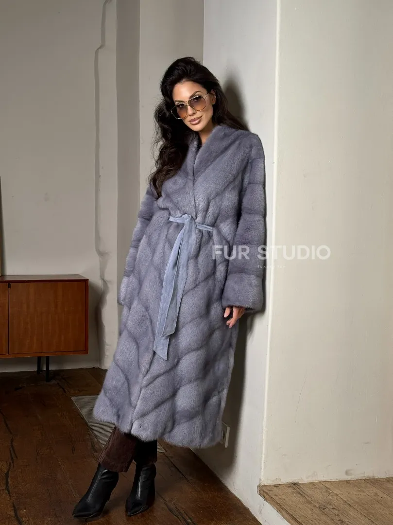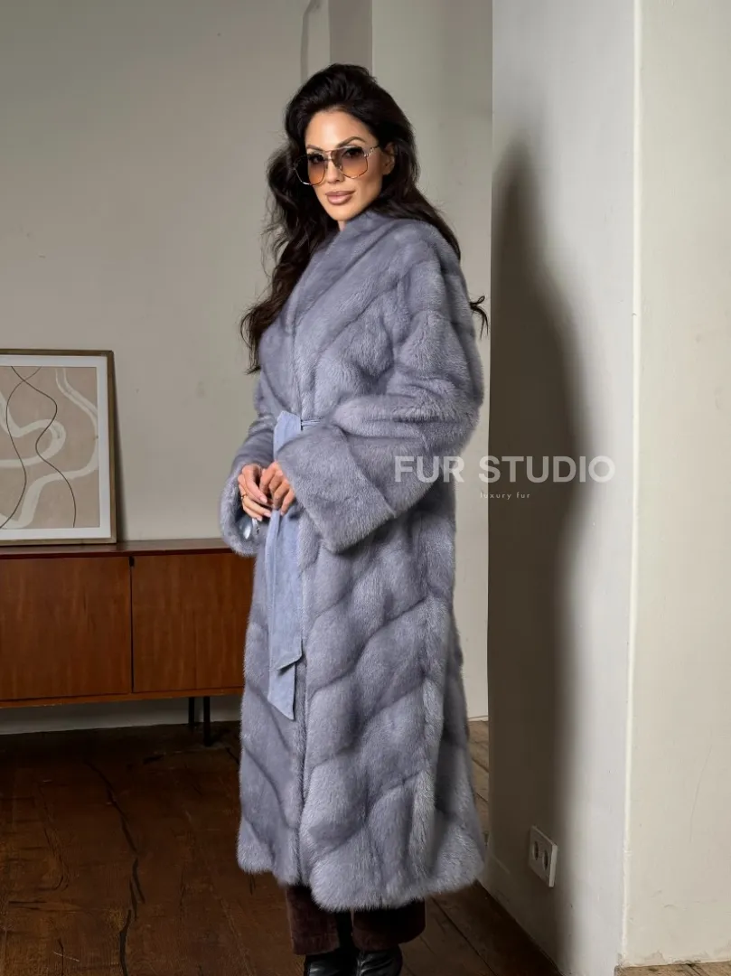 Мех данной шубы аукционная норка, цвет голубой. Предлагается в размерах от 42 до 48. Длина модели 115-120 см, что выгодно подчеркивает фигуру девушек. Эта модель идеально подойдет для девушек и женщин, предпочитающих роскошные натуральные меха.