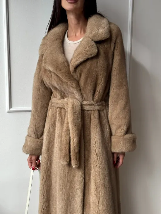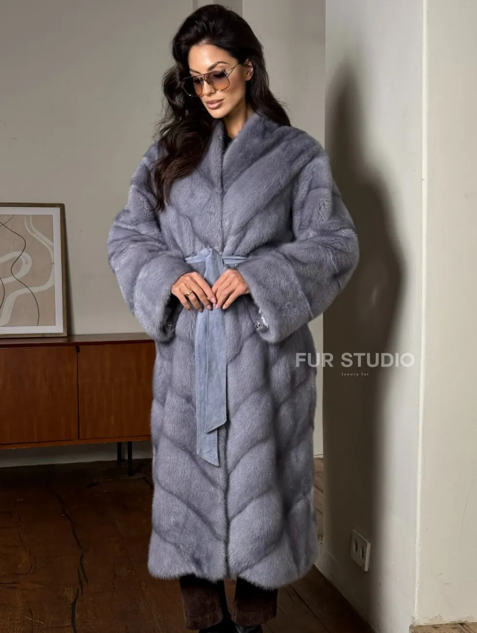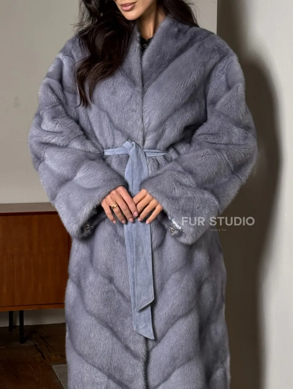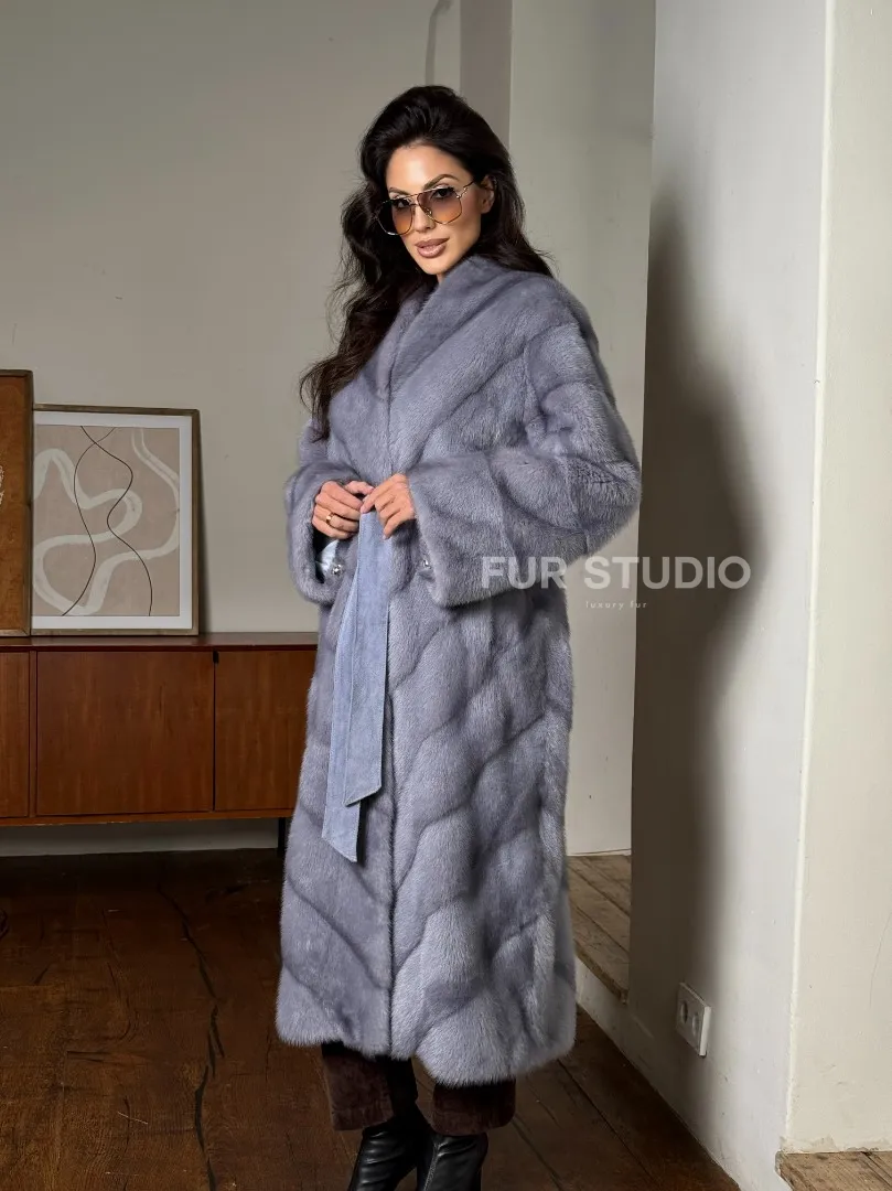 Мех данной шубы аукционная норка, цвет голубой. Предлагается в размерах от 42 до 48. Длина модели 115-120 см, что выгодно подчеркивает фигуру девушек. Эта модель идеально подойдет для девушек и женщин, предпочитающих роскошные натуральные меха.