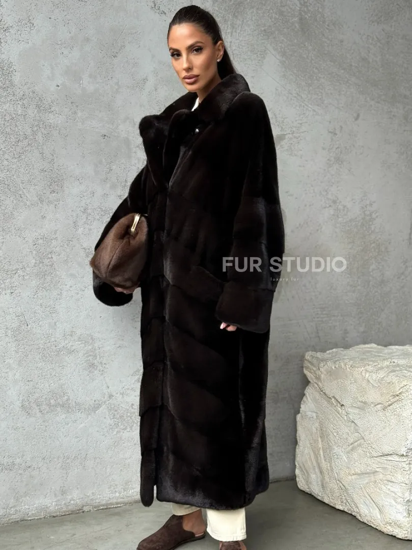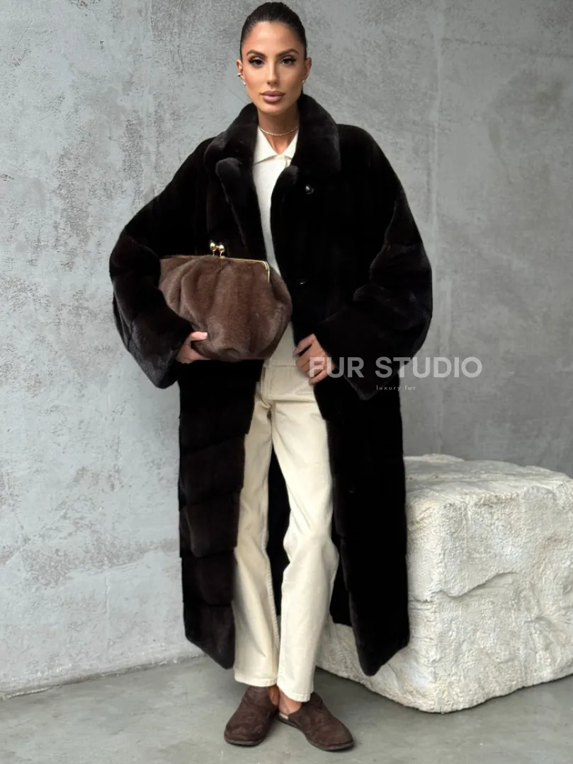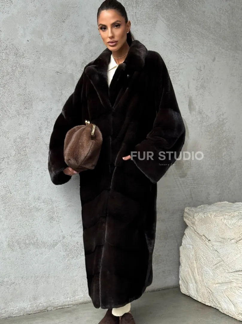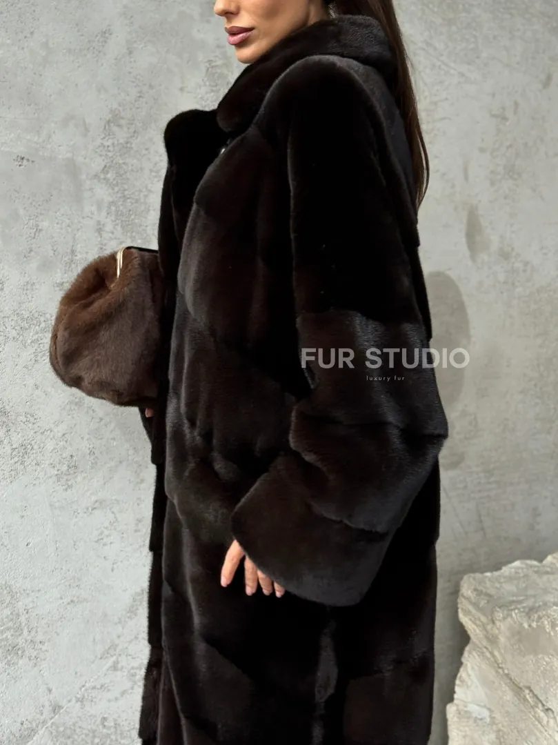 Мех данной шубы аукционная норка, цвет коричневый. Предлагается в размерах от 42 до 46. Длина модели 115-120 см, что выгодно подчеркивает фигуру девушек. Эта модель идеально подойдет для девушек и женщин, предпочитающих роскошные натуральные меха.