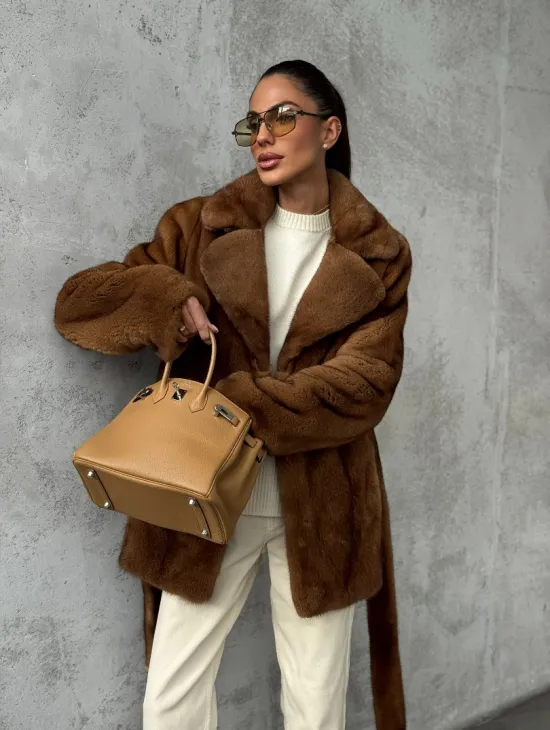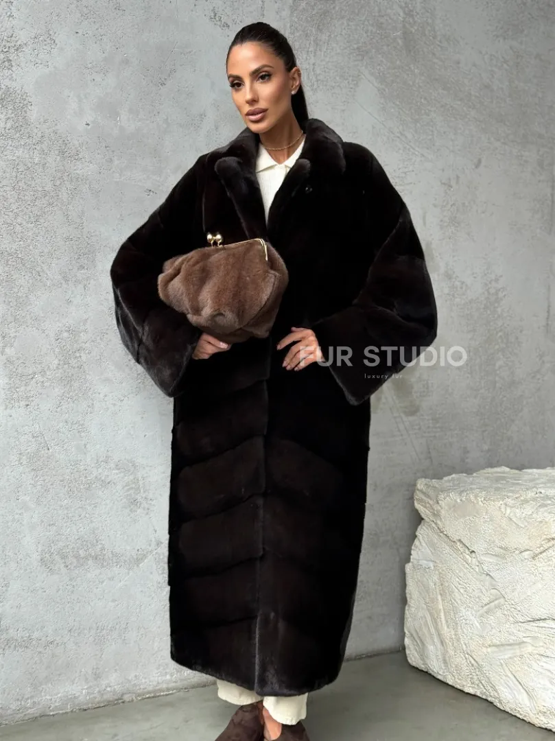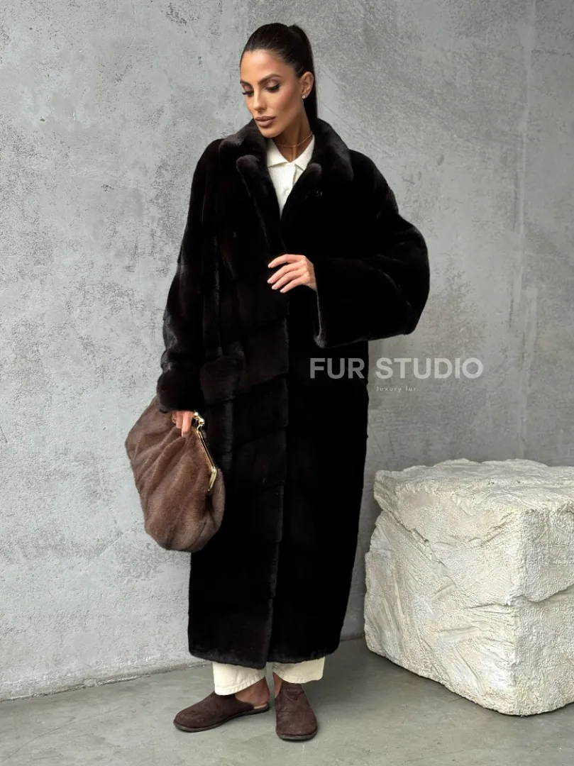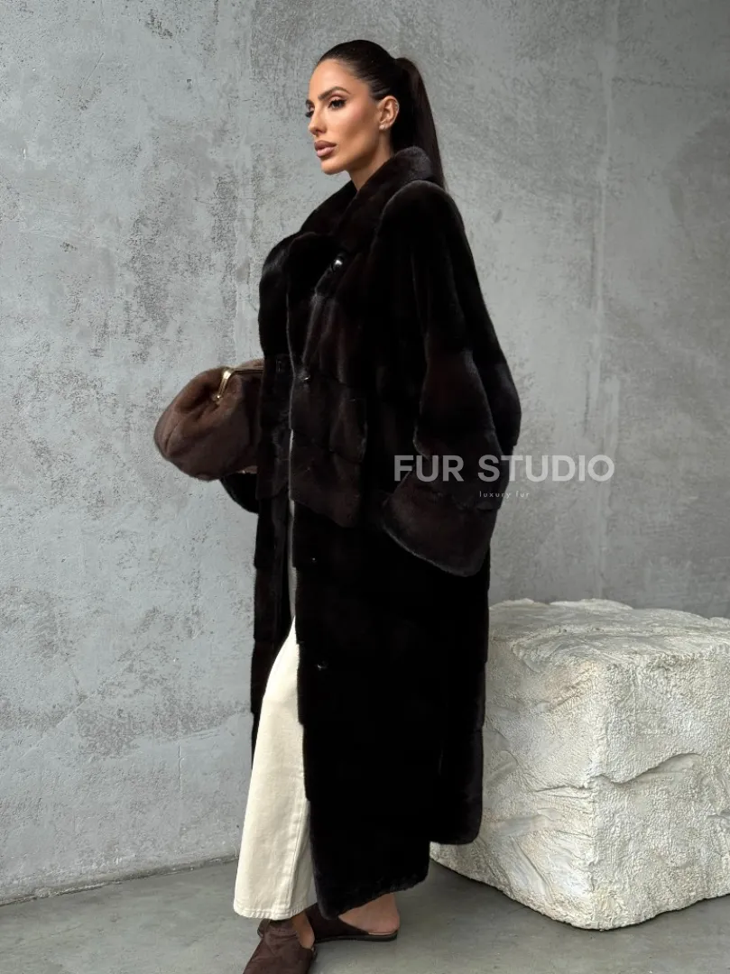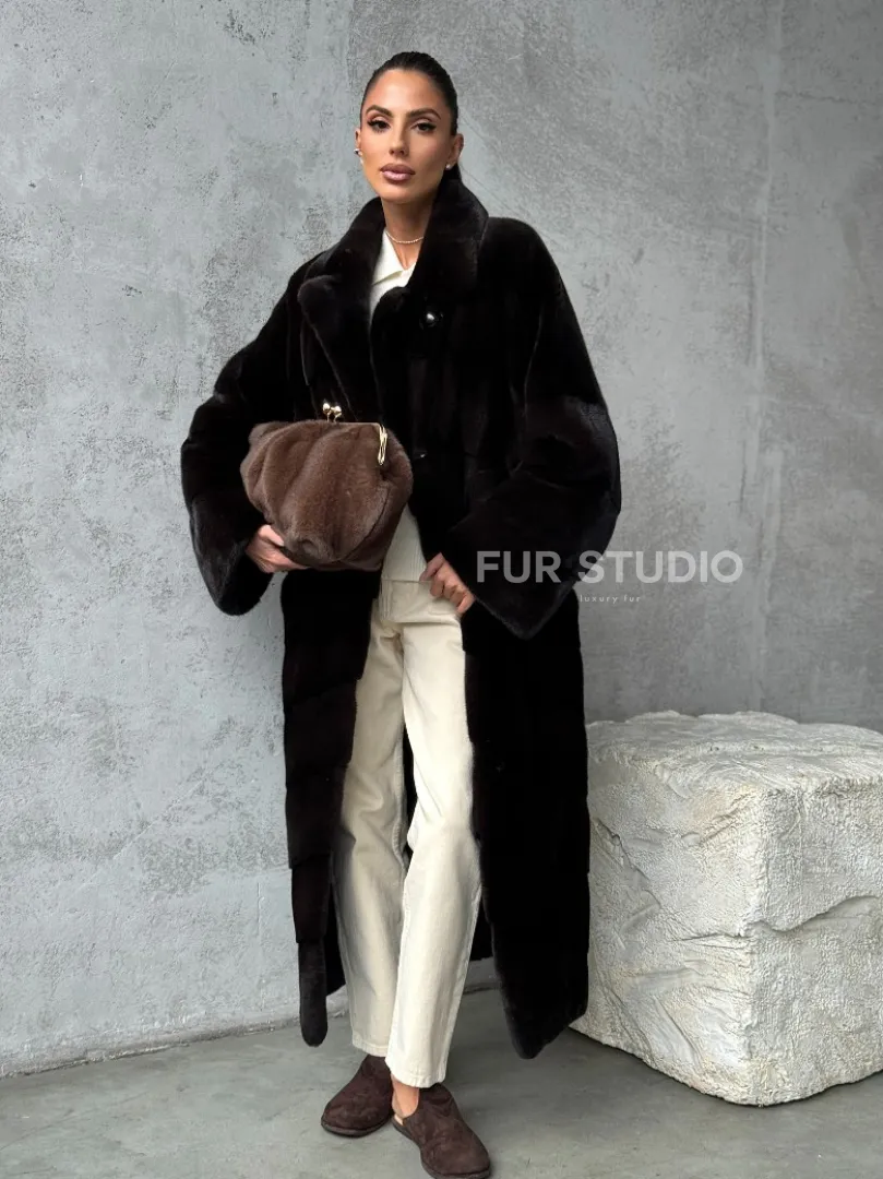 Мех данной шубы аукционная норка, цвет коричневый. Предлагается в размерах от 42 до 46. Длина модели 115-120 см, что выгодно подчеркивает фигуру девушек. Эта модель идеально подойдет для девушек и женщин, предпочитающих роскошные натуральные меха.