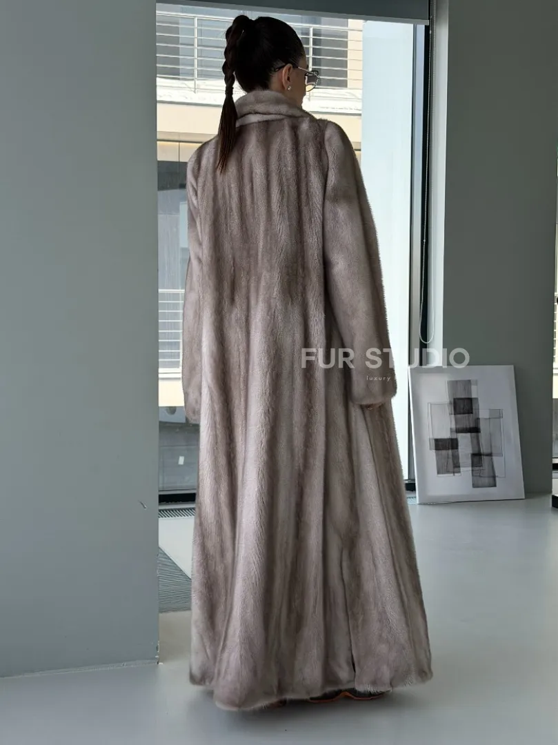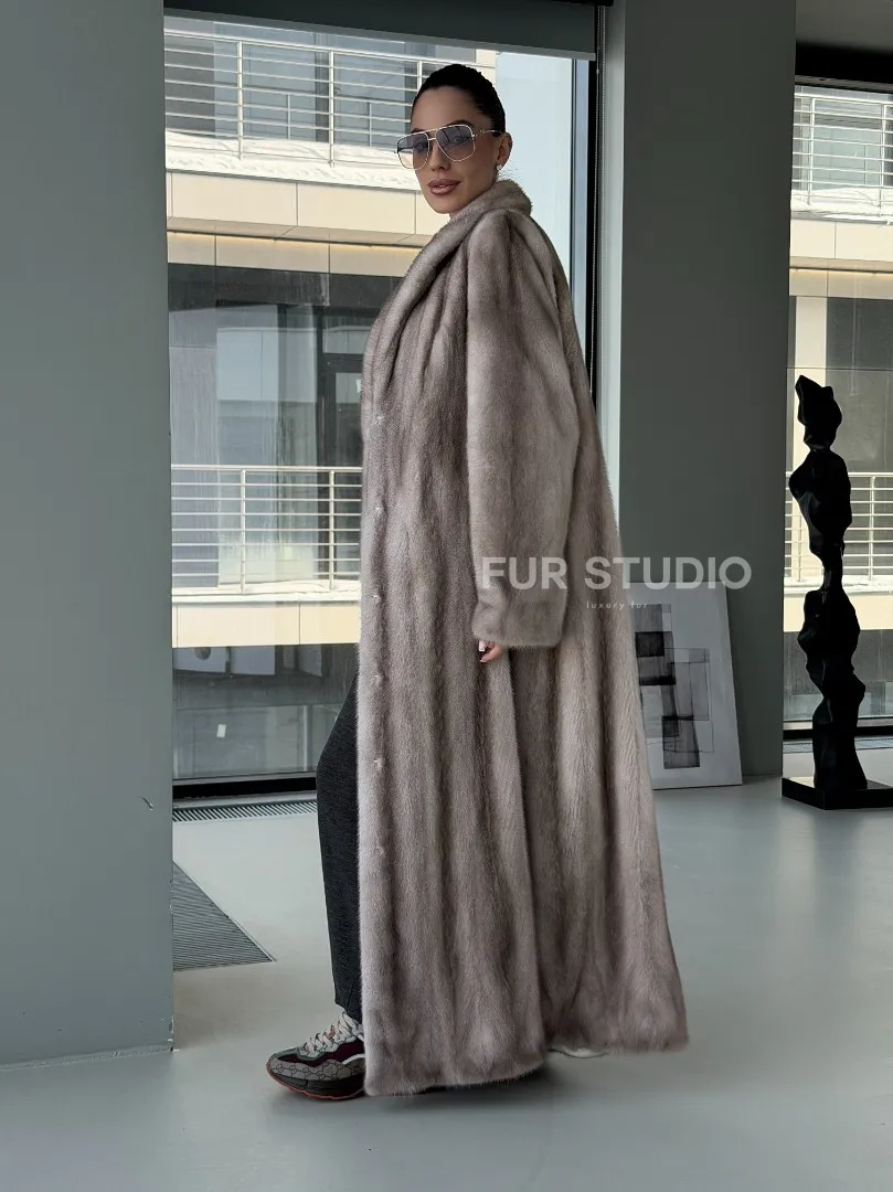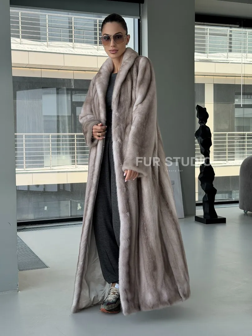 Мех данной шубы аукционная норка, цвет серый. Предлагается в размерах от 42 до 50. Длина модели 135-140 см, что выгодно подчеркивает фигуру девушек. Эта модель идеально подойдет для девушек и женщин, предпочитающих роскошные натуральные меха.