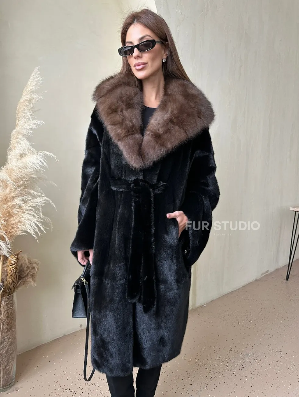 Мех данной шубы норка Blackglama , цвет черный. Предлагается в размерах от 42 до 54. Длина модели 105-110 см, что выгодно подчеркивает фигуру девушек. Эта модель идеально подойдет для девушек и женщин, предпочитающих роскошные натуральные меха.